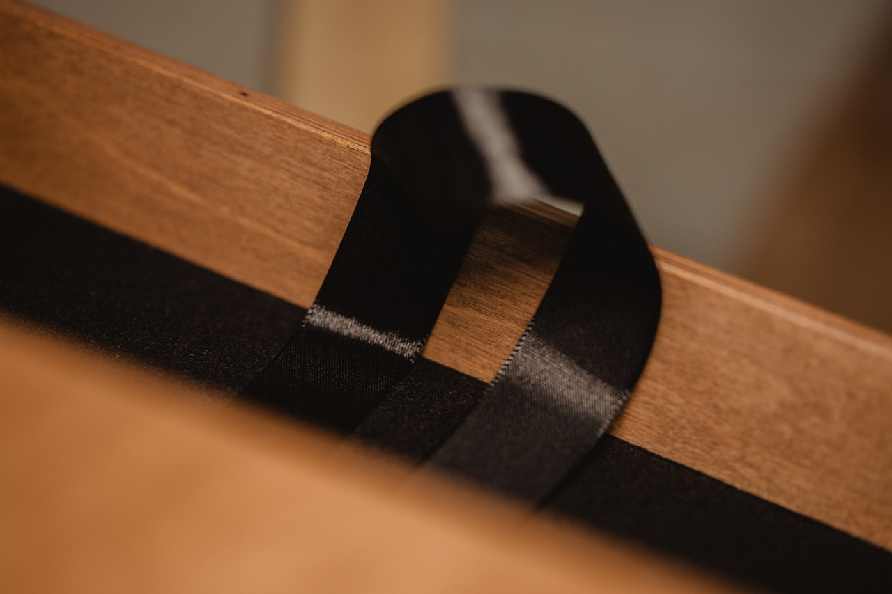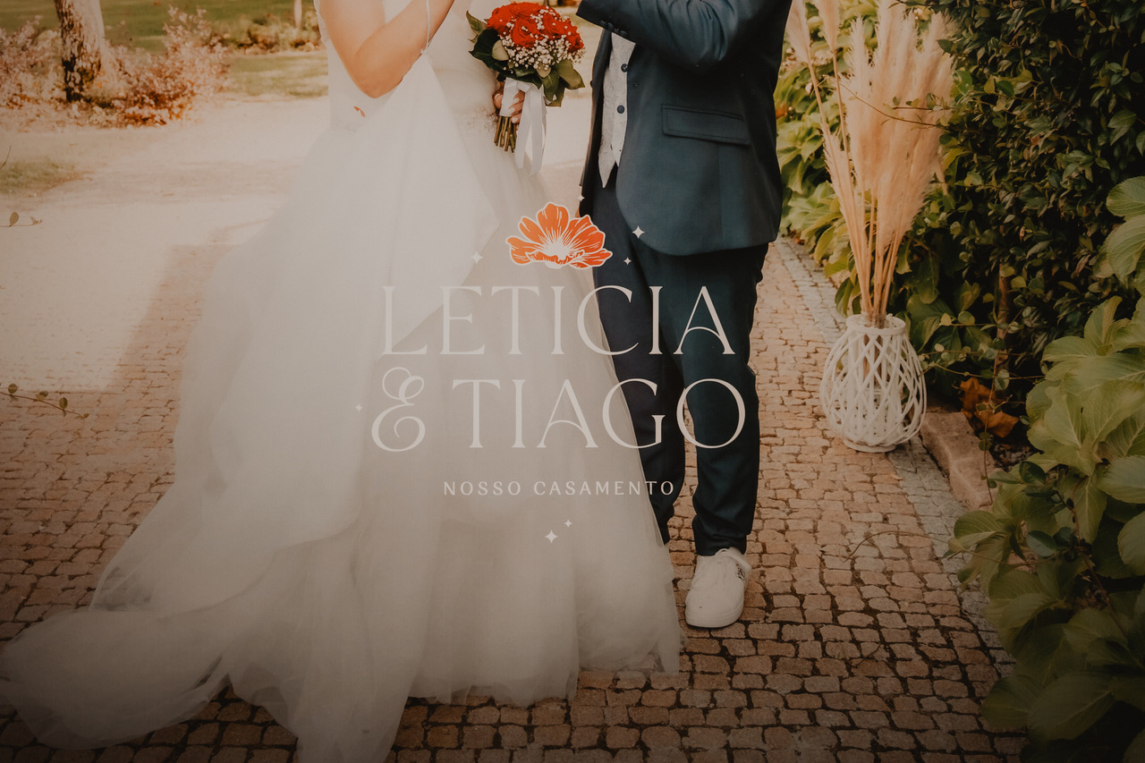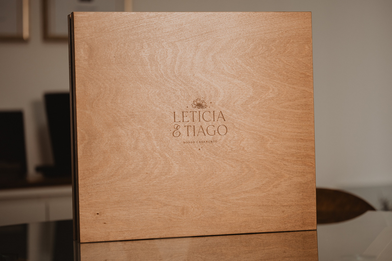 Caixa expositora em madeira de cor nogal. Gravação a laser no tampo da caixa com o monograma dos noivos. Interior forrado a veludo preto com fita preta. Compartimento no interior para pen usb.