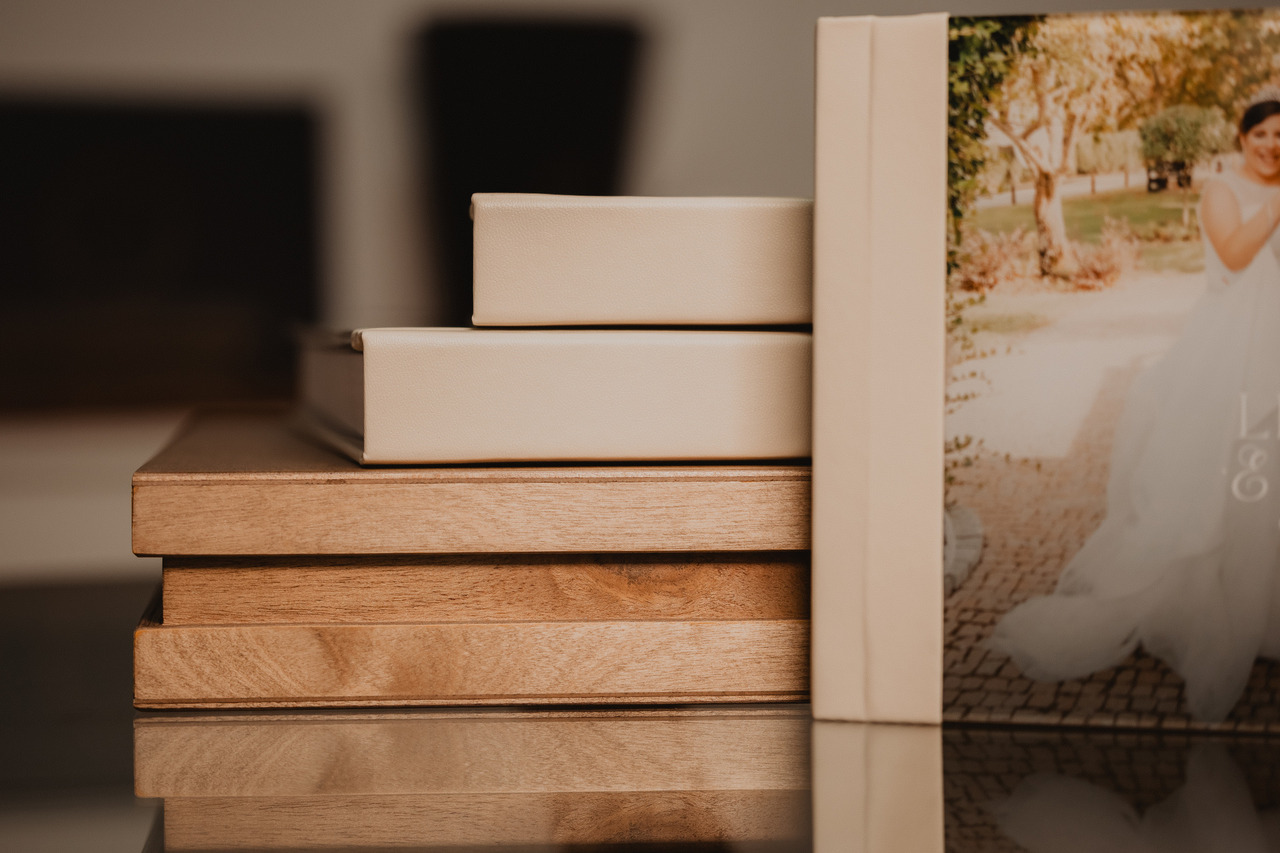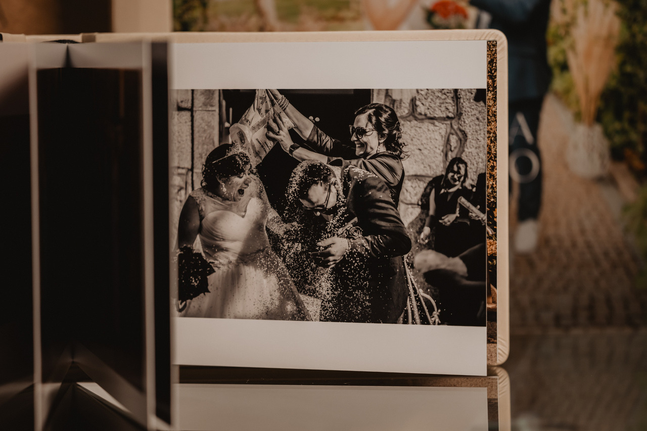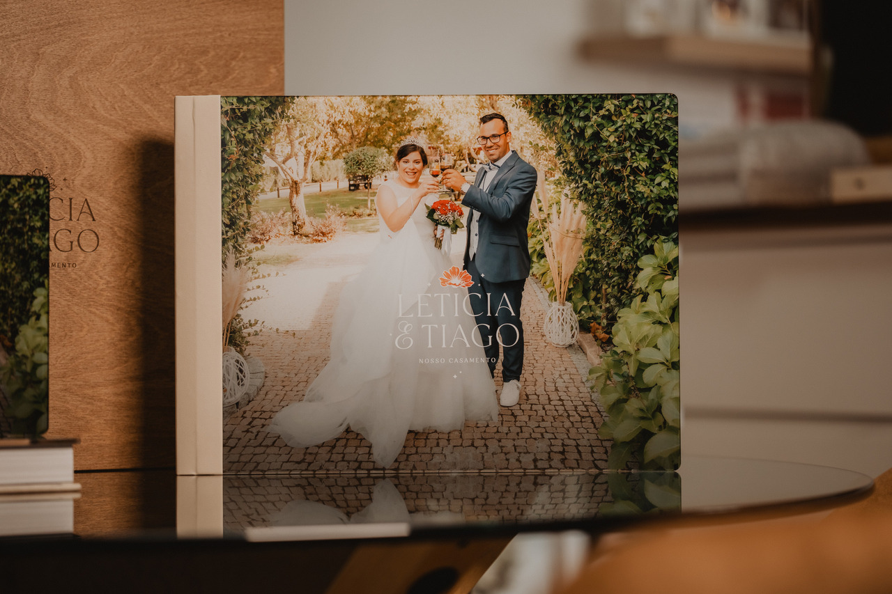 Álbum no tamanho 30x40, com foto em acrílico na capa, revestido com tecido premium bege na lombada e costas.