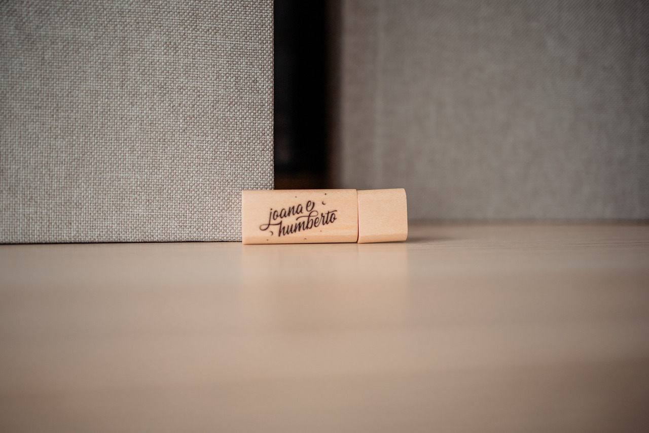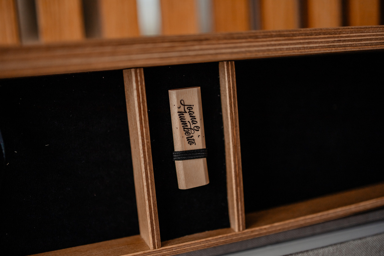 Caixa com compartimento para pen USB personalizada e mais dois compartimentos para fotos.