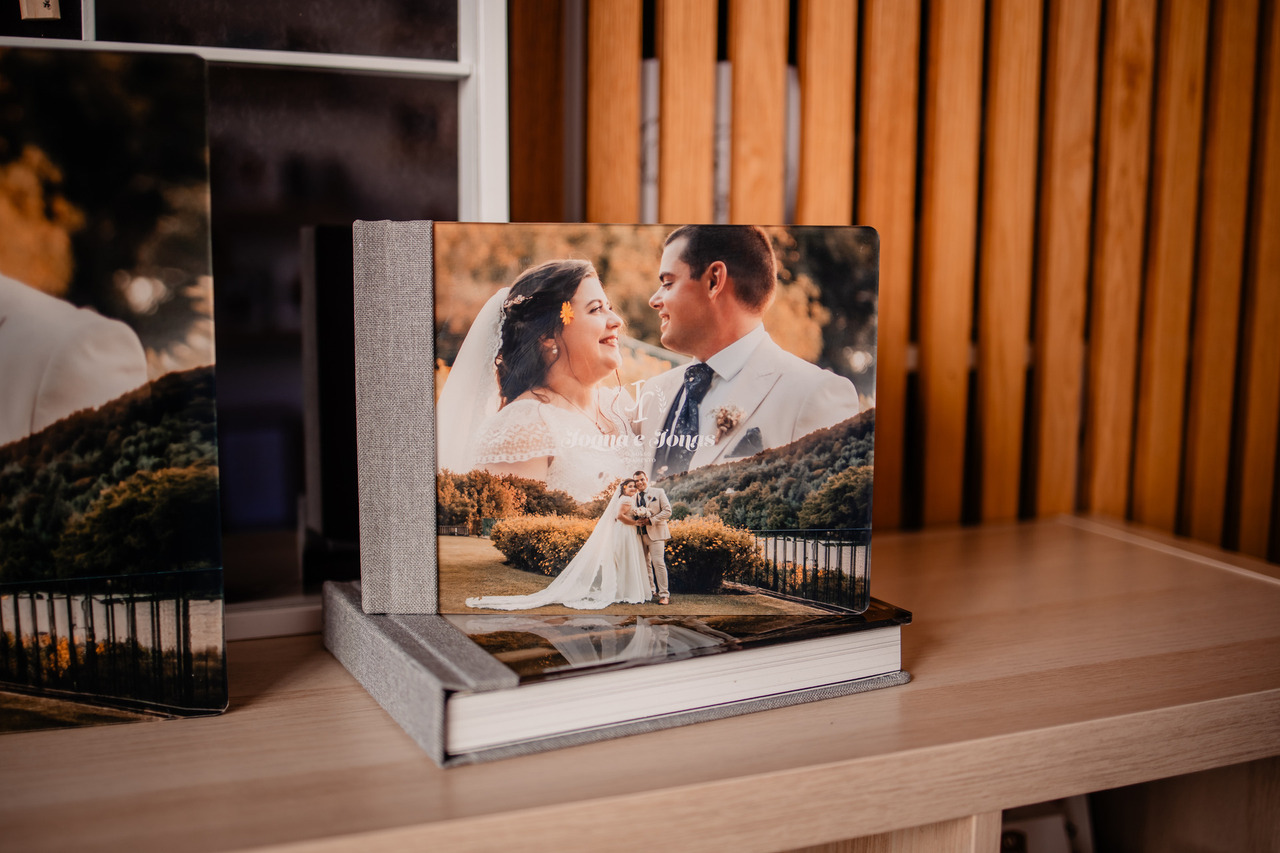 Álbum tamanho 30x40 (fechado) revestido a linho na cor cinza e acrílico com foto.