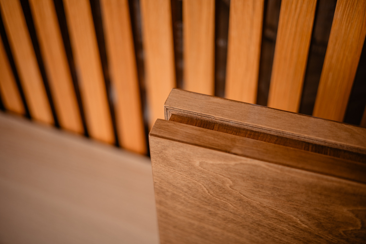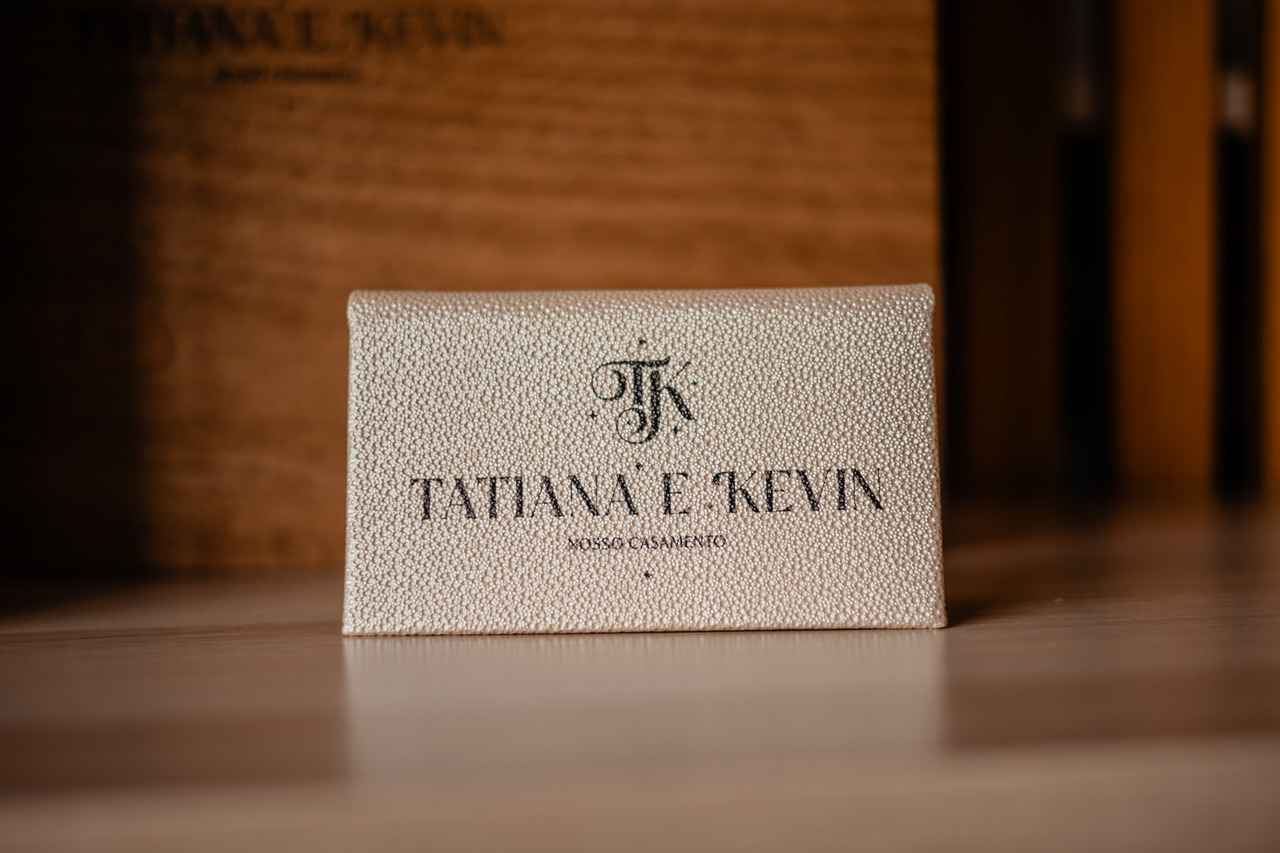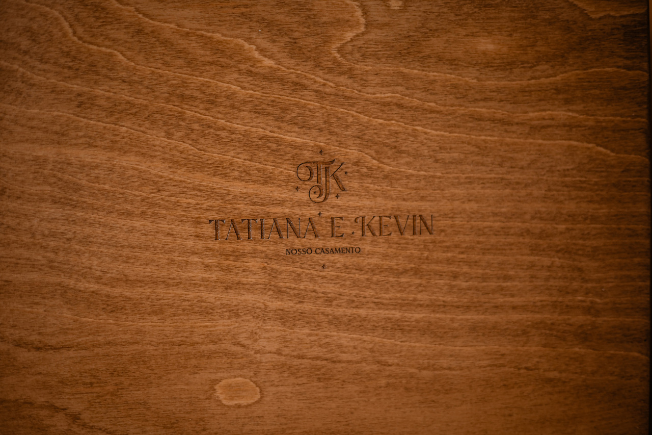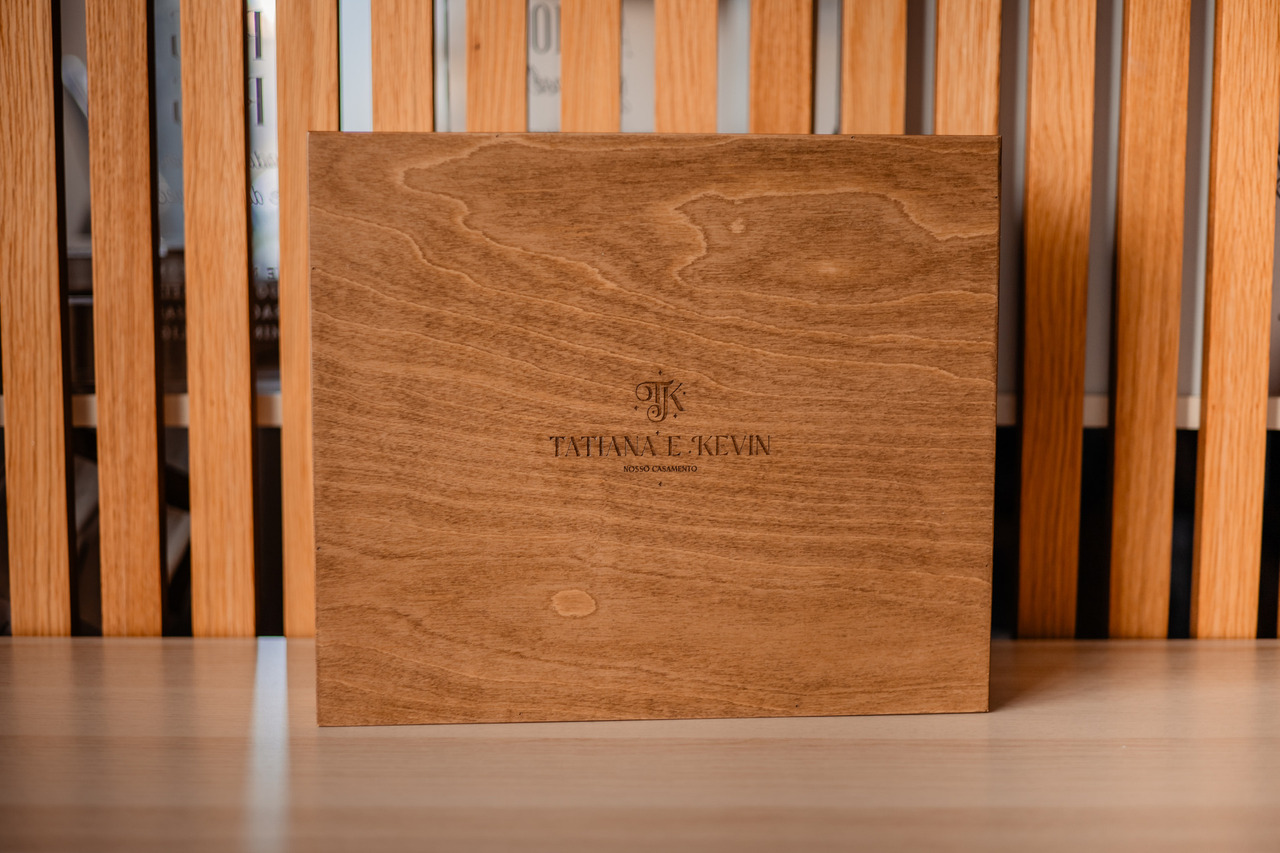 Caixa expositora toda em madeira de cor nogal. Gravação a laser no tampo da caixa com o monograma dos noivos. Interior forrado a veludo preto com fita preta.