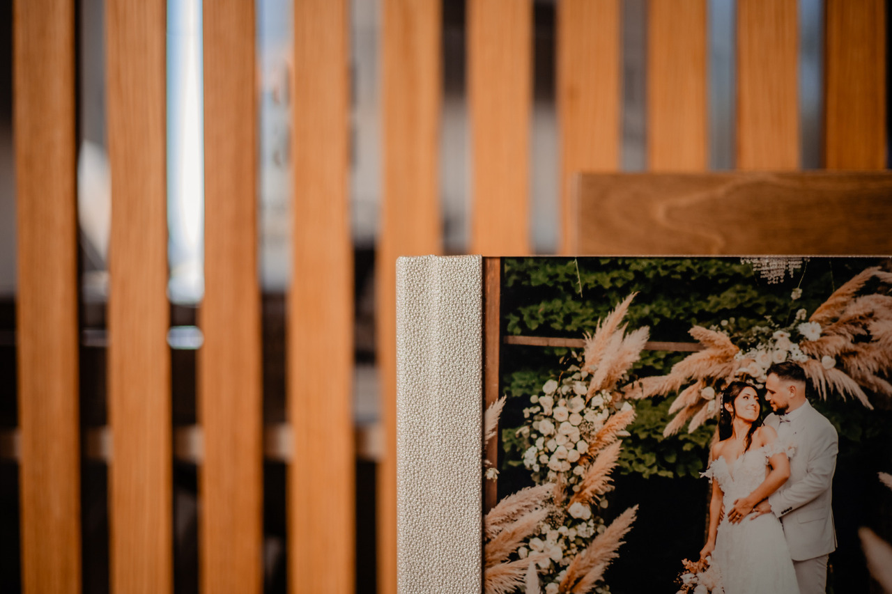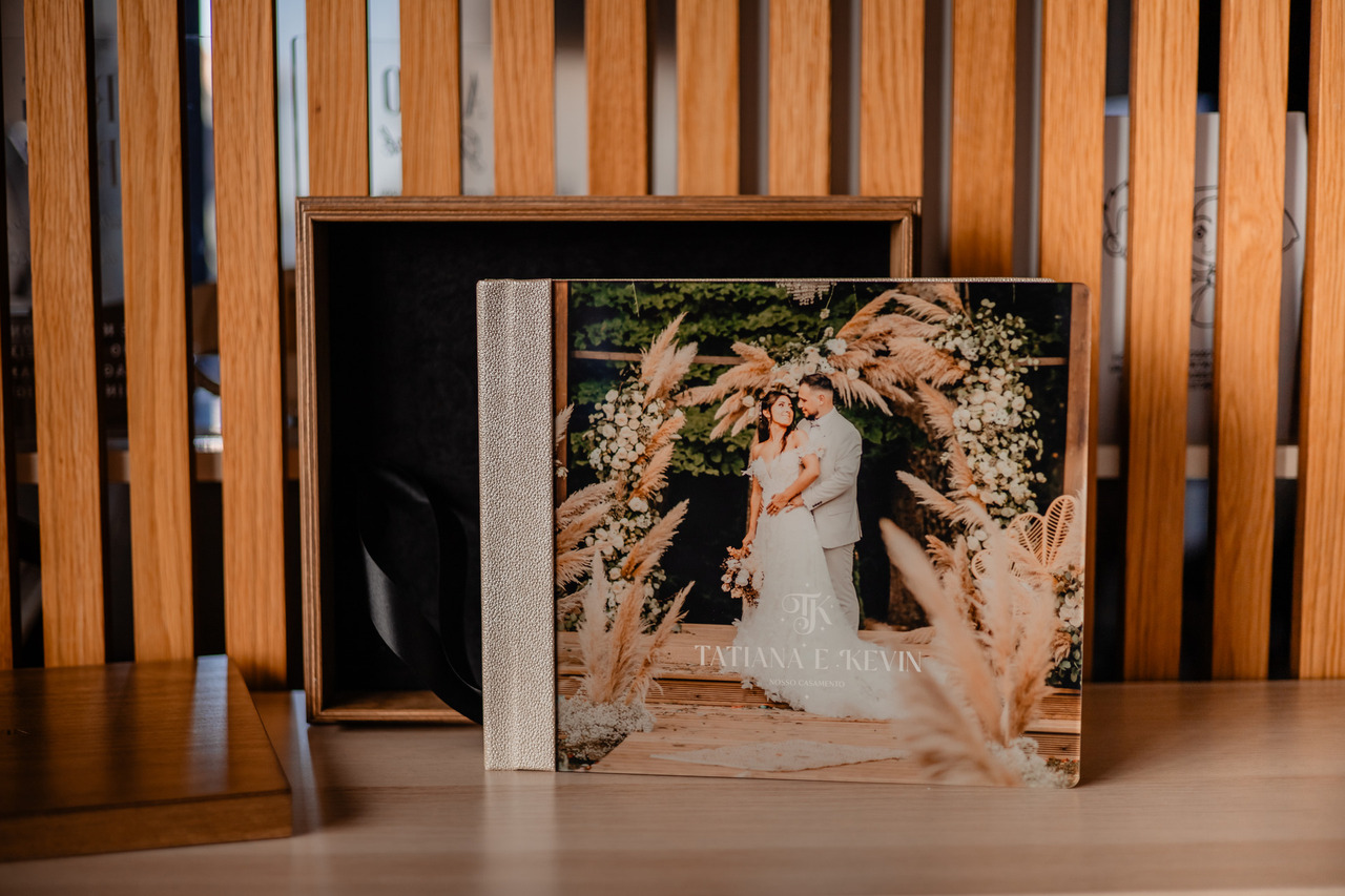 Álbum no tamanho 30x40, com foto em acrílico na capa, revestido com tecido premium na lombada e costas.