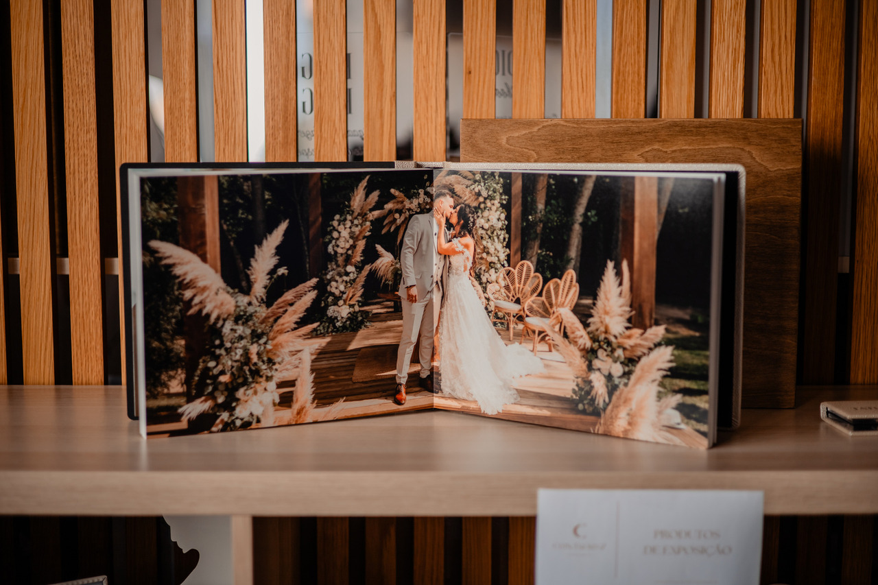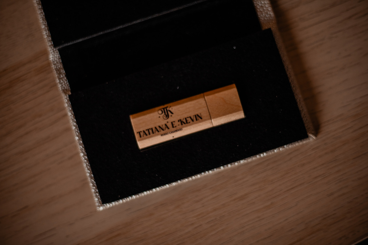 Conjunto de Casamento composto por caixa, álbum e caixa e pen personalizada.