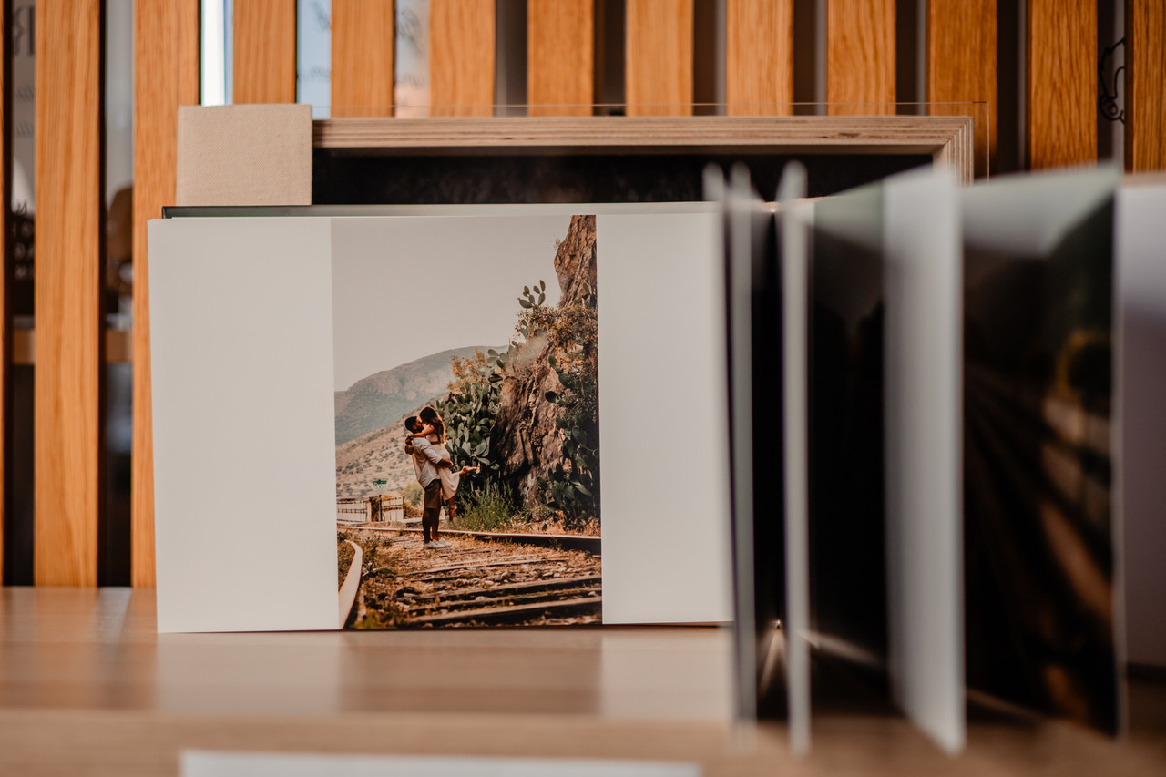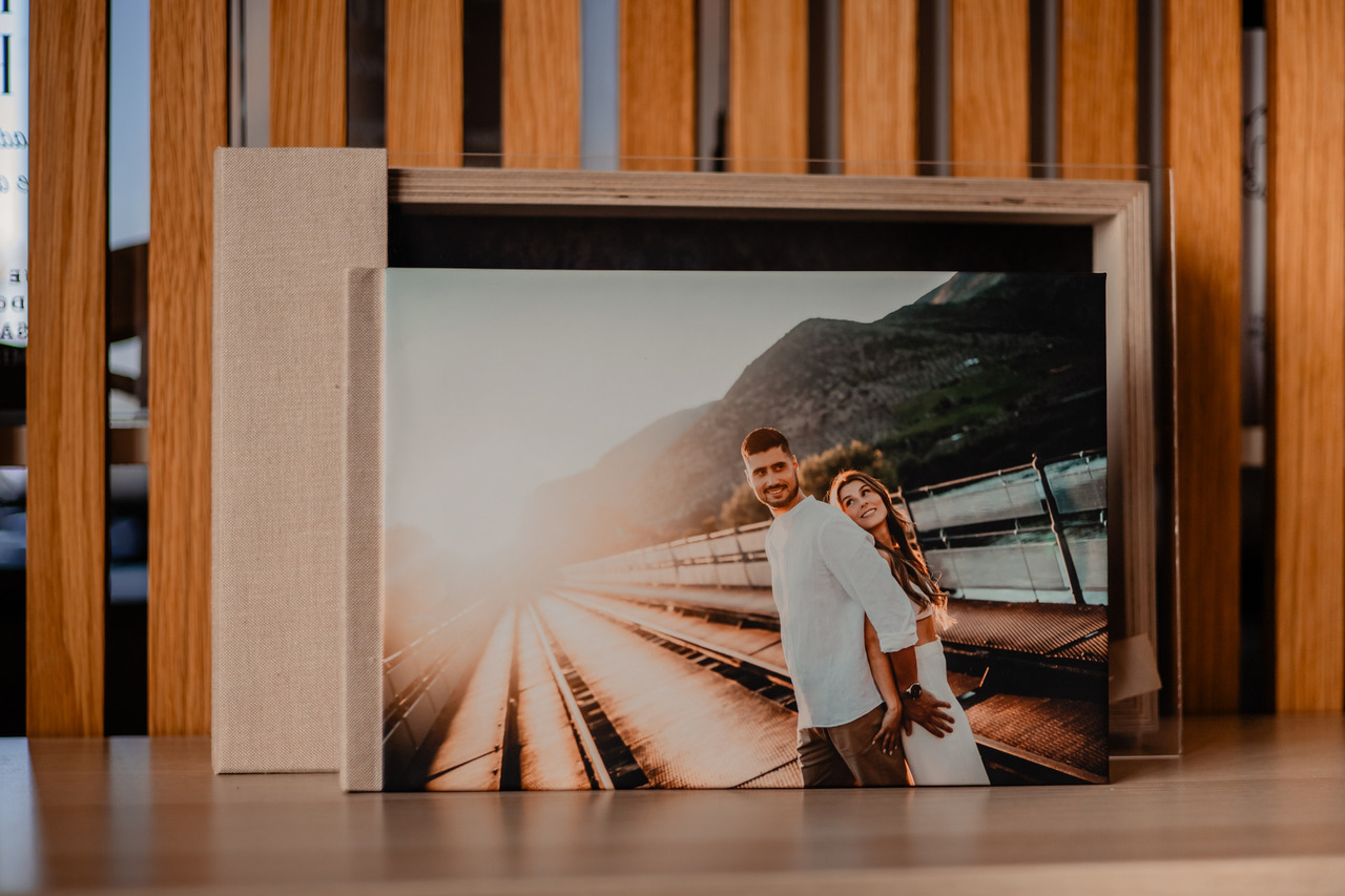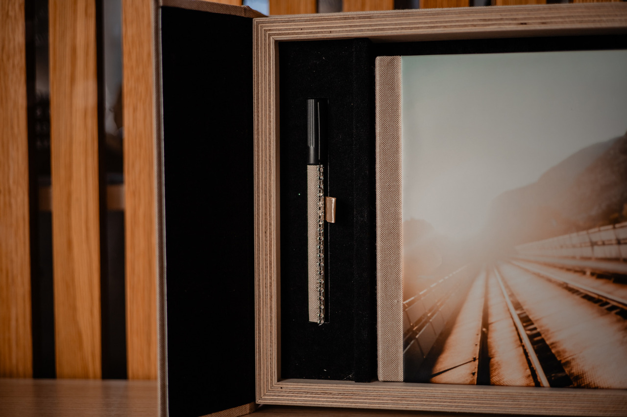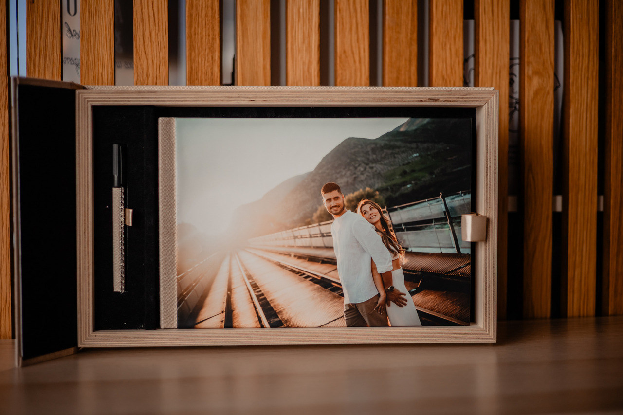 Conjunto de caixa com livro de honra fotográfico para casamento.