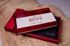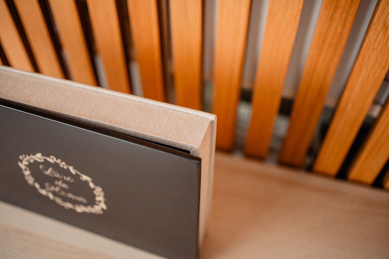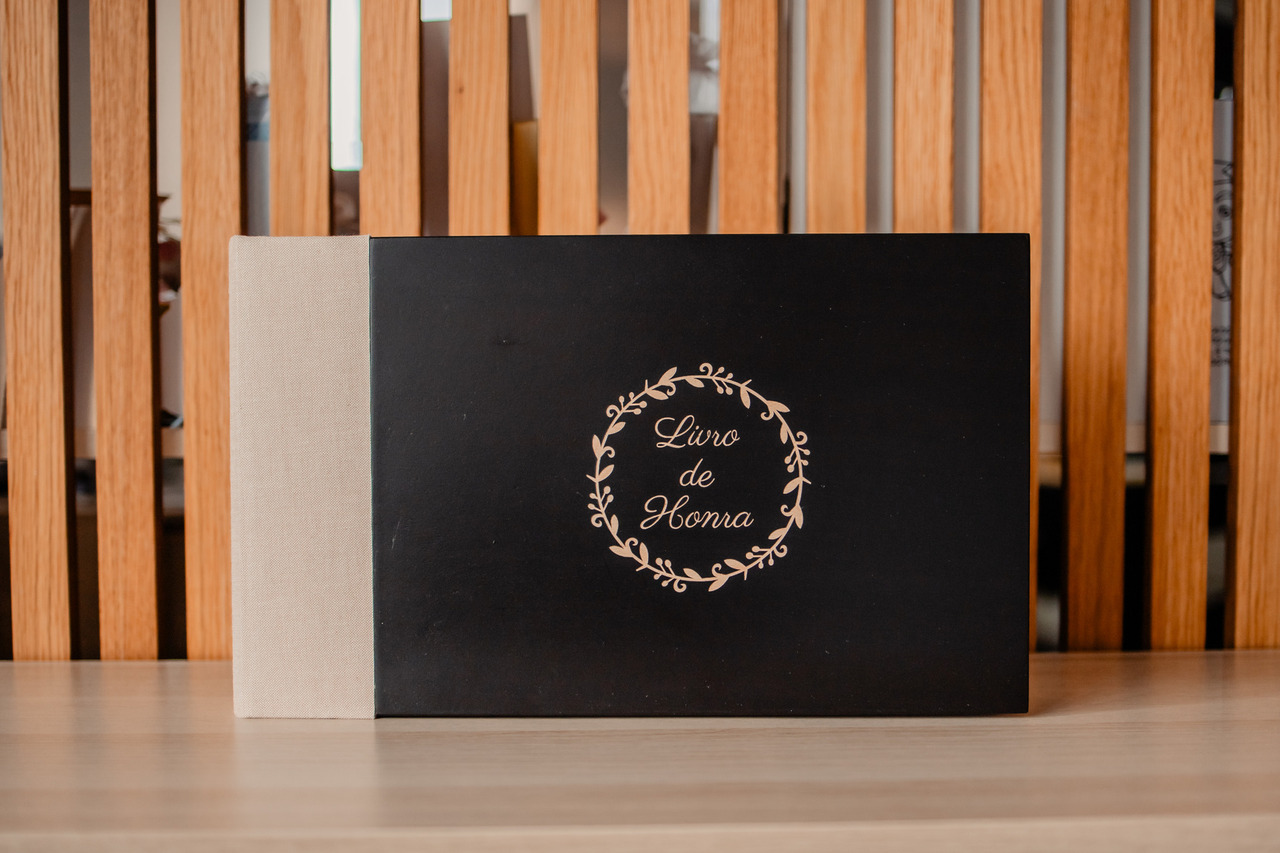 Caixa com tampo em madeira preta gravada a laser. Lombada e costas revestidas a linho, tons de castanho claro.