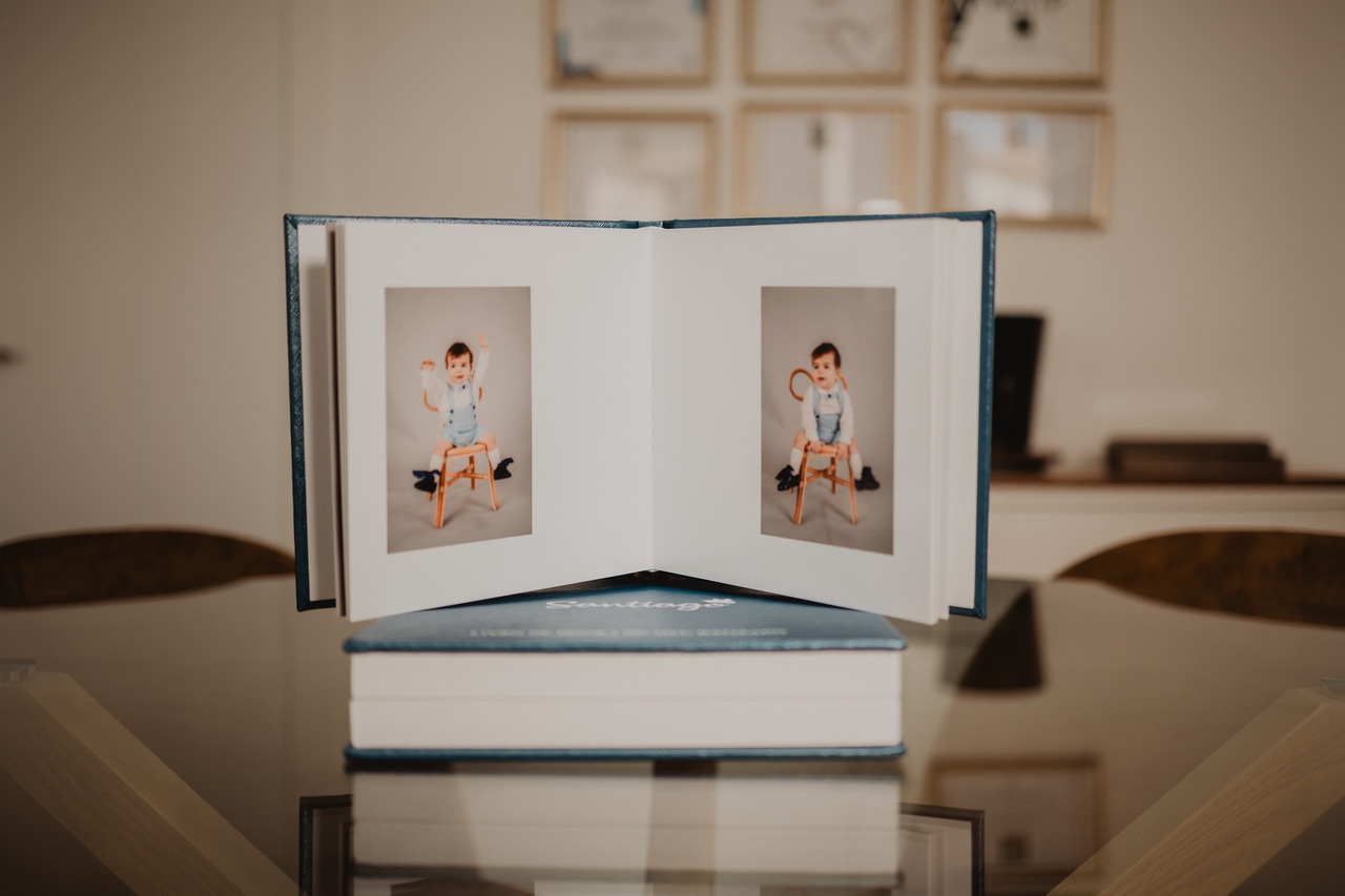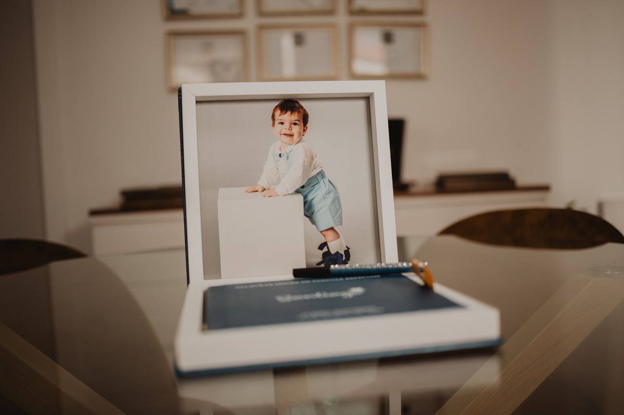 Caixa revestida em polipele premium azul brilhante com gravação em uv e aro em madeira branca. No interior da caixa encontra-se uma foto em destaque da sessão pré-batizado.