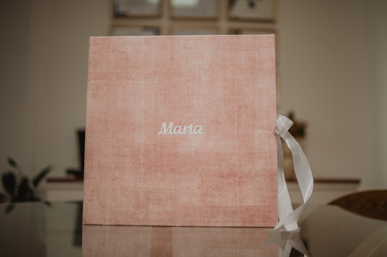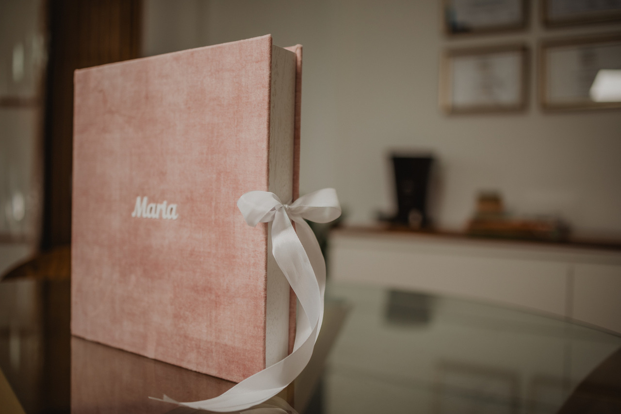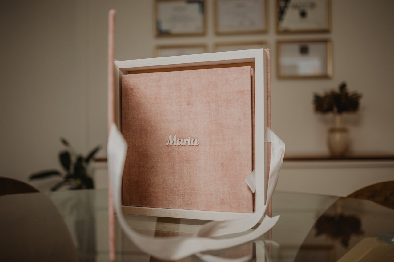 Álbum principal com tamanho 25x25, revestido no mesmo tecido da caixa.