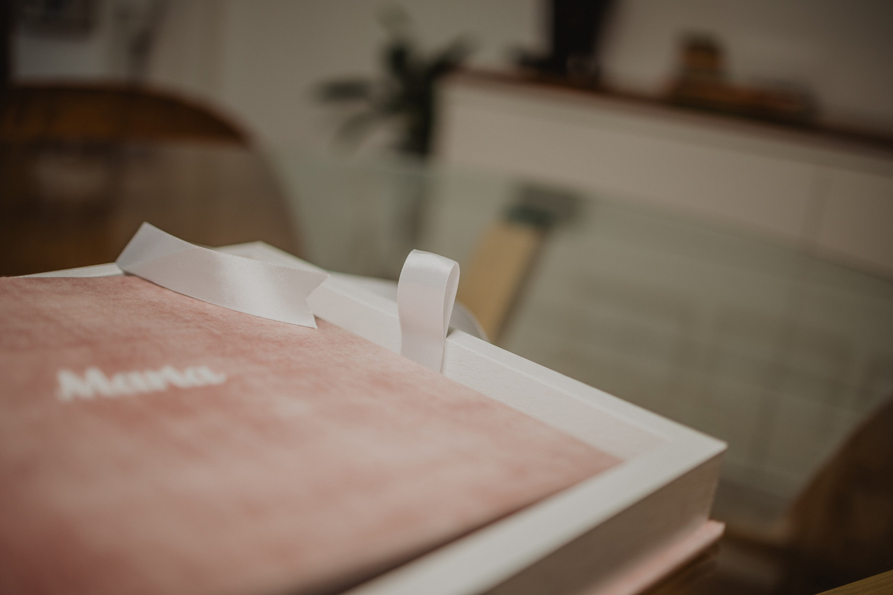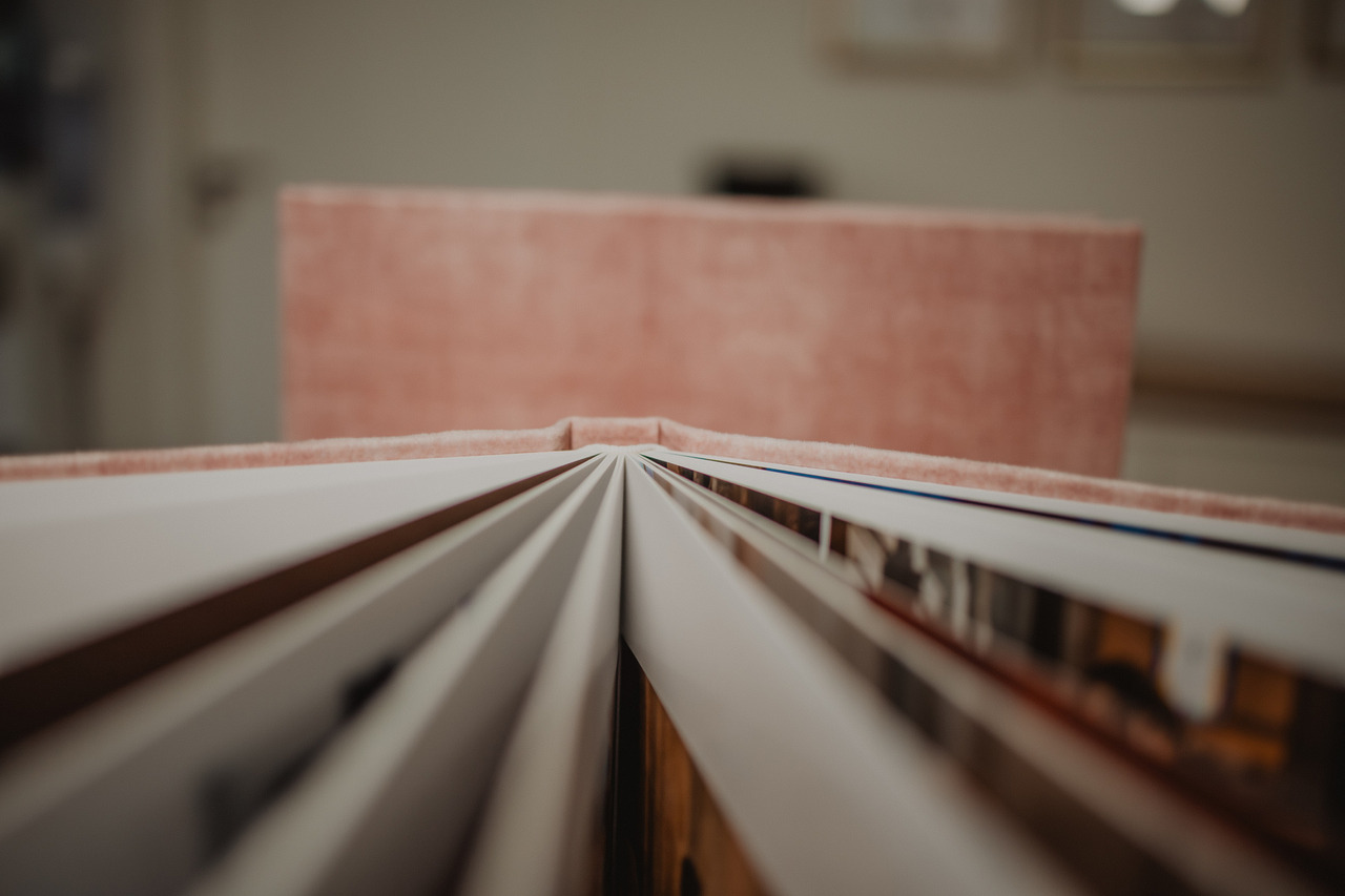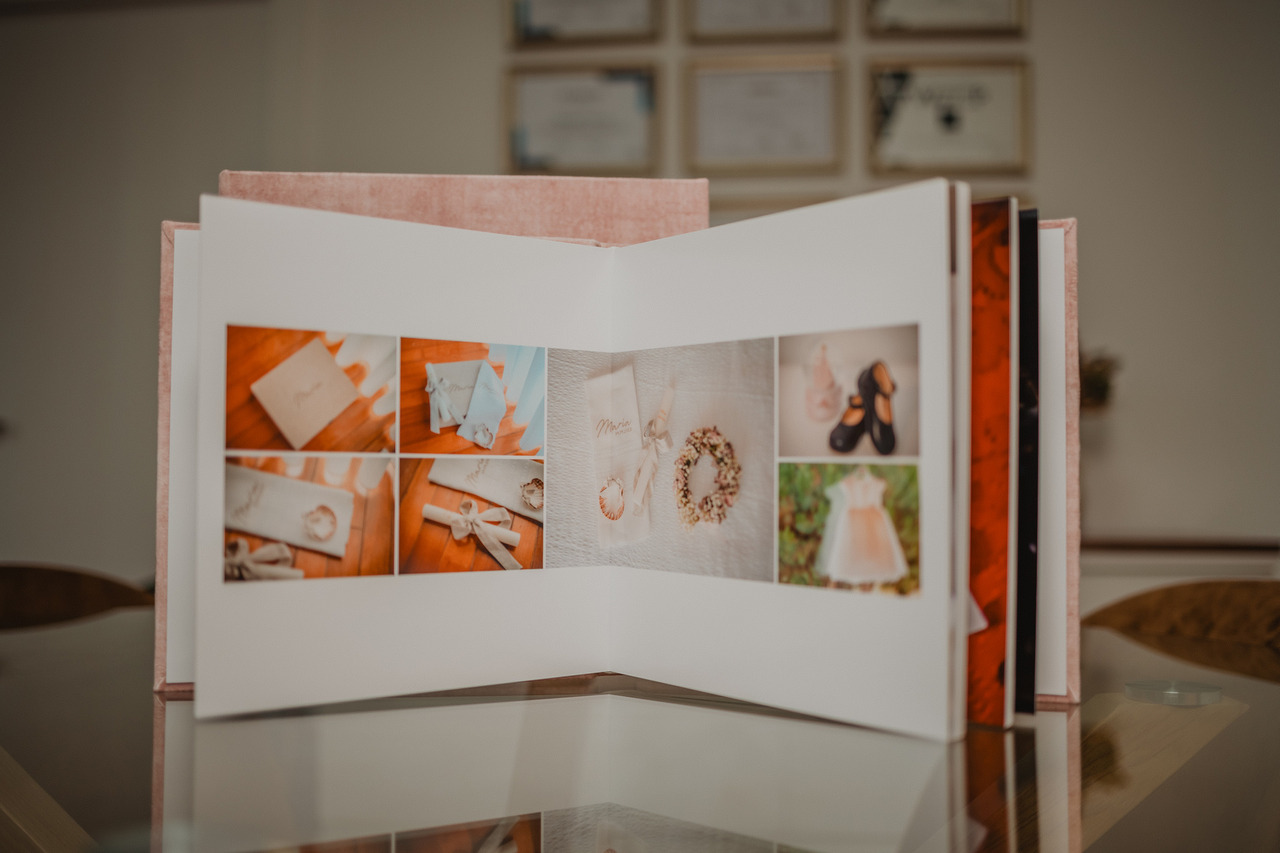 Álbum principal com tamanho 25x25, revestido no mesmo tecido da caixa.