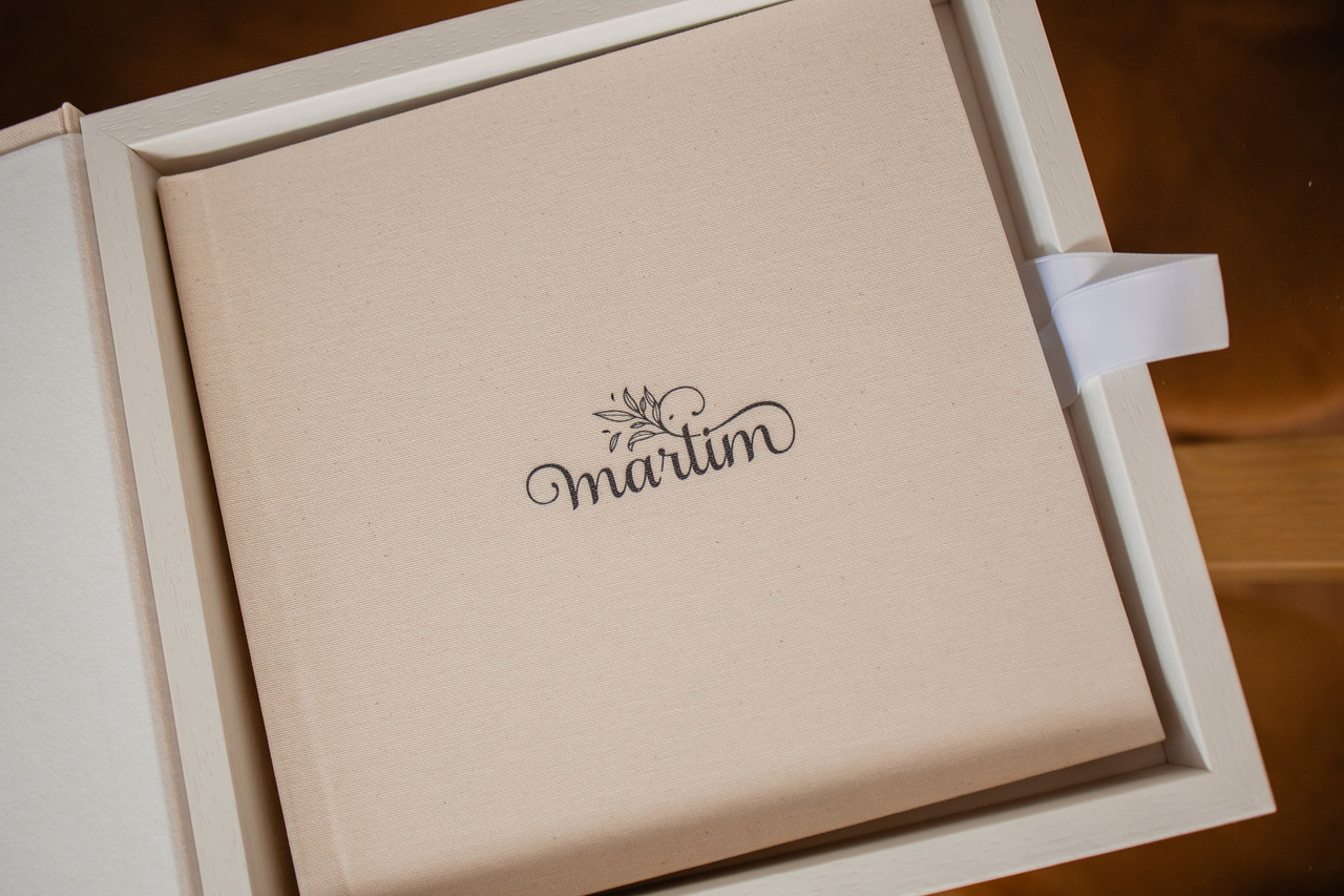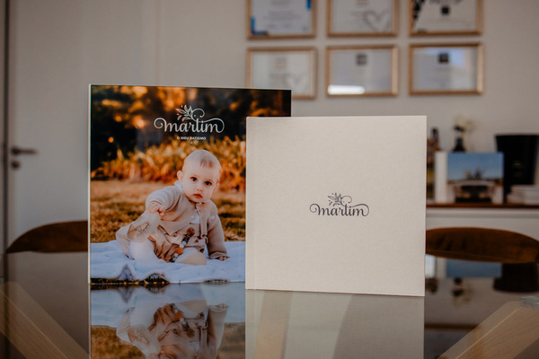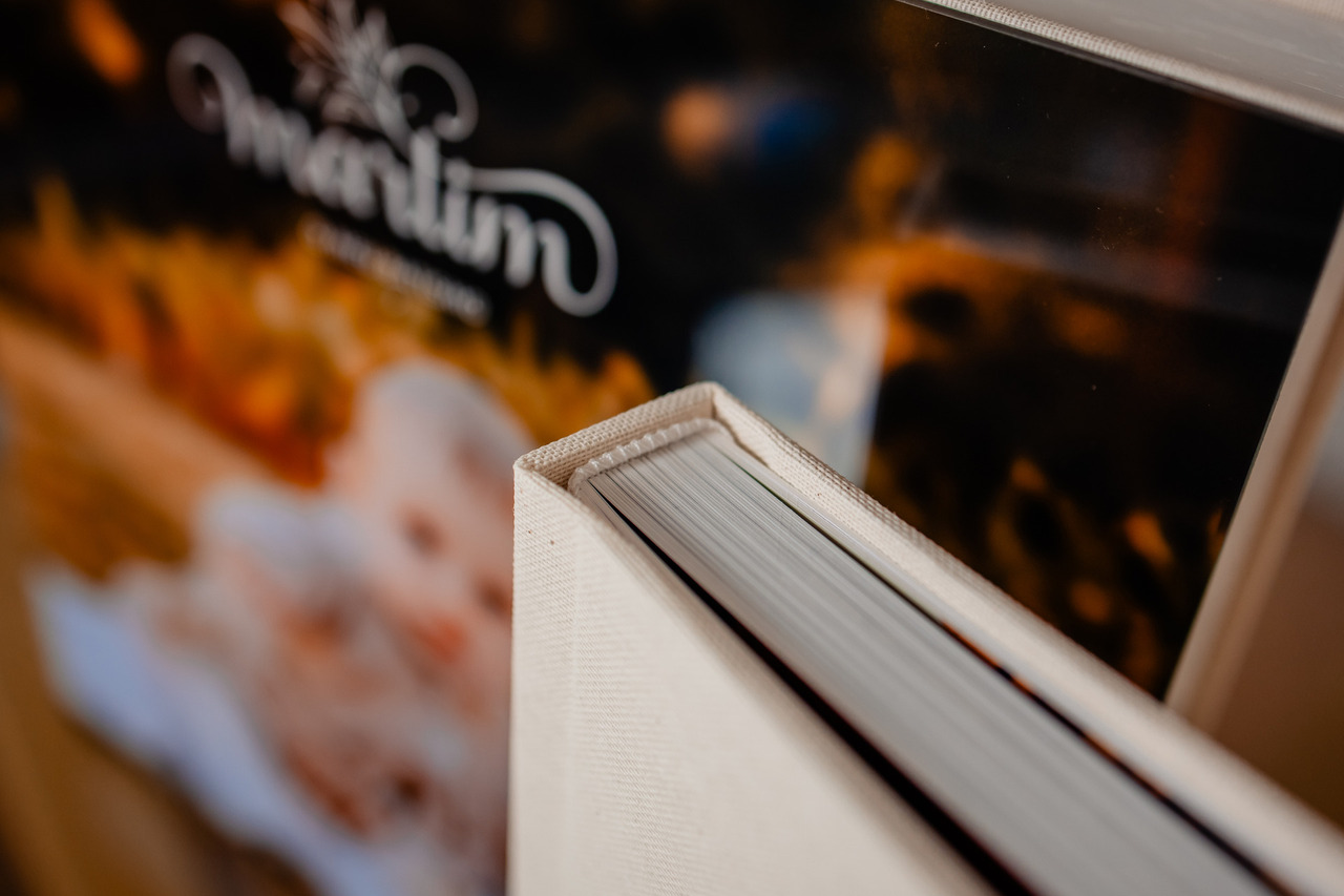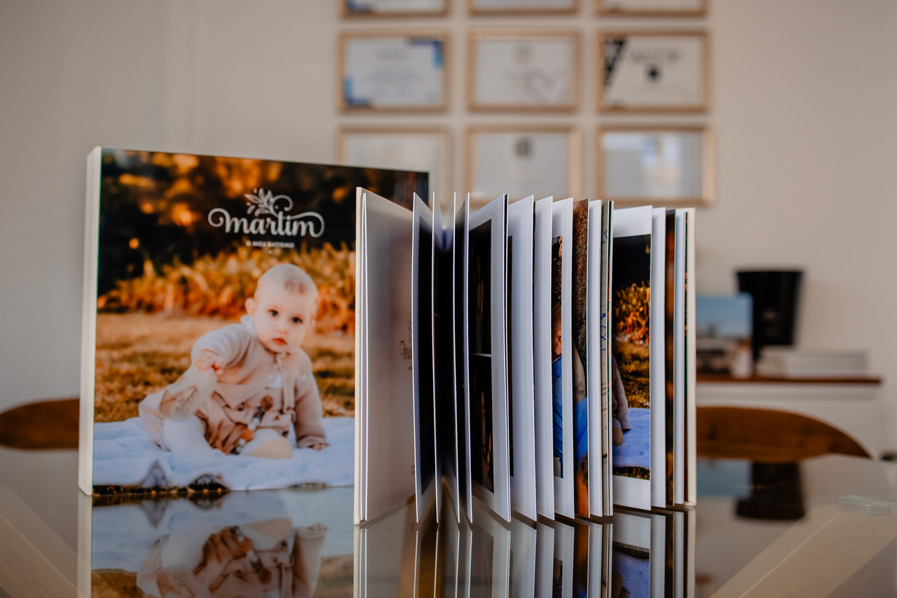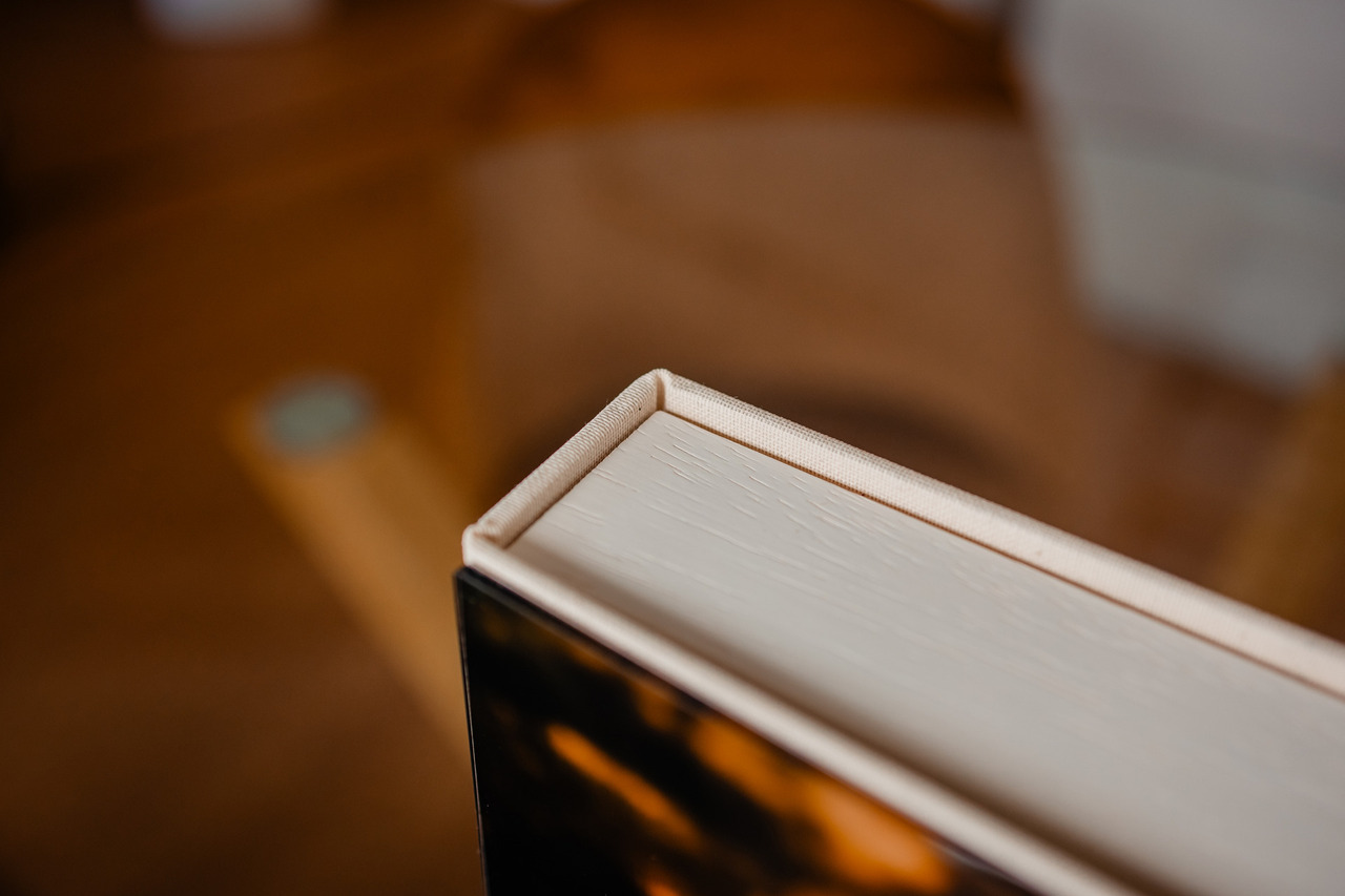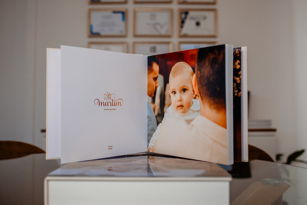 Álbum principal com tamanho 25x25, revestido no mesmo tecido da caixa.