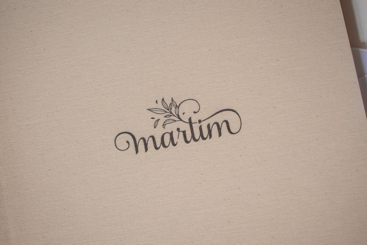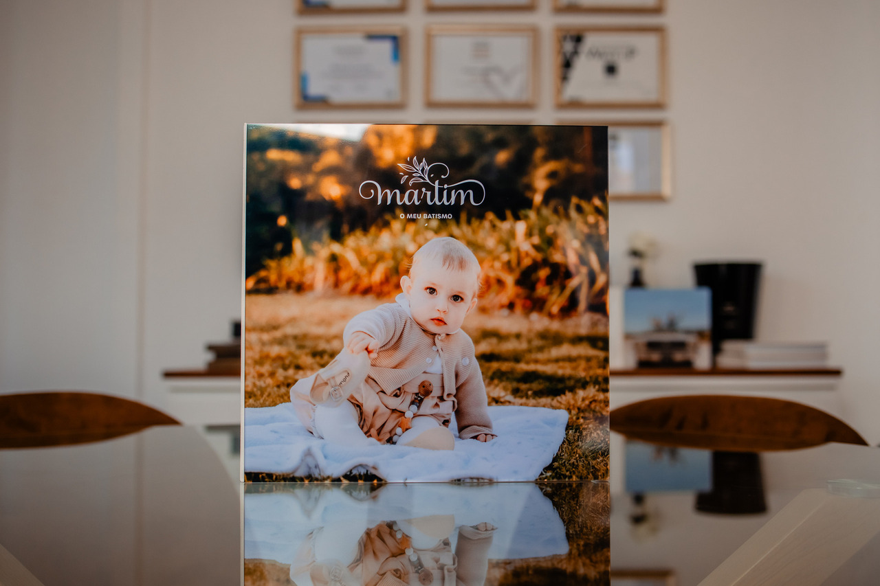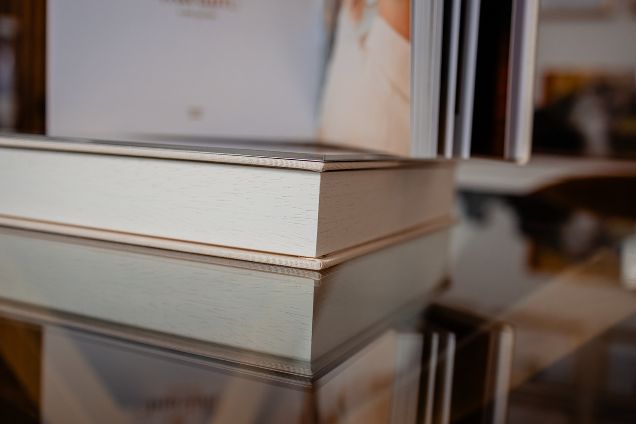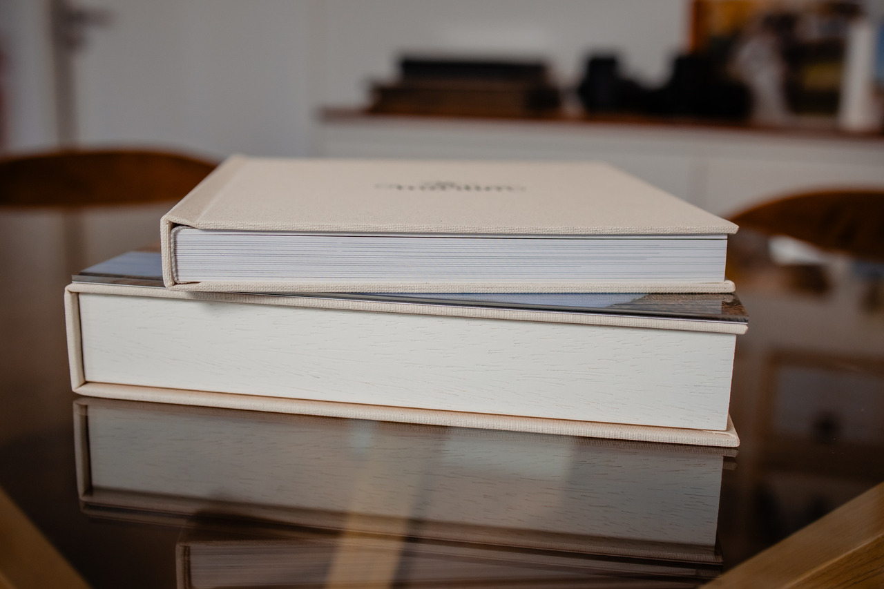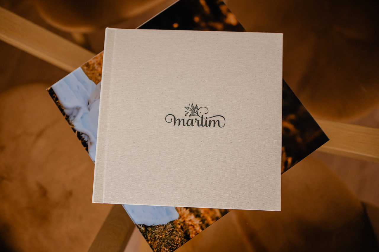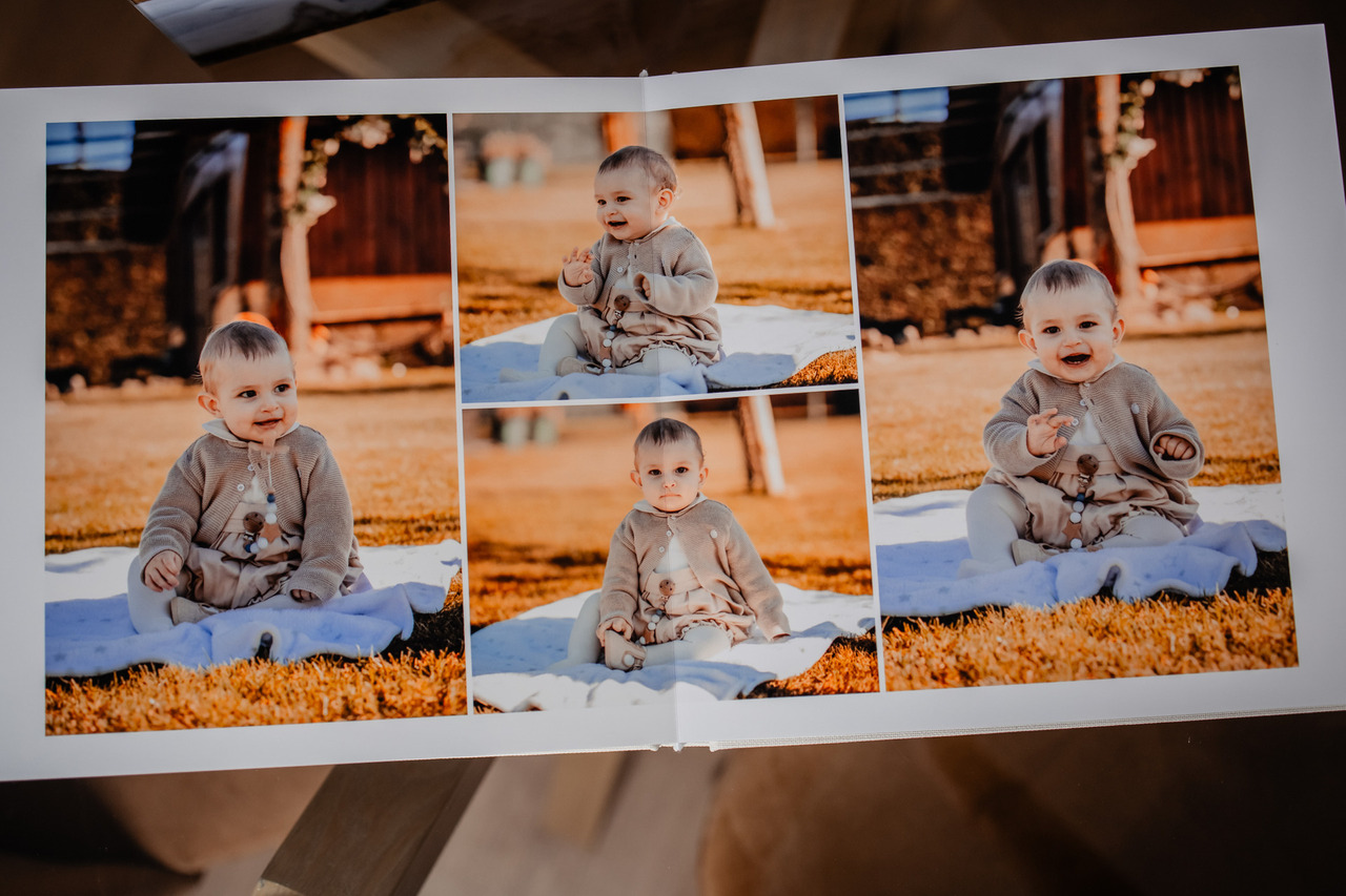 Álbum principal com tamanho 25x25, revestido no mesmo tecido da caixa.