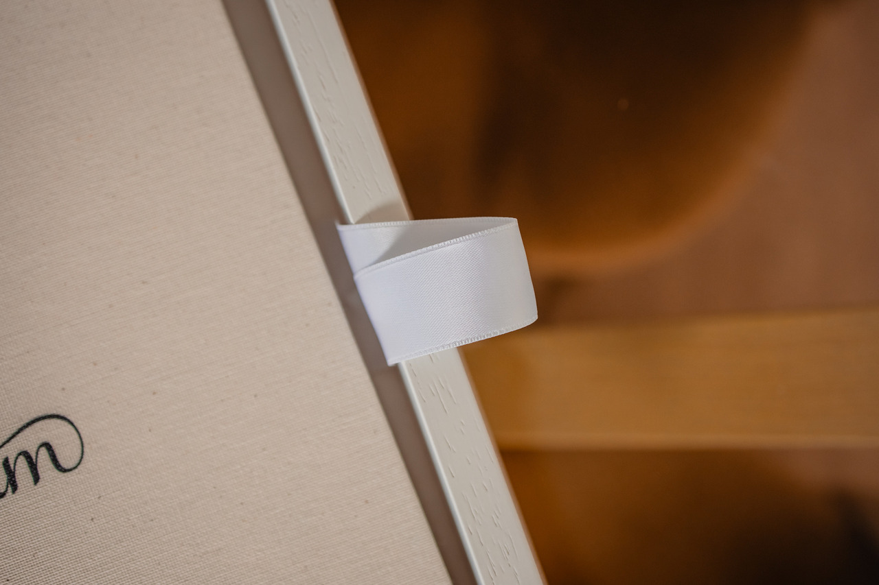 Caixa expositora com acrílico na capa. Caixa revestida a tecido Buckram natural cor pure com aros em madeira branca. Interior a veludo branco e fita branca.