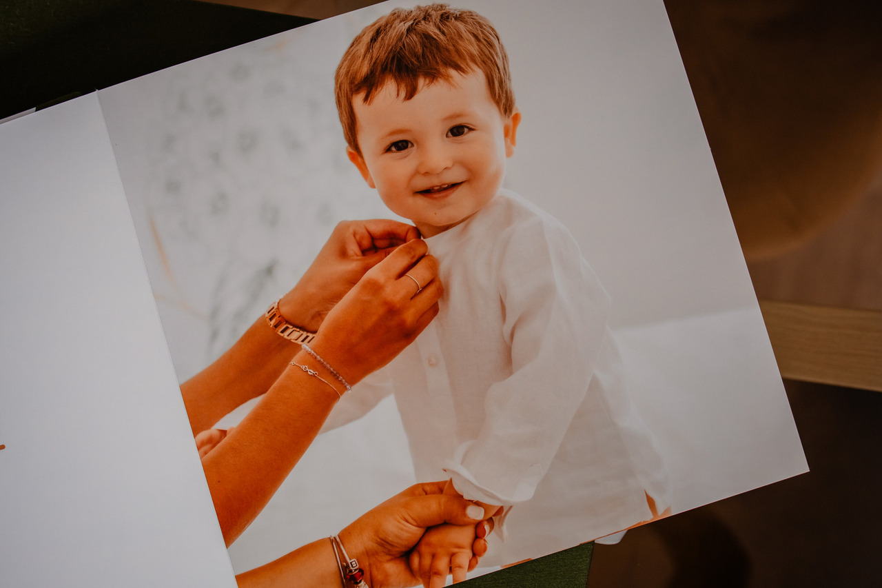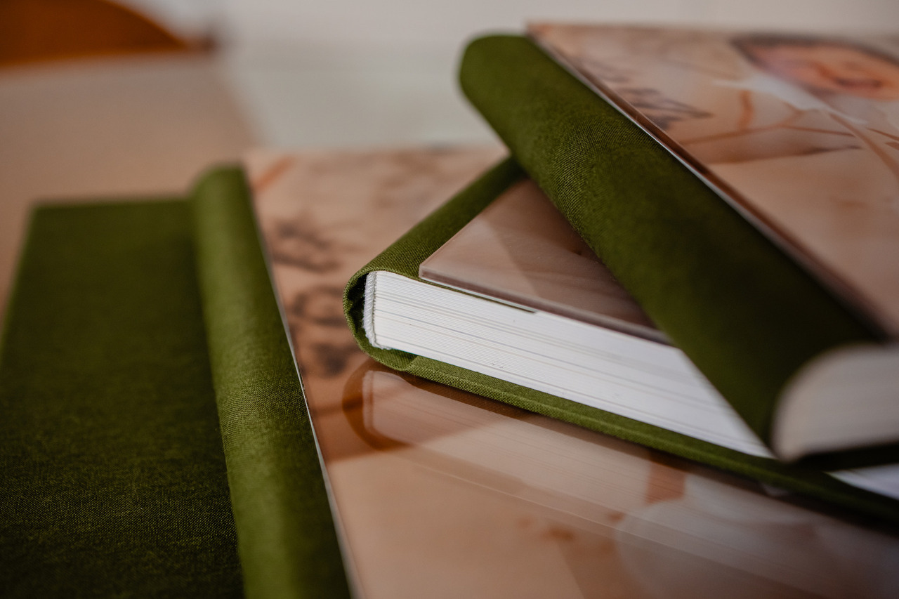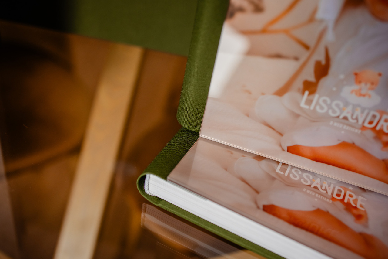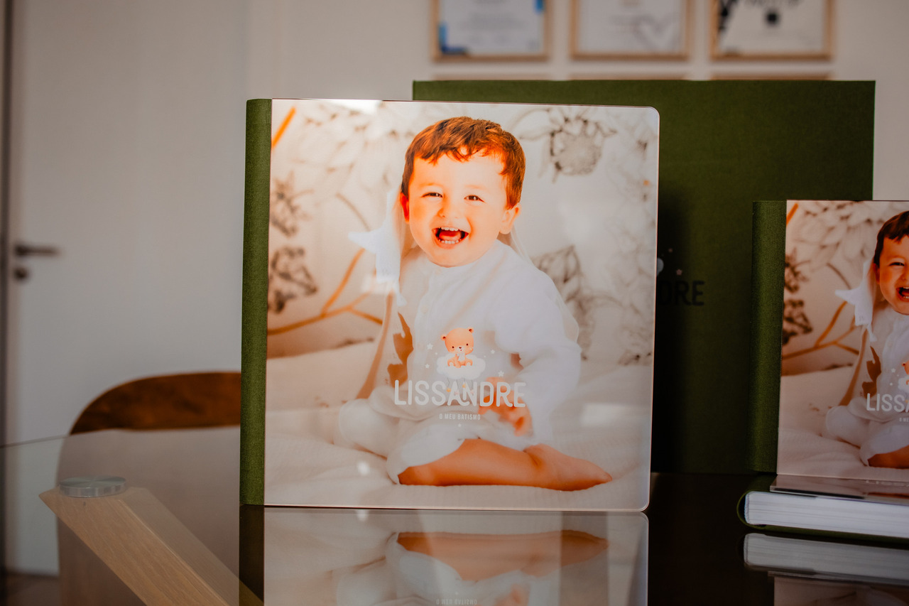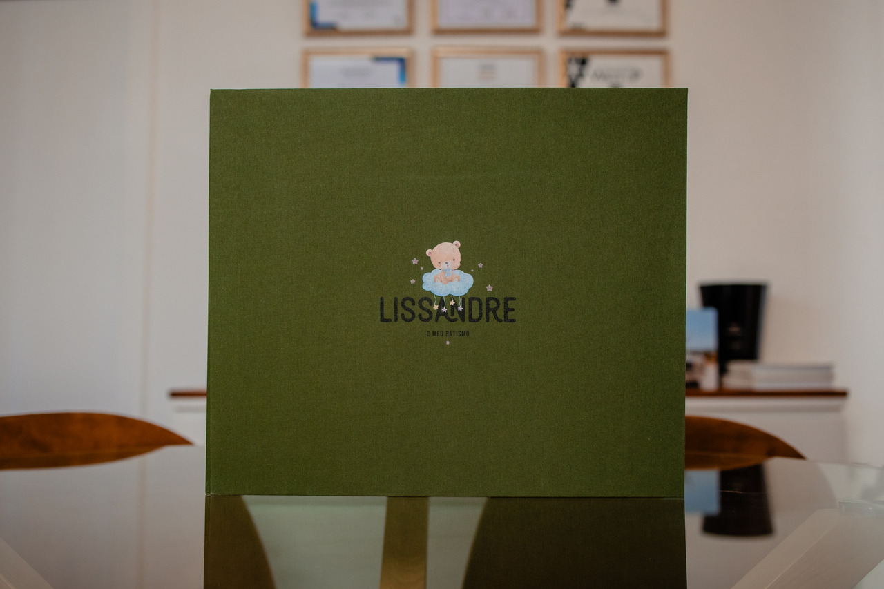 Um conjunto de Batismo lindo em tons de verde oliva composto por caixa, álbum principal e duas réplicas.