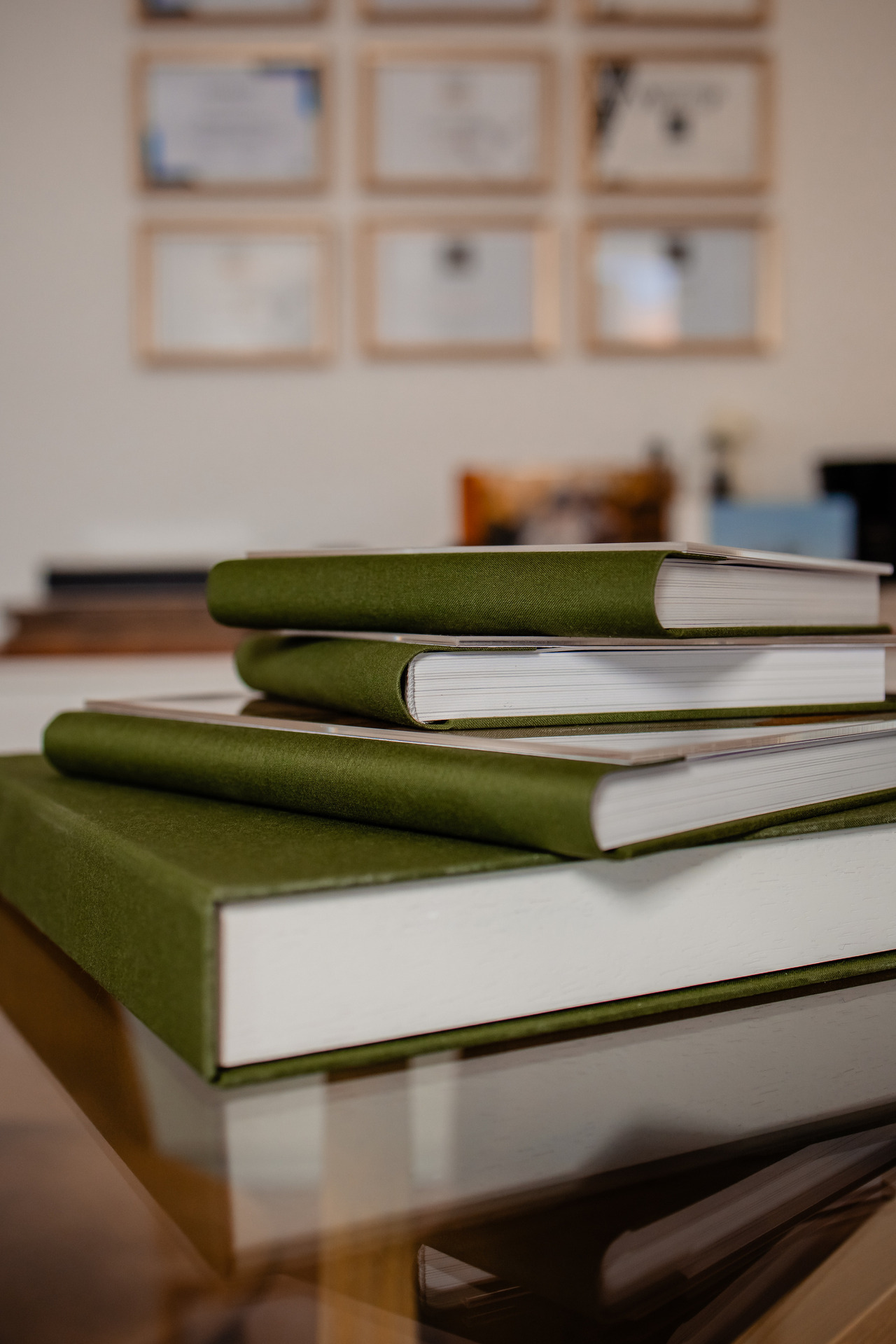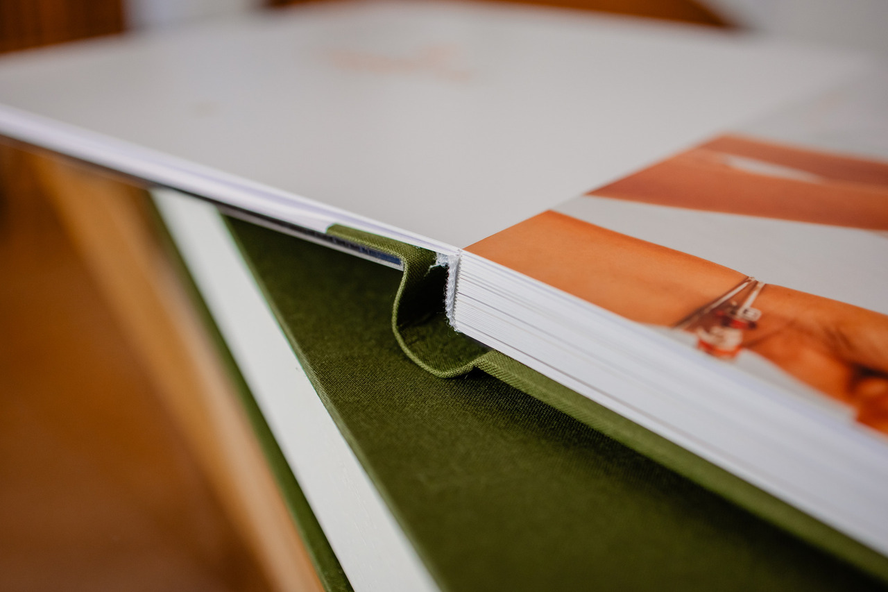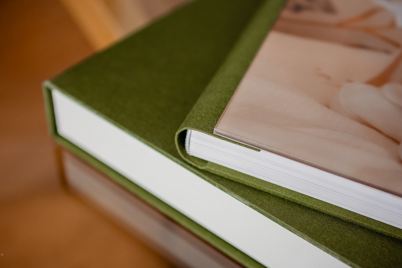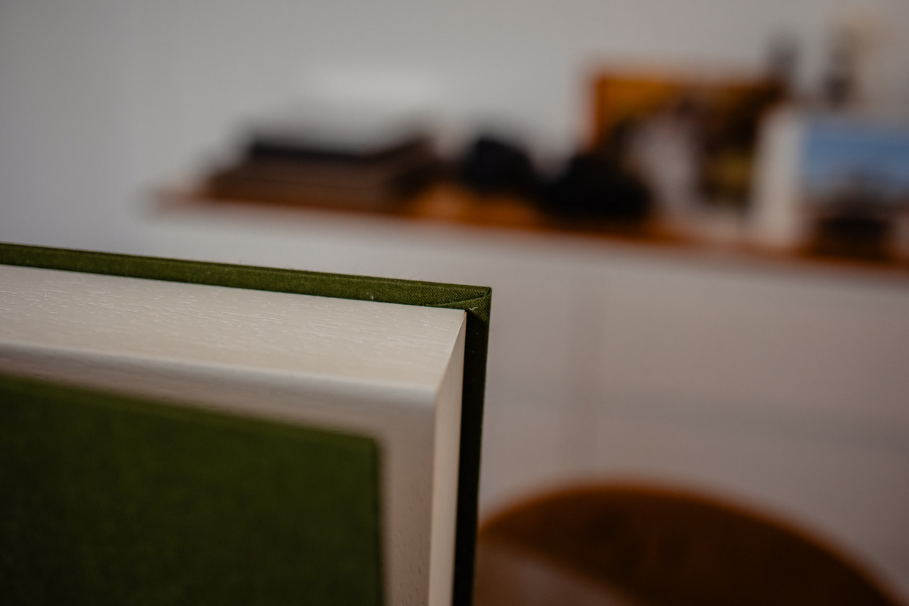 Um conjunto de Batismo lindo em tons de verde oliva composto por caixa, álbum principal e duas réplicas.