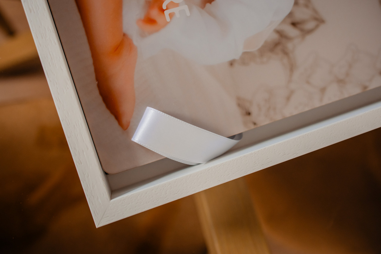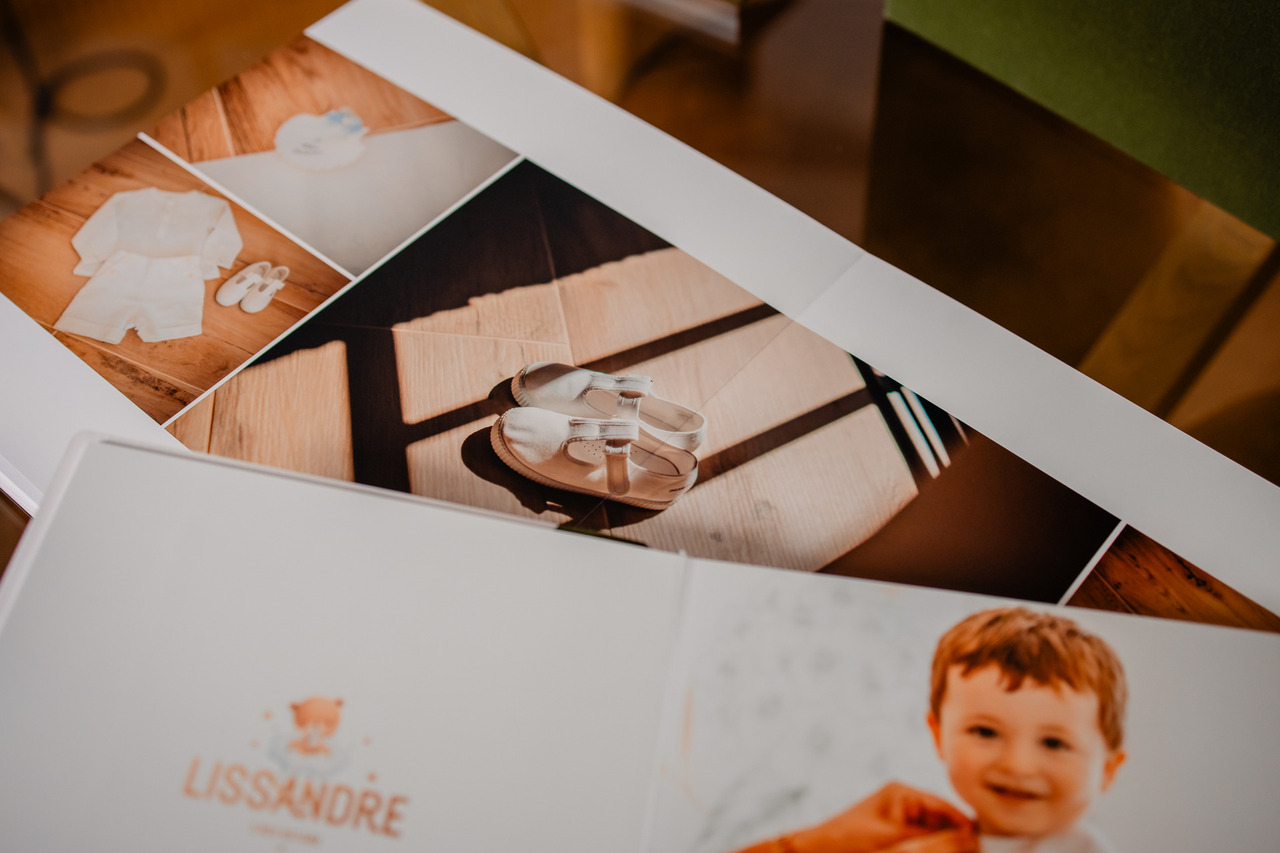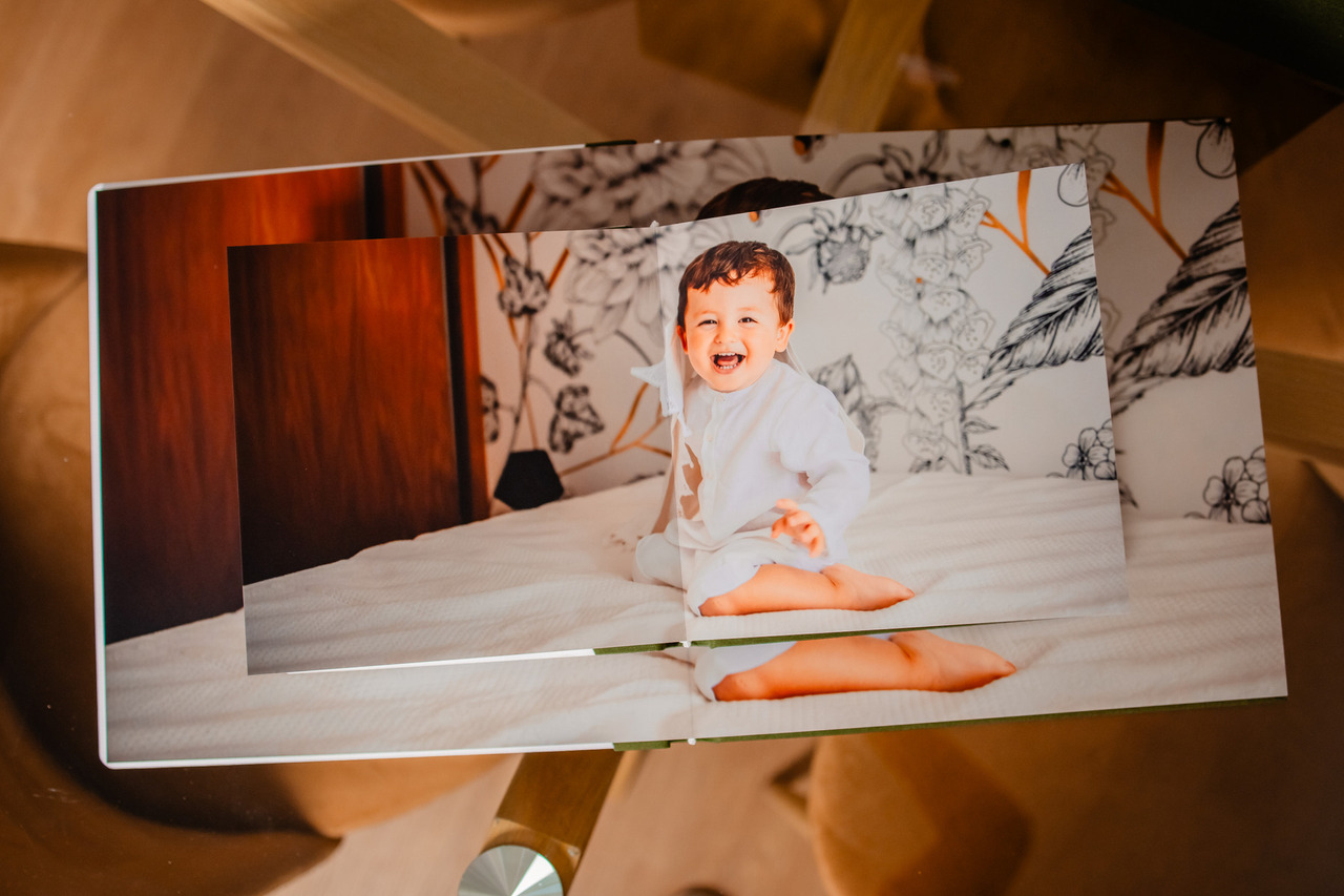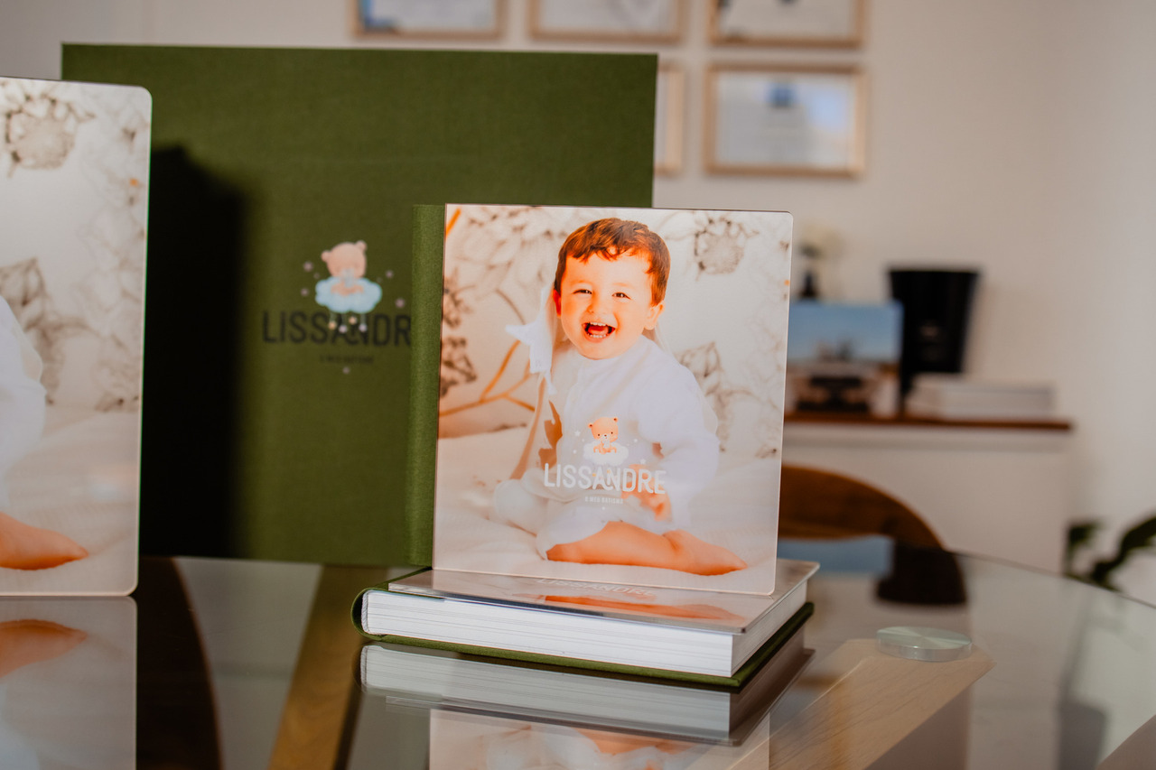 Álbum principal de tamanho 30x30, revestido no mesmo tecido da caixa. Acrílico com foto e monograma na capa.