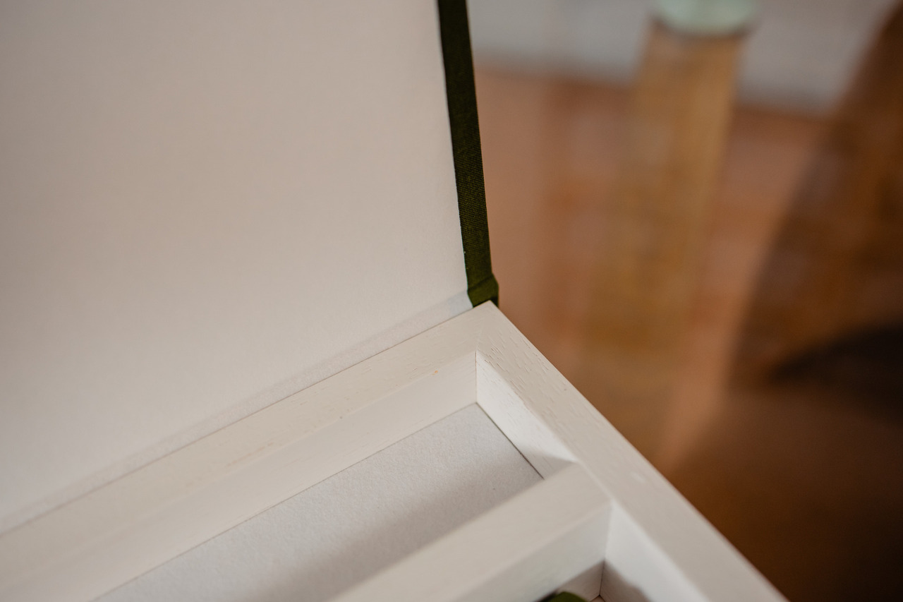 Caixa expositora revestida a tecido Buckram na cor verde e madeira branca. Interior a veludo branco e fita branca.