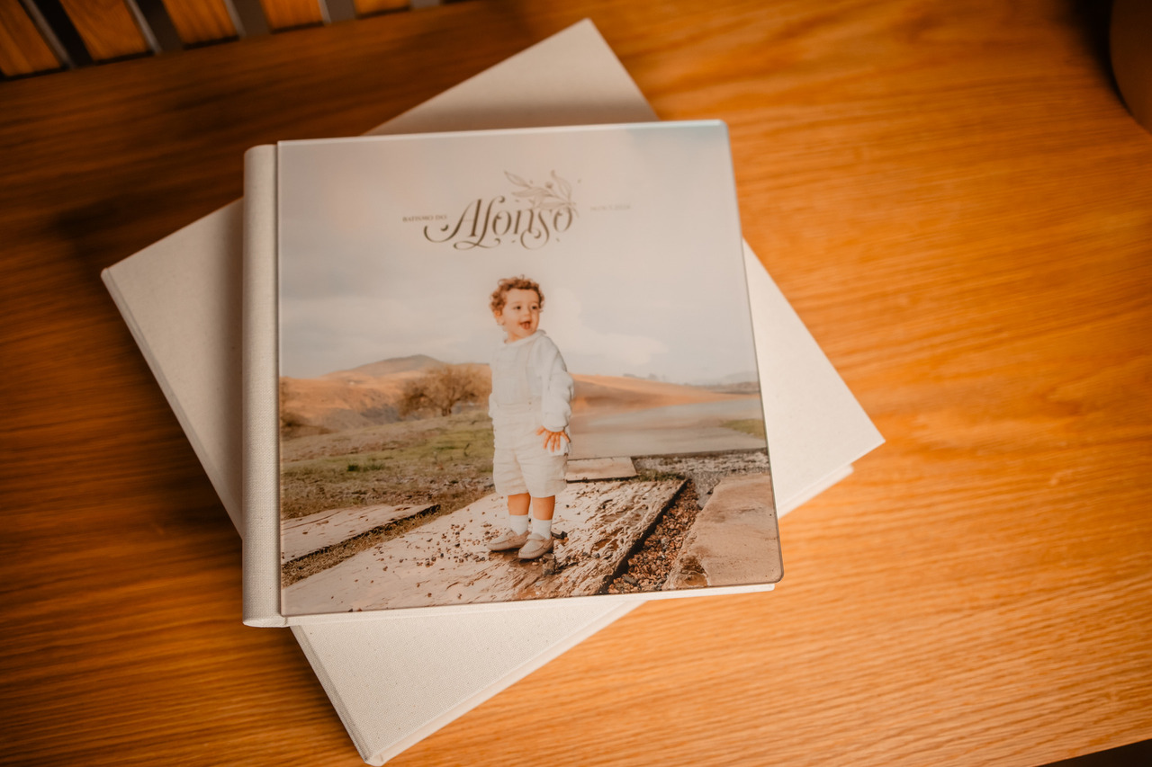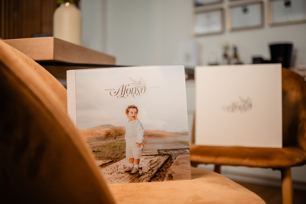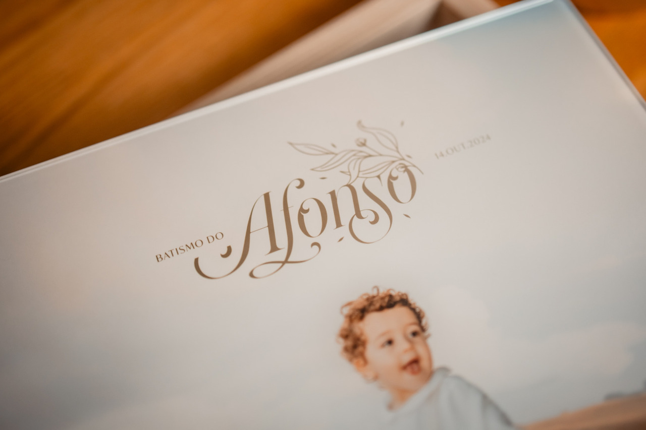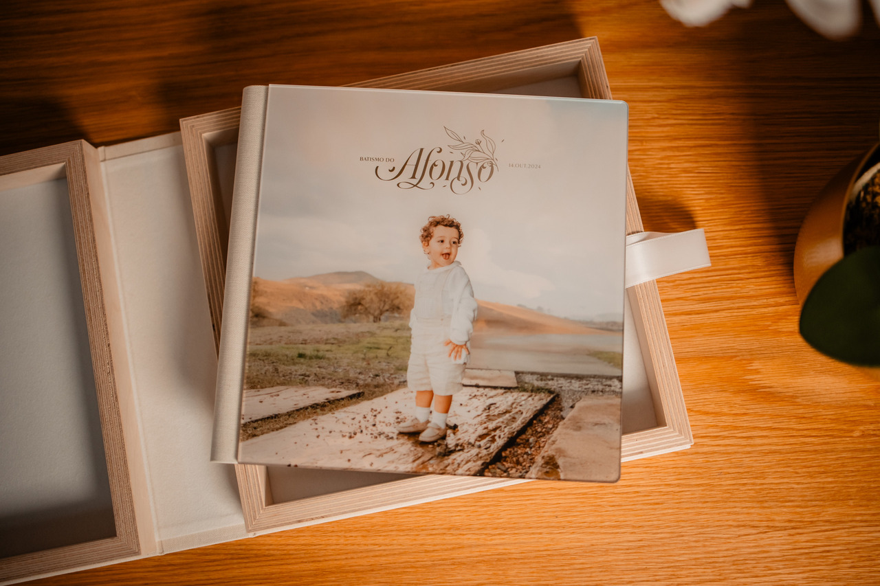 Álbum principal de tamanho 25x25, revestido no mesmo tecido da caixa e capa em acrílico com foto e monograma do batismo.
