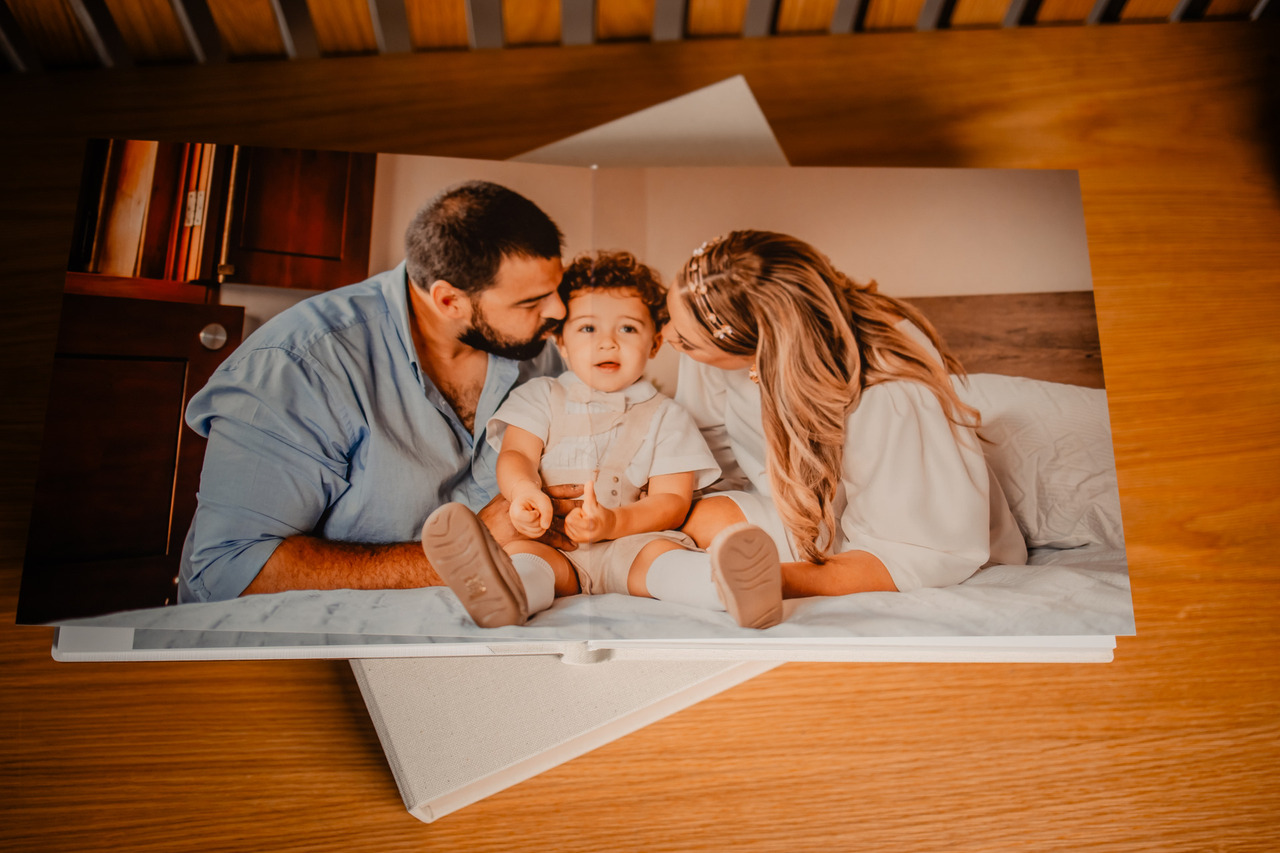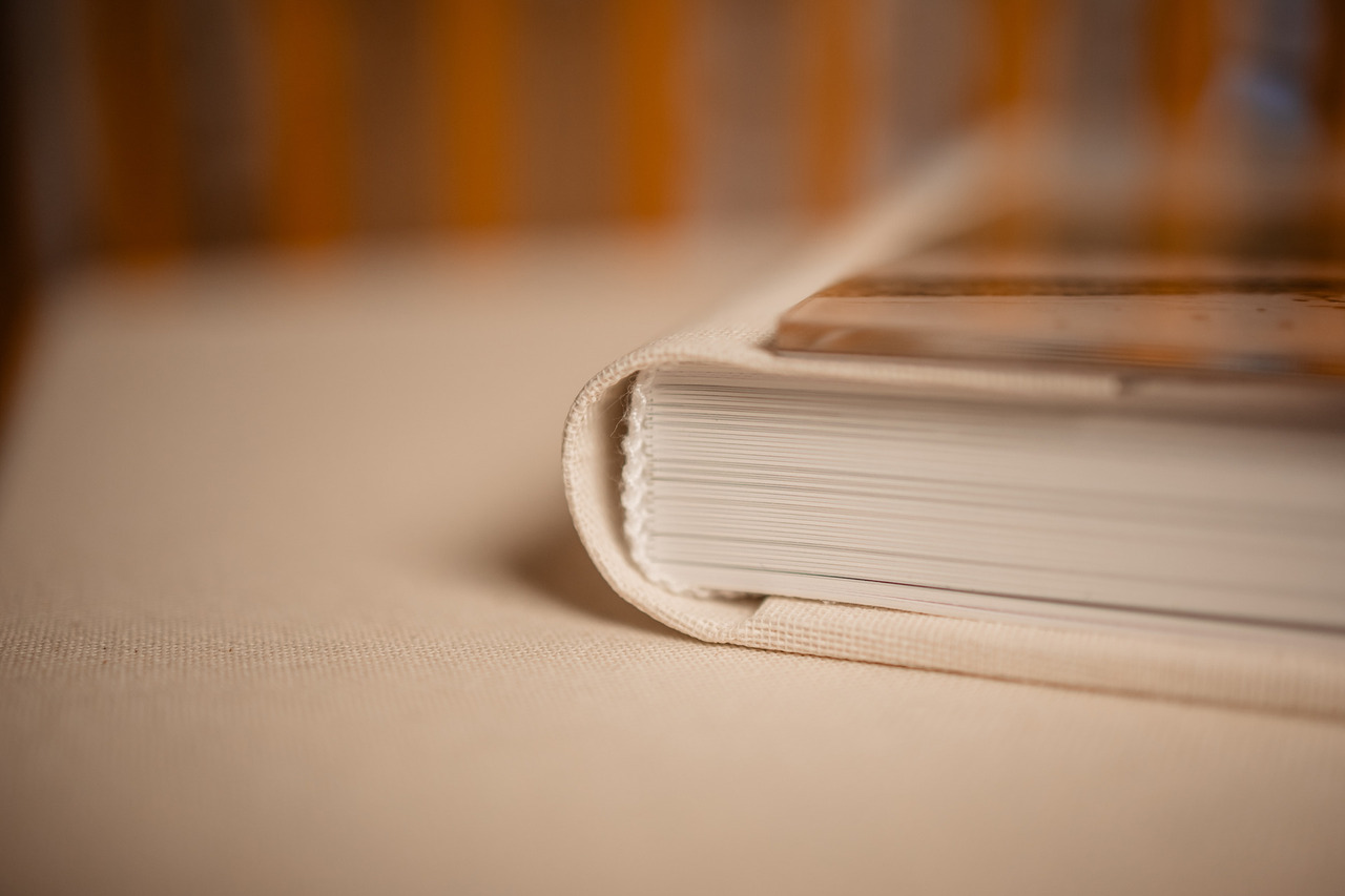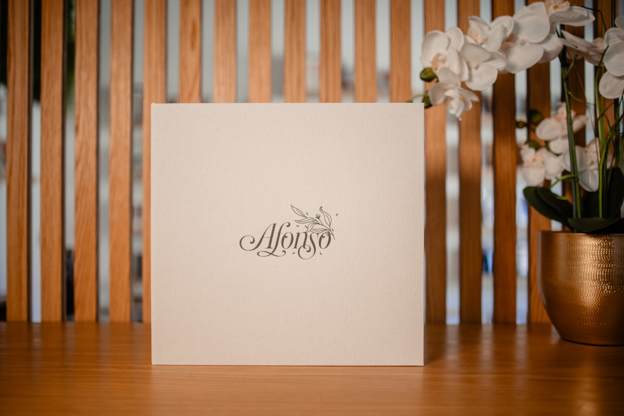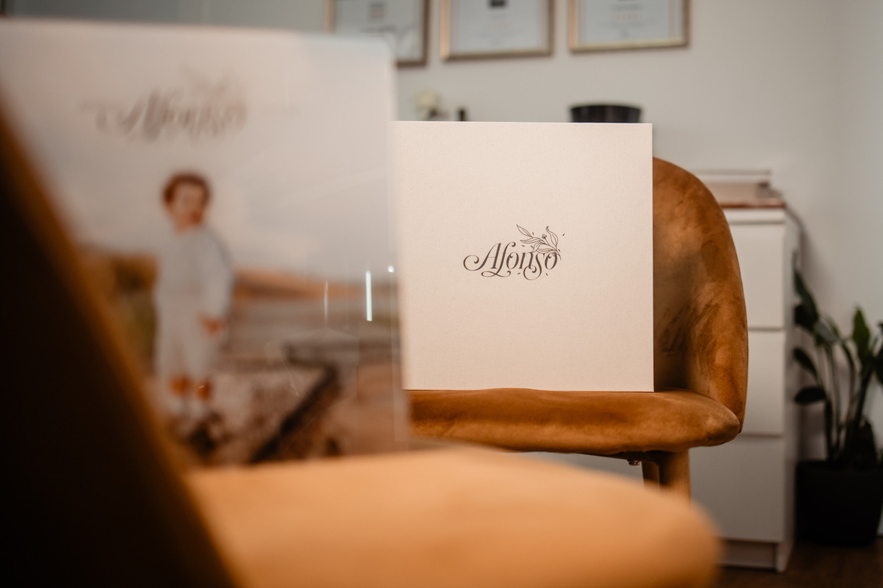 Álbum principal de tamanho 25x25, revestido no mesmo tecido da caixa e capa em acrílico com foto e monograma do batismo.