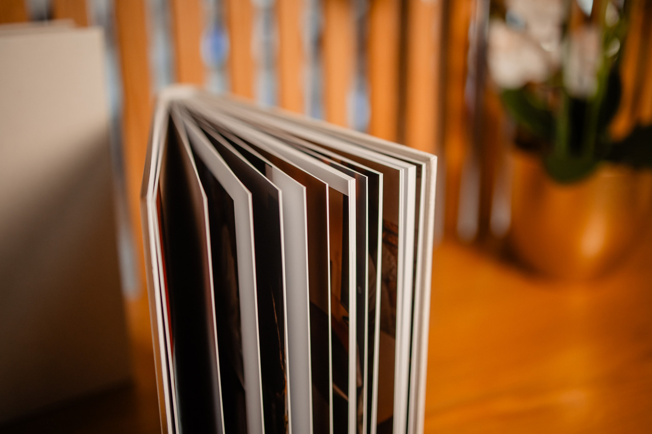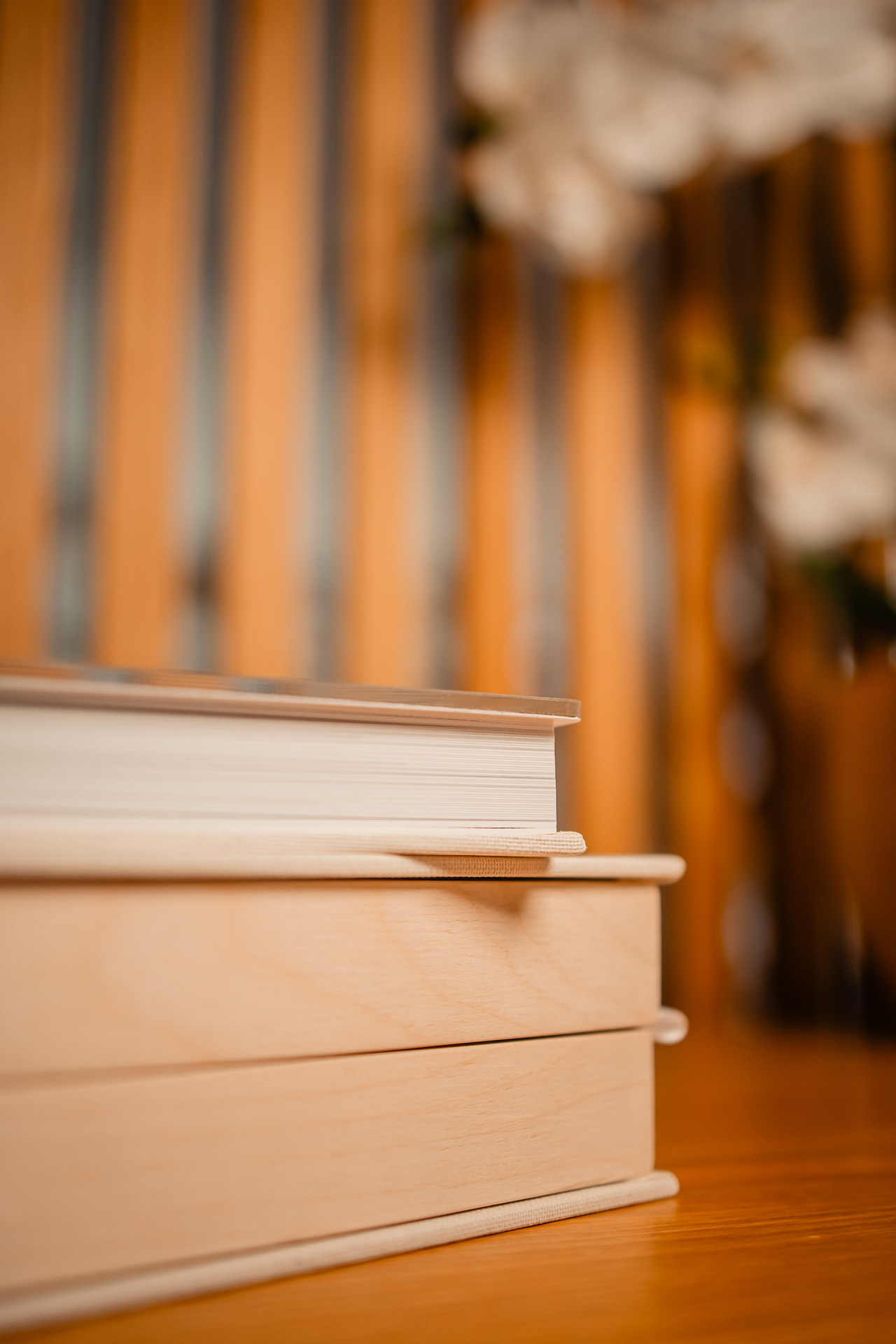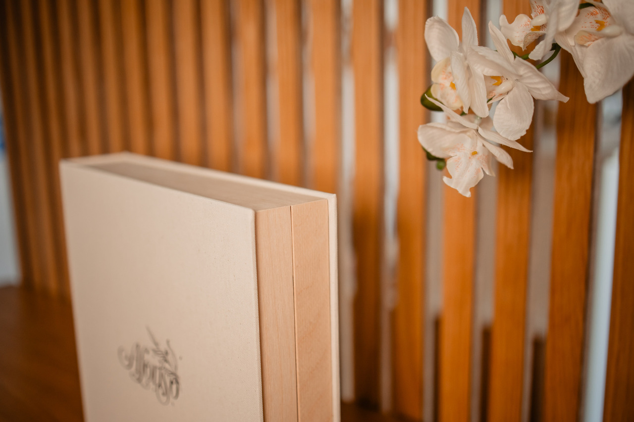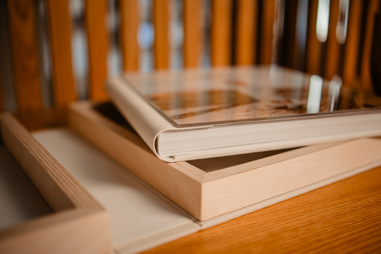 Álbum principal de tamanho 25x25, revestido no mesmo tecido da caixa e capa em acrílico com foto e monograma do batismo.