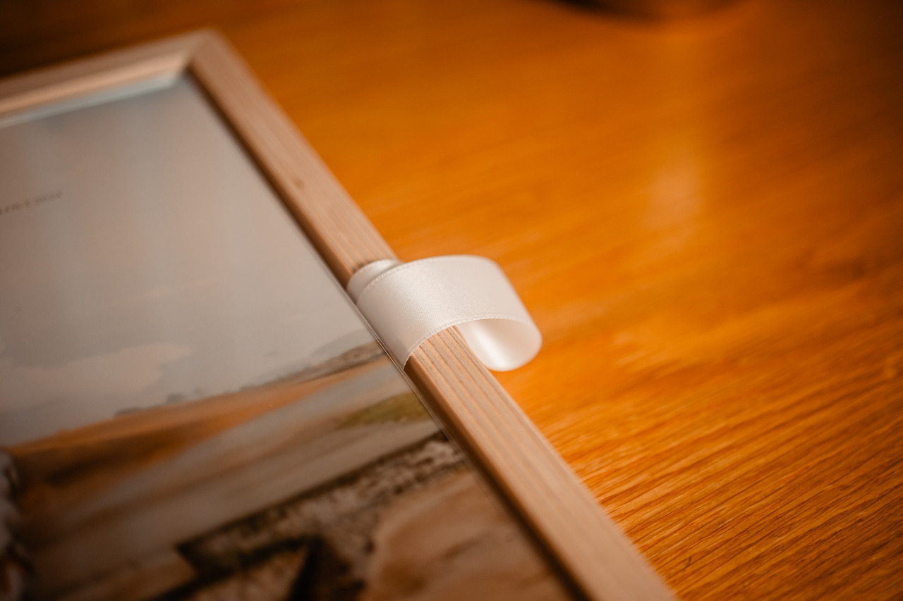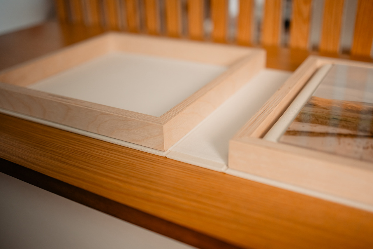 Caixa expositora revestida em tecido Buckram natural na cor pure. Aro em madeira na cor natural clara. Interior em veludo branco e fita branca.