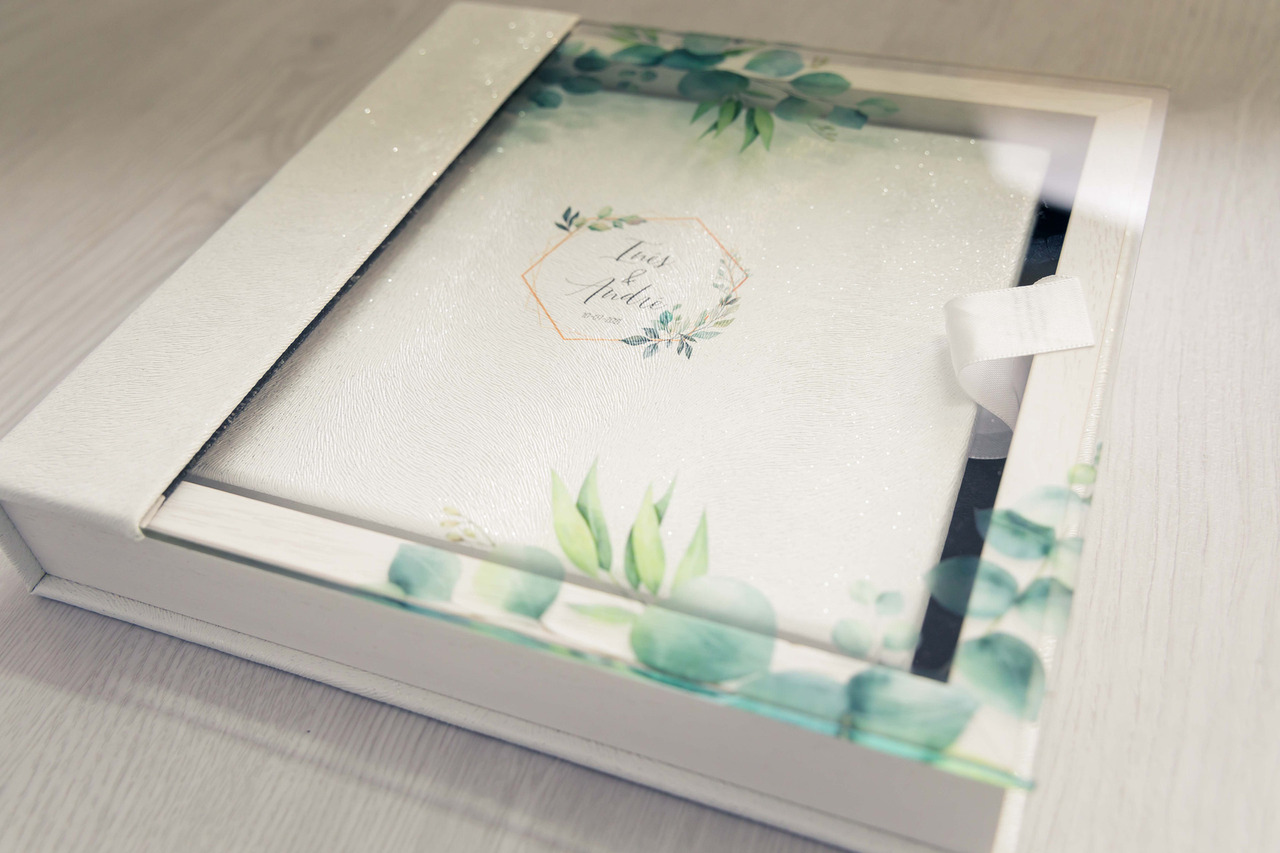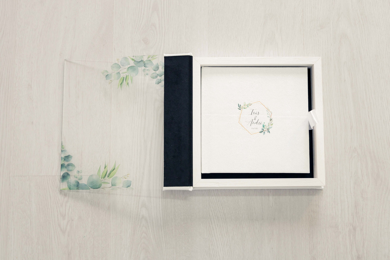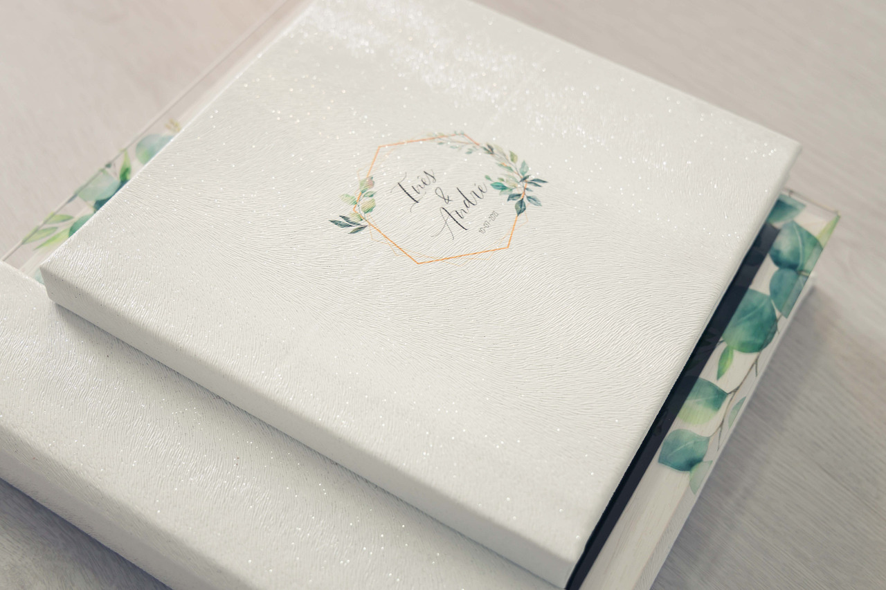 Um álbum no tamanho 20x20 com 12 póster e acompanhado por uma caixa, tudo personalizado a gosto dos noivos.