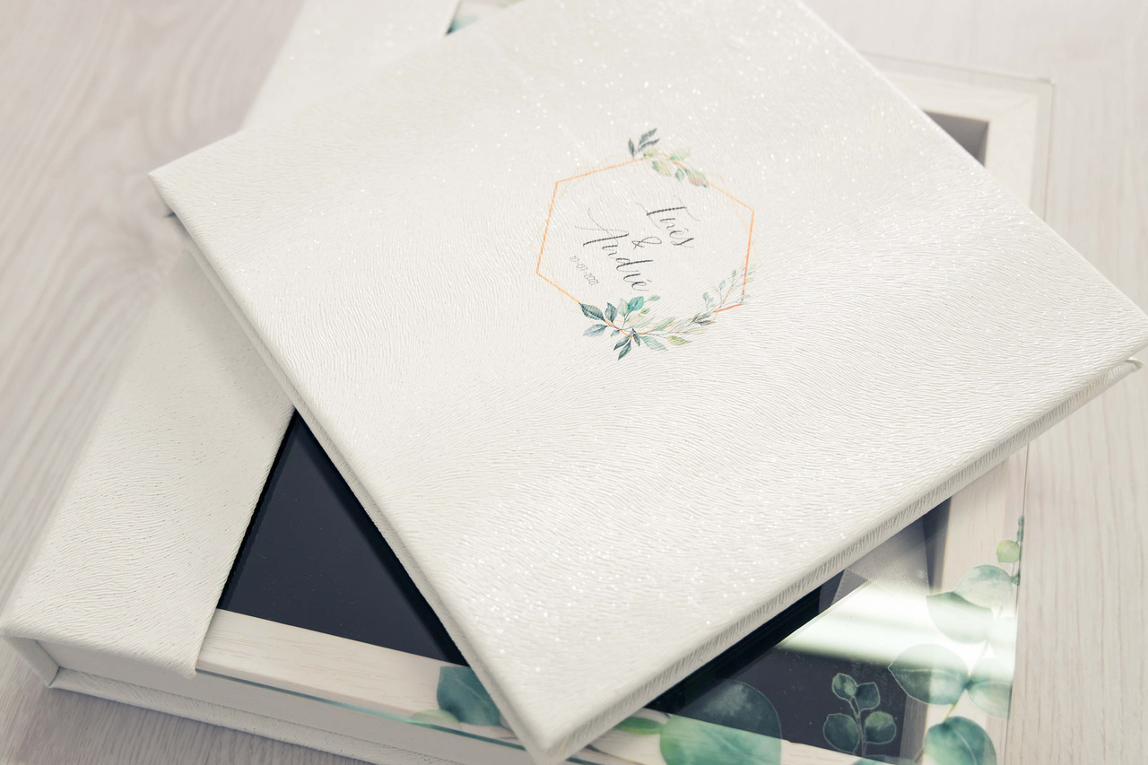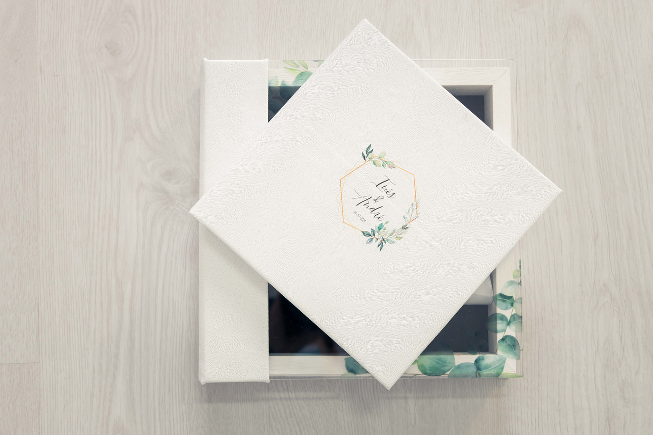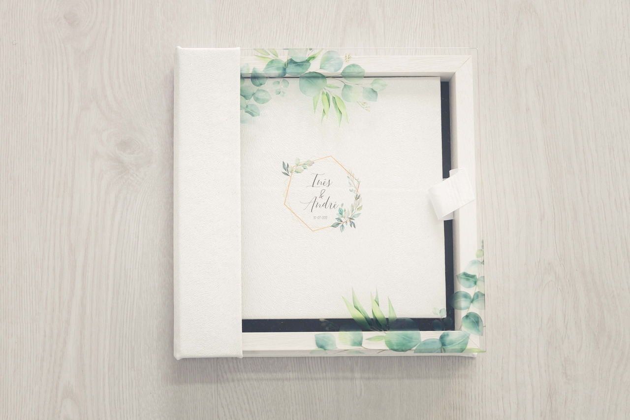Um álbum no tamanho 20x20 com 12 póster e acompanhado por uma caixa, tudo personalizado a gosto dos noivos.