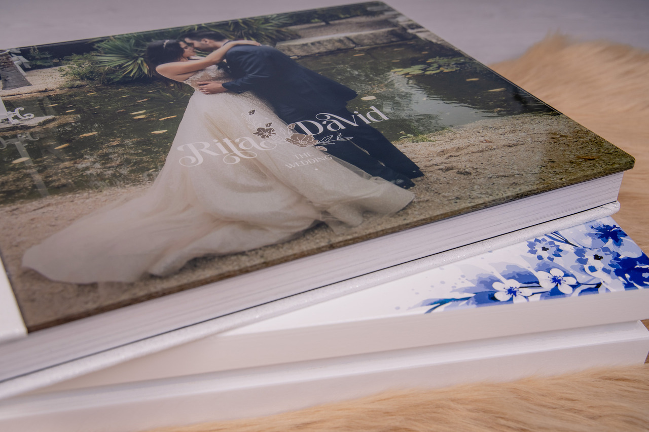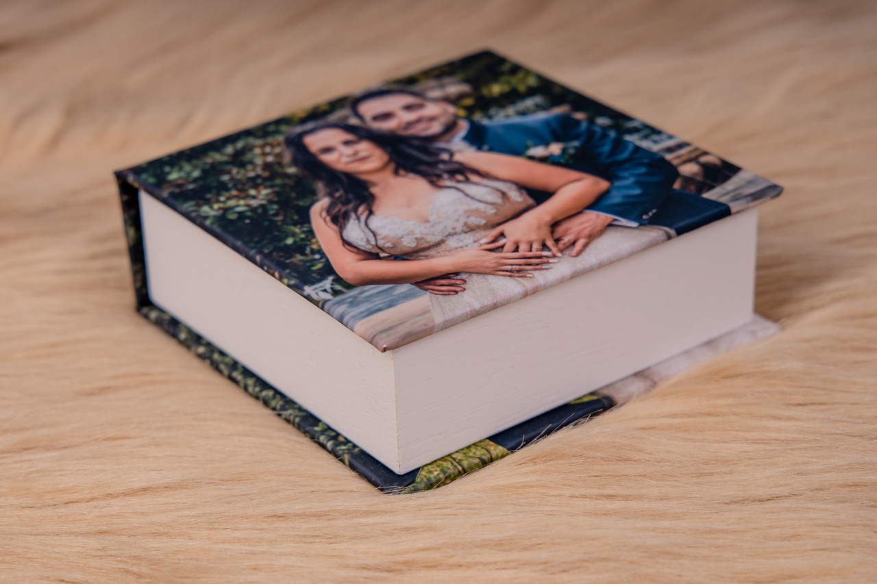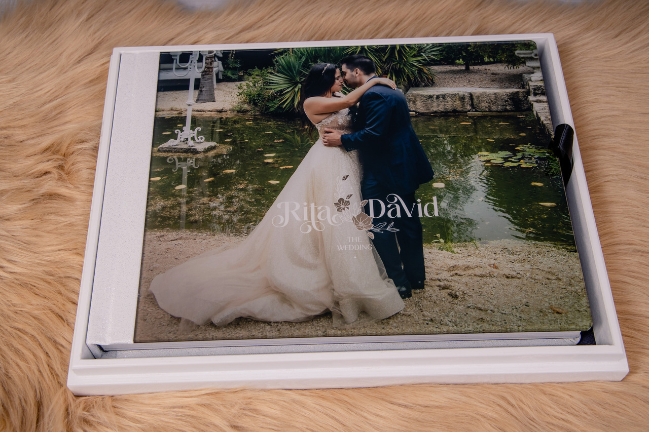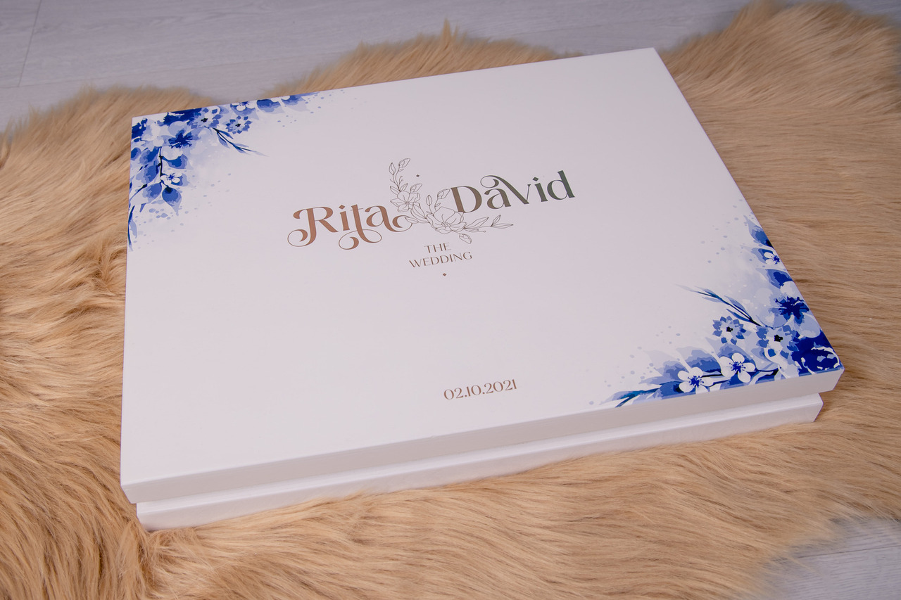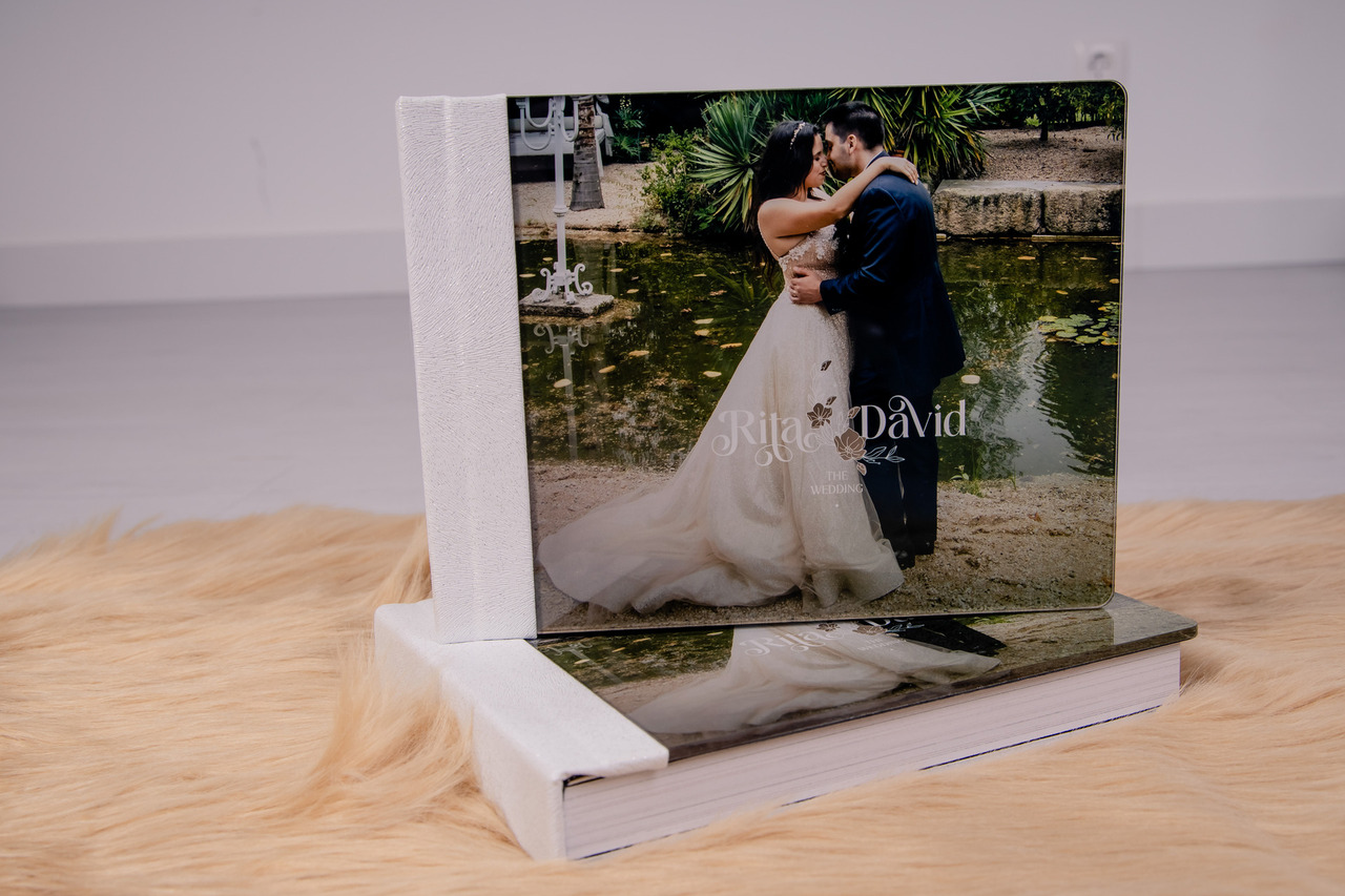 Caixa para álbum em madeira branca com gravação acuity de monograma criado em exclusivo para os noivos.