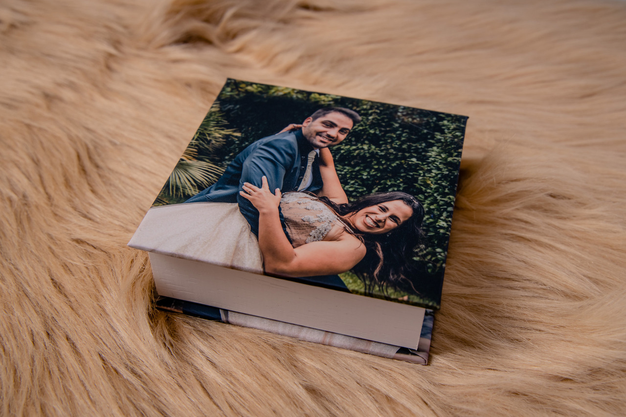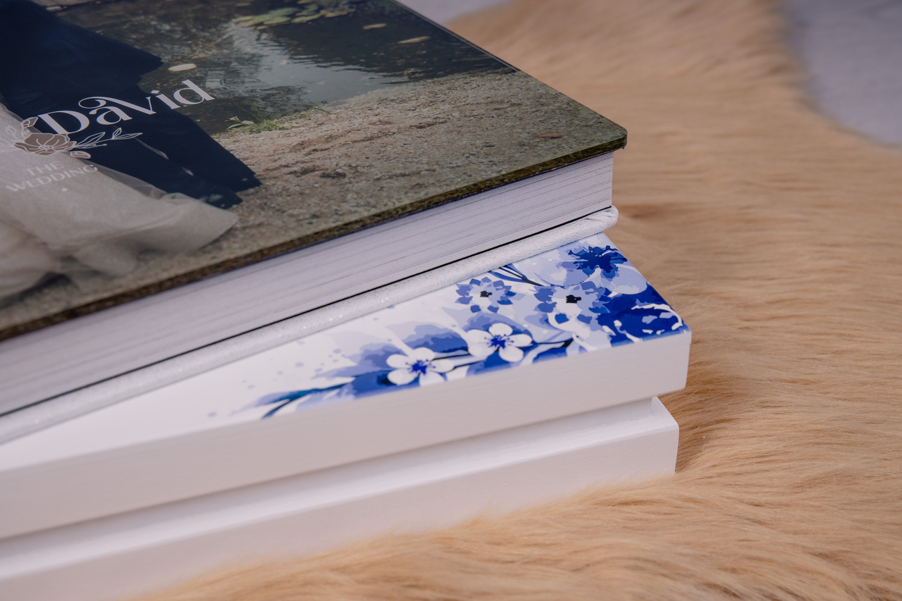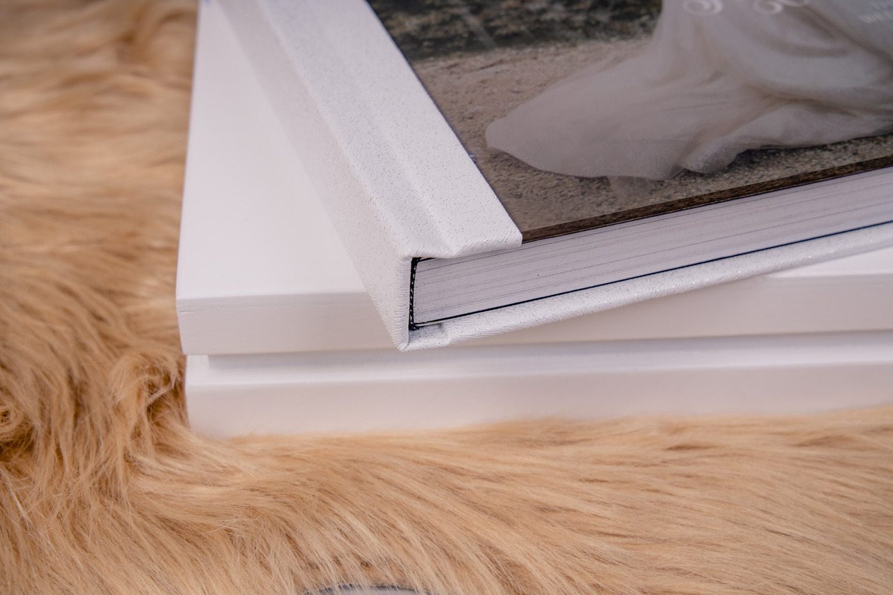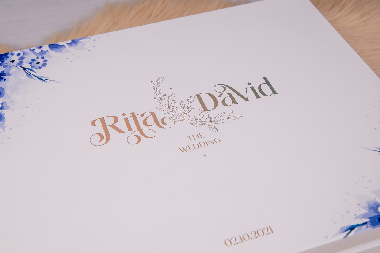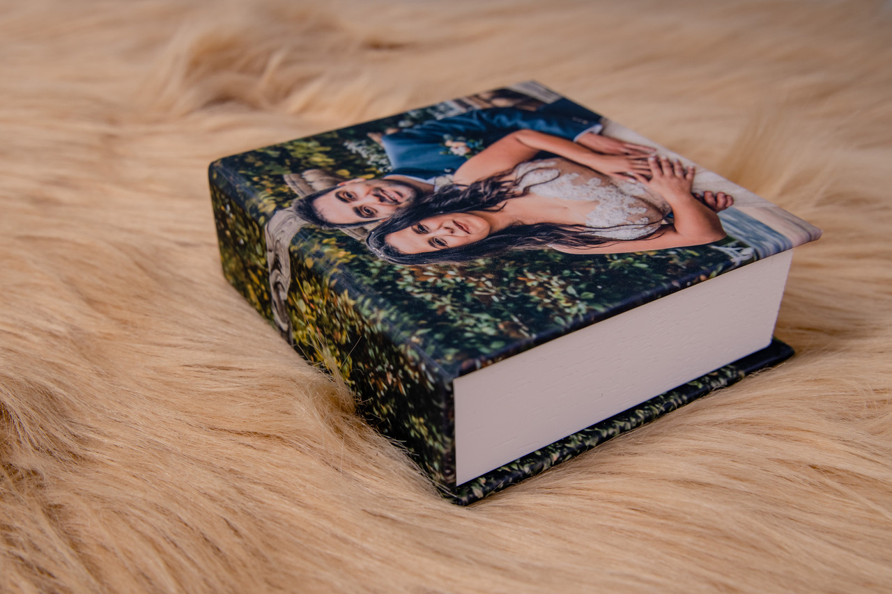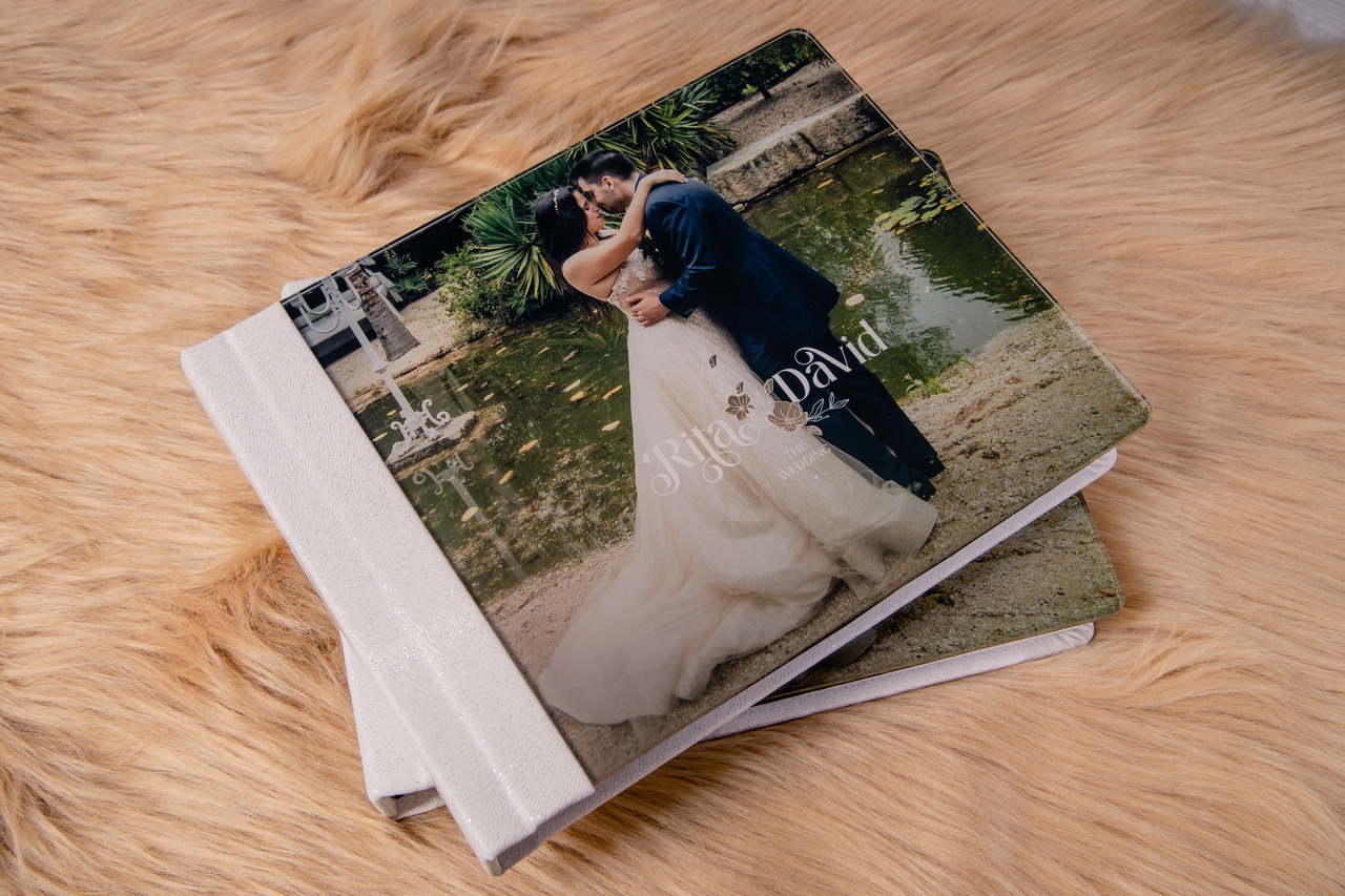 Caixa para álbum em madeira branca com gravação acuity de monograma criado em exclusivo para os noivos.