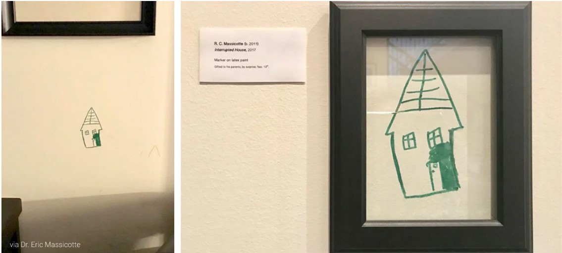 Pode enquadrar o desenho como uma autêntica obra de arte ao pendurar uma moldura sobre o desenho, como se fosse uma criação artística digna de estar num museu.