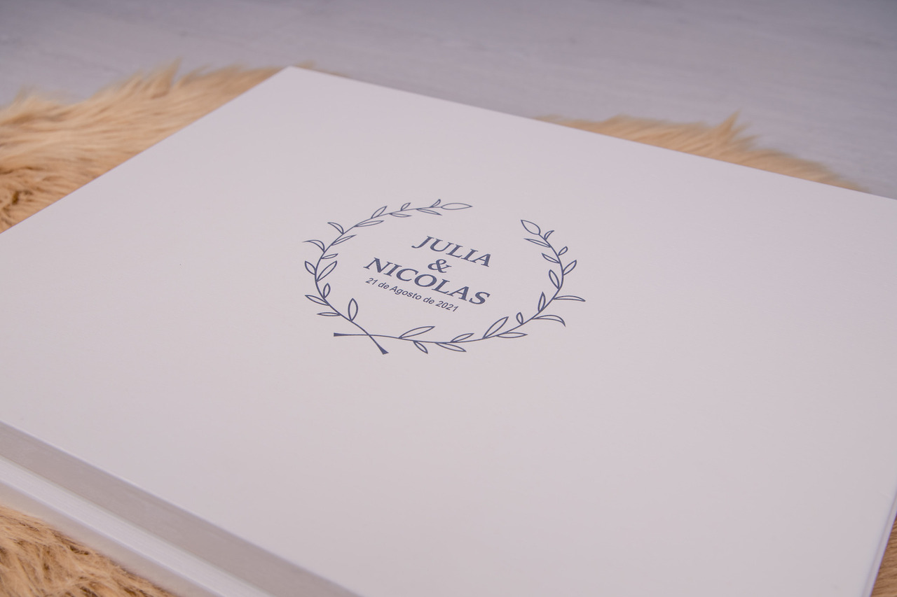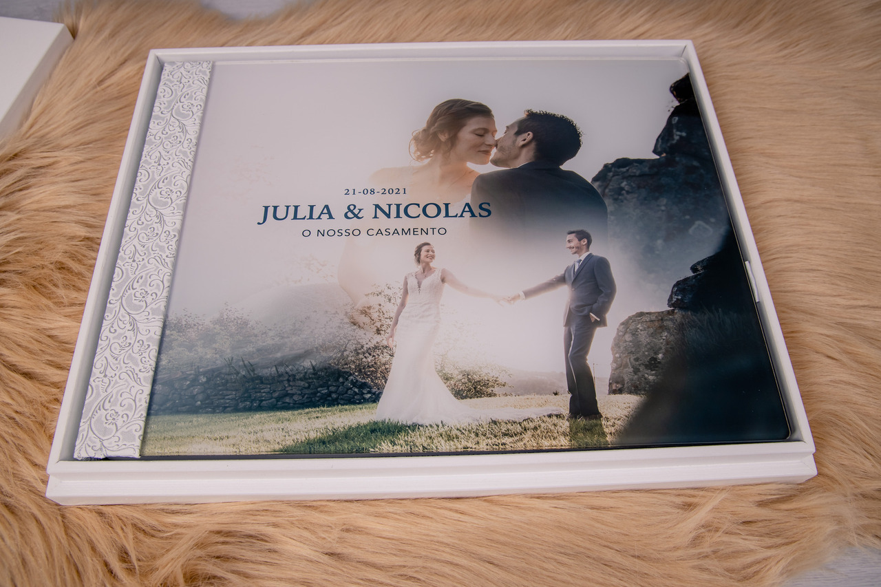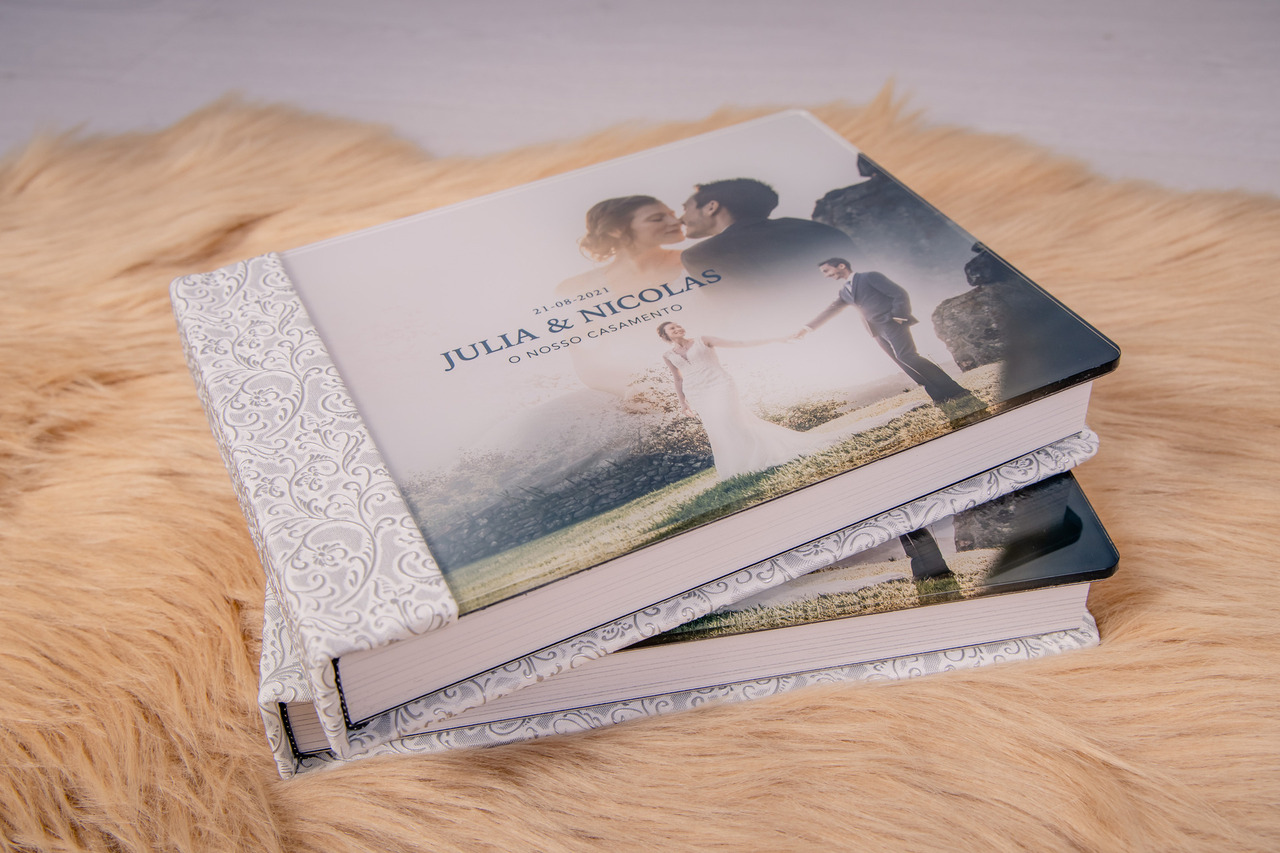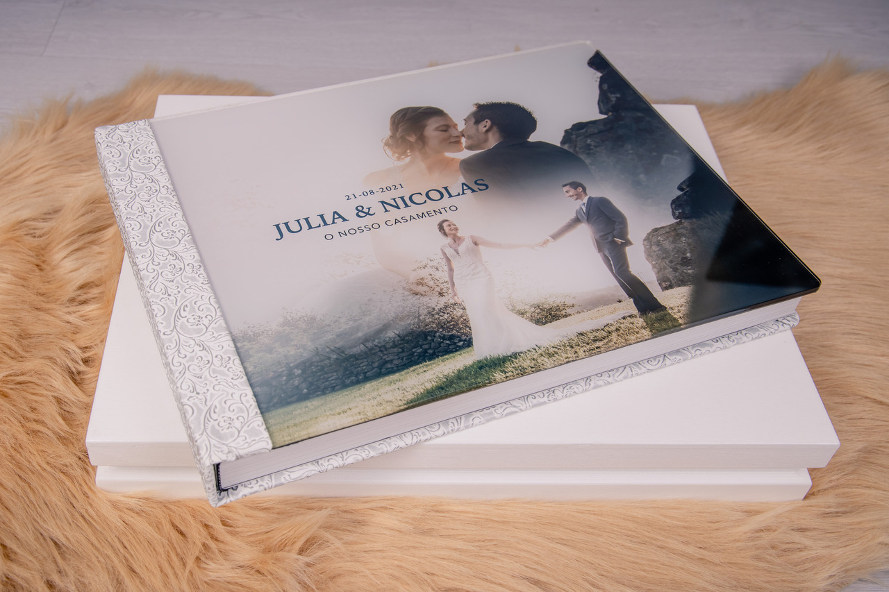 Álbum 30x40 fechado com capa com foto em acrílico, revestido a tecido polipele.