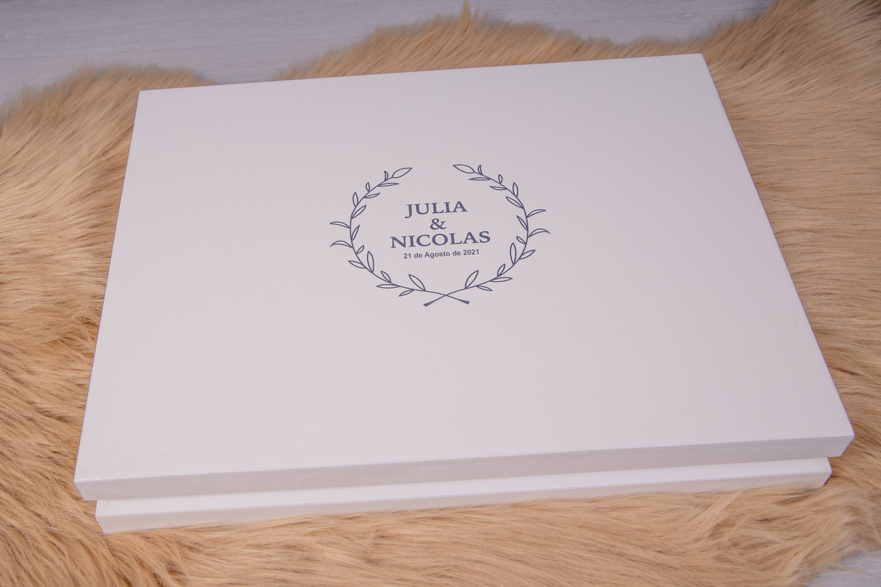 Caixa em madeira com gravação UC com monograma criado para os noivos.