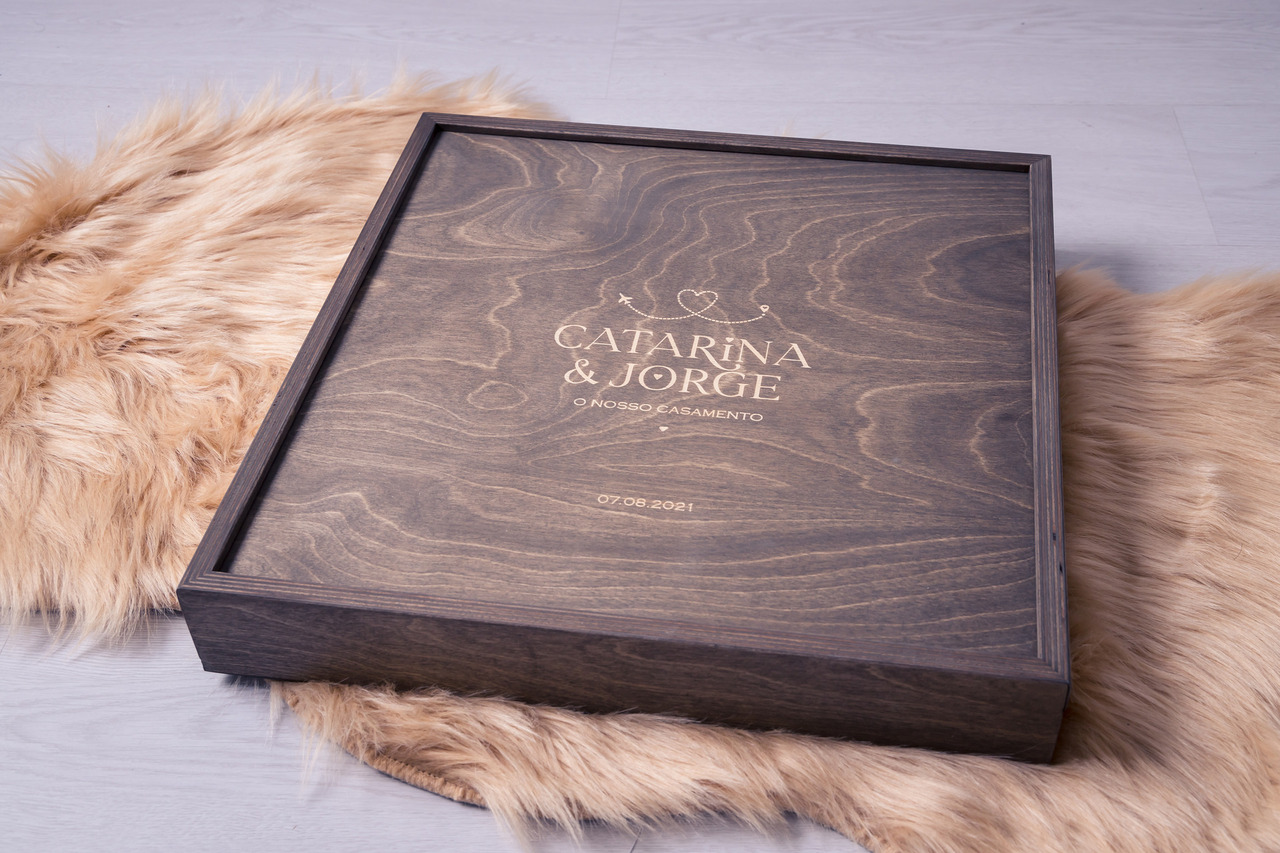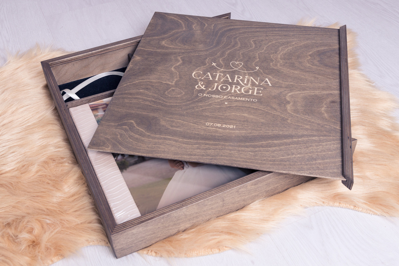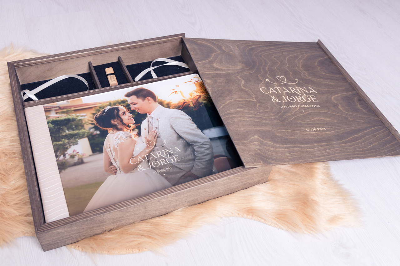 Caixa em madeira com monograma gravado a laser. Esta caixa é composta por um compartimento para o álbum, mas também um compartimento para a pen usb com o filme e dois compartimentos para colocar fotos.