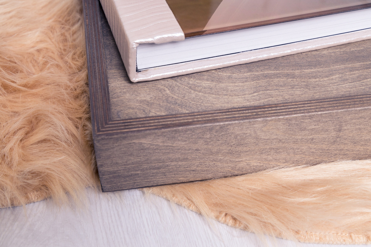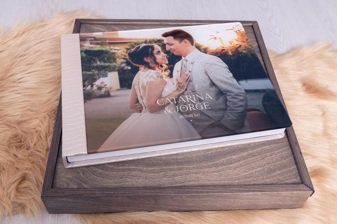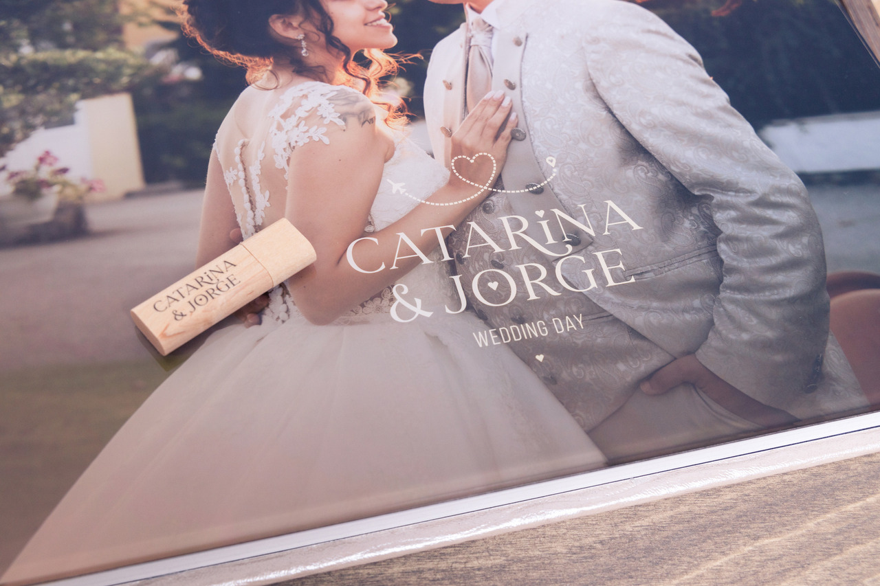 Caixa em madeira com monograma gravado a laser. Esta caixa é composta por um compartimento para o álbum, mas também um compartimento para a pen usb com o filme e dois compartimentos para colocar fotos.