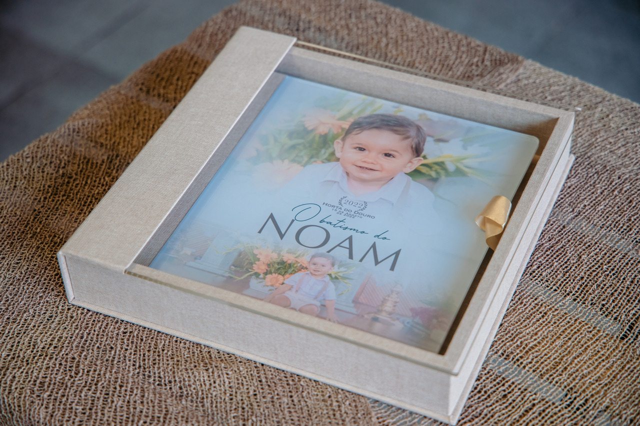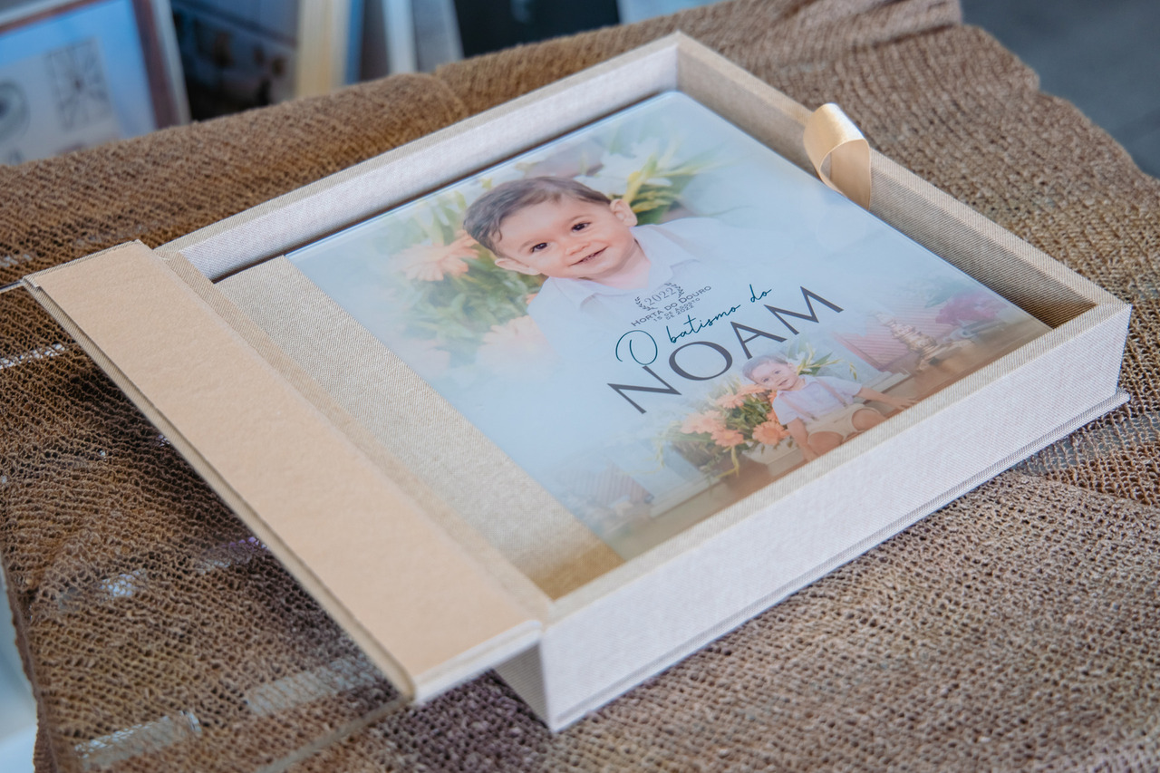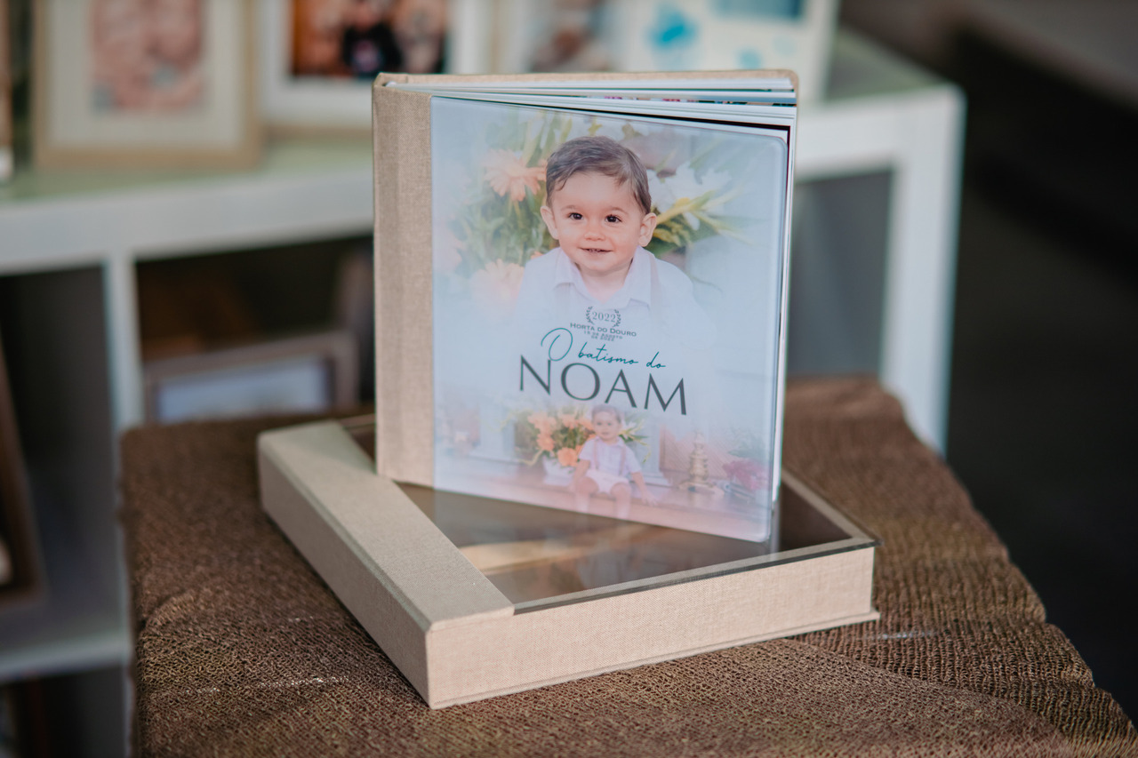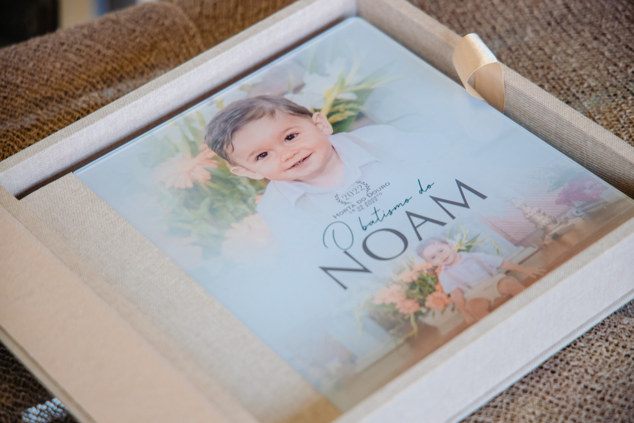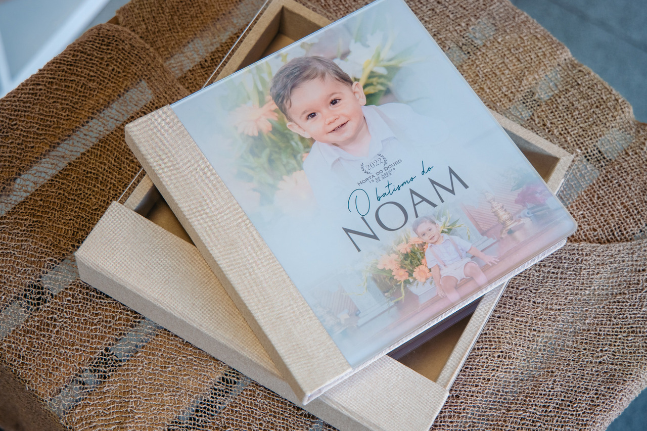 Álbum tamanho 25x25 modelo capa com foto em acrílico. A capa foi personalizado em especial para o Noam.