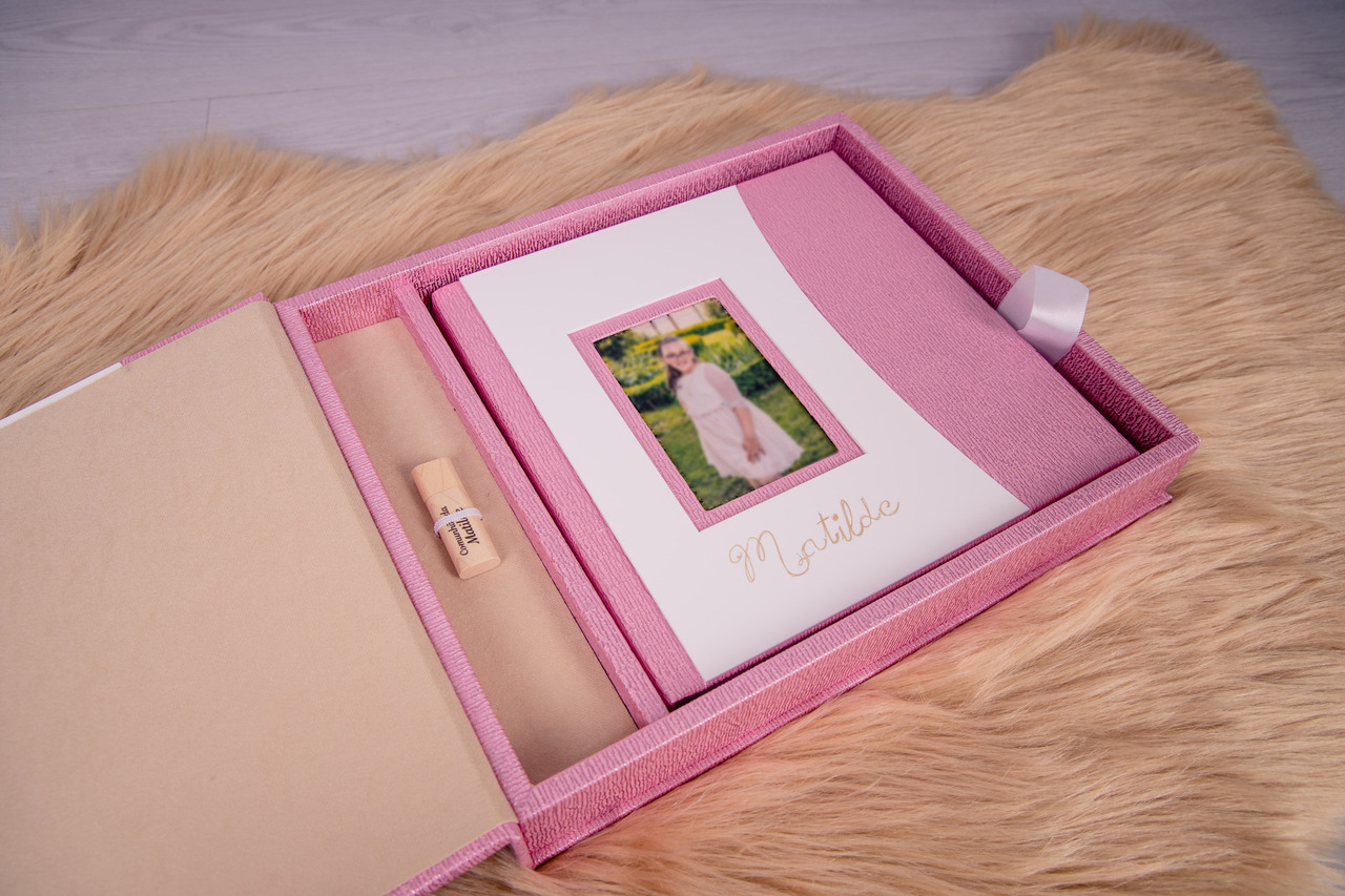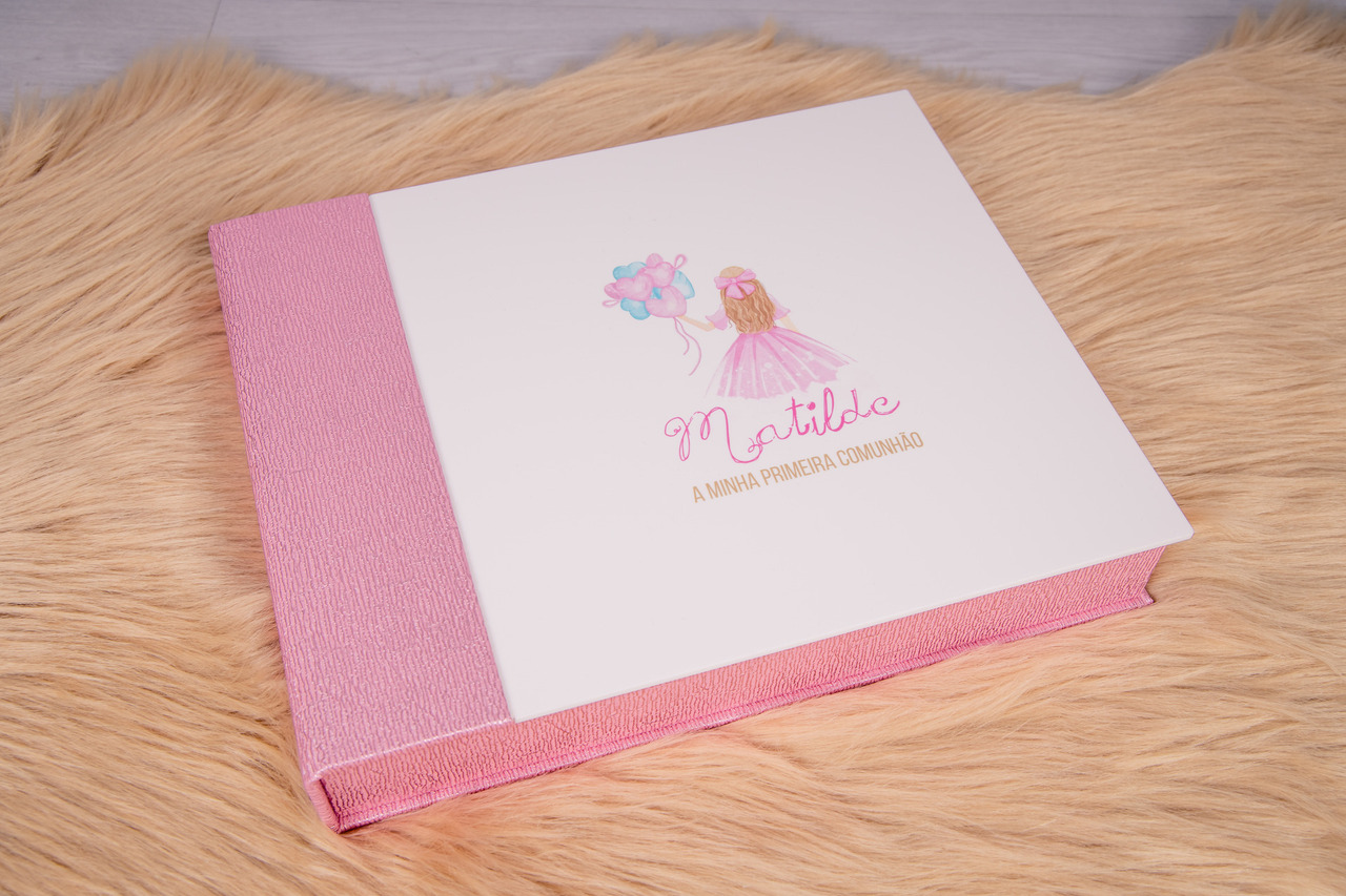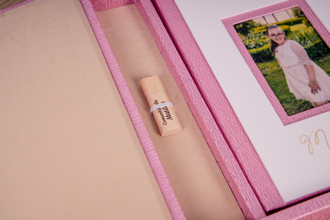 Conjunto de comunhão, composto por álbum 25x25 com 40 páginas, caixa personalizada e pen usb com as fotos do evento.