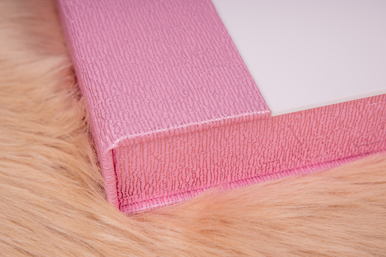 Álbum tamanho 25x25 revestido a tecido polipele premium e capa em acrílico com foto e gravação UV.