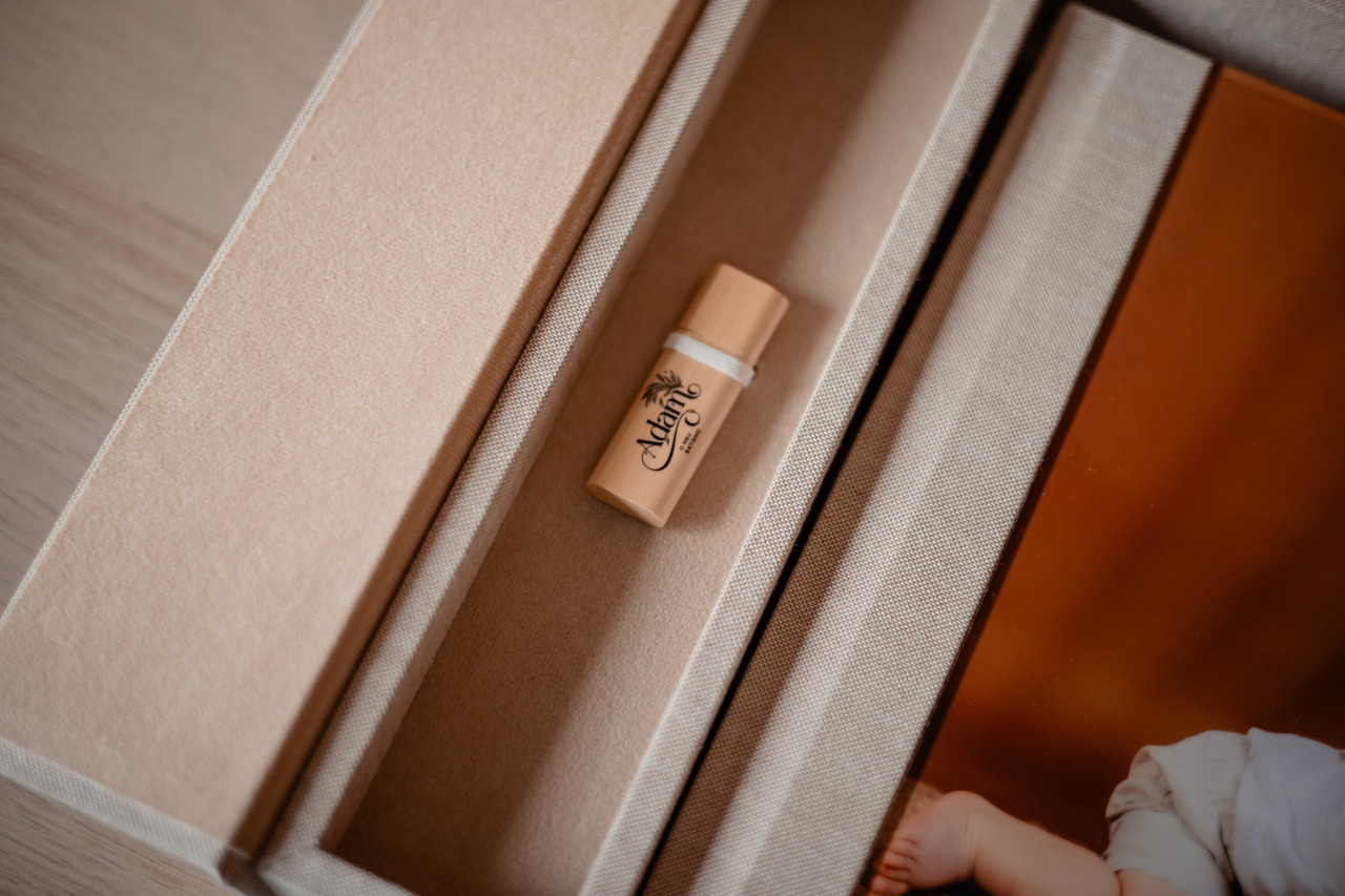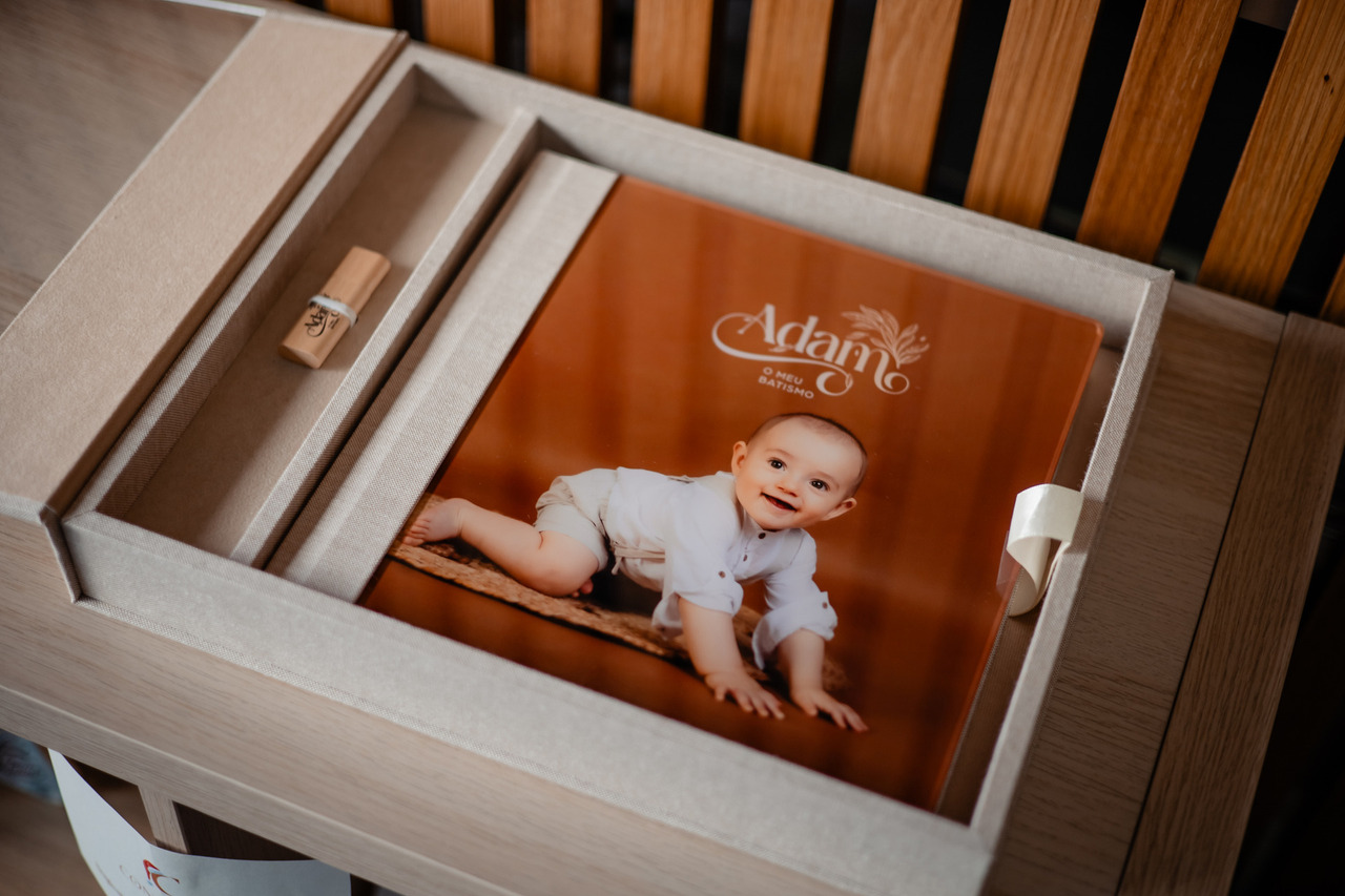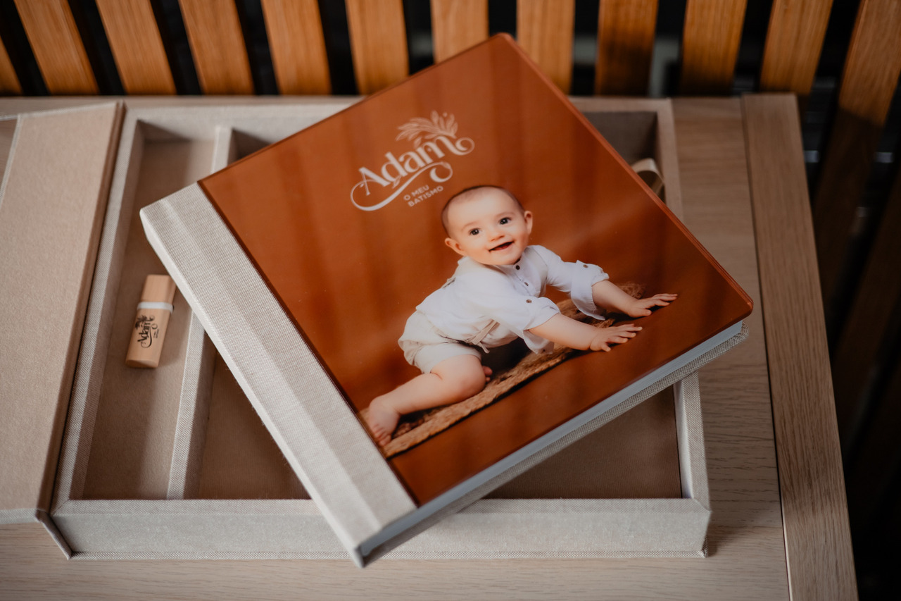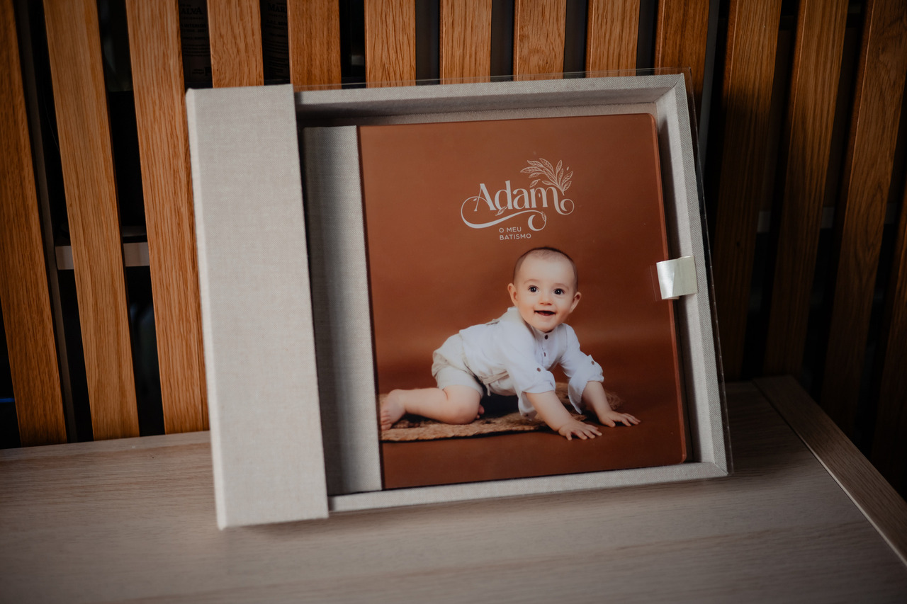 Álbum em tamanho 25x25 com capa em acrílico. Caixa expositora com tampo transparente e espaço para pen USB personalizada a laser. Revestido a PoliPele bege.