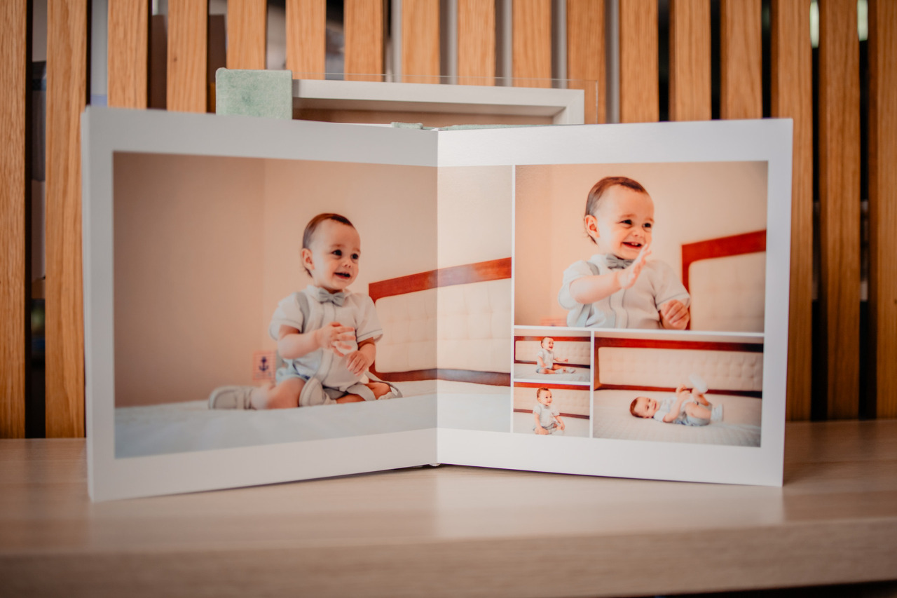 Álbum 25x25 com capa com foto em acrílico e revestido no mesmo tecido da caixa.