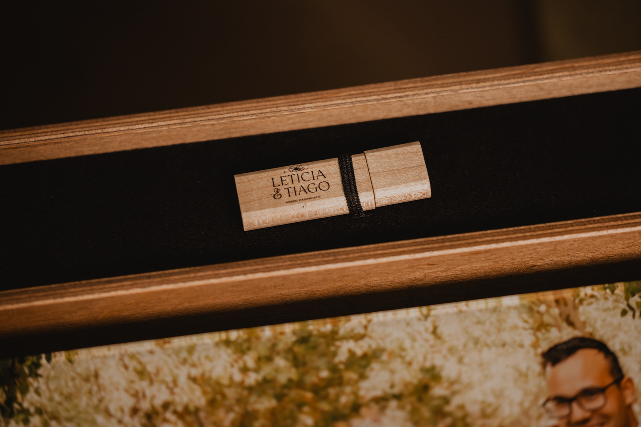 Caixa expositora em madeira de cor nogal. Gravação a laser no tampo da caixa com o monograma dos noivos. Interior forrado a veludo preto com fita preta. Compartimento no interior para pen usb.