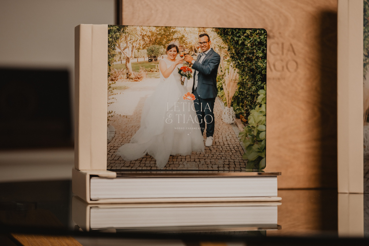 Álbum no tamanho 30x40, com foto em acrílico na capa, revestido com tecido premium bege na lombada e costas.
