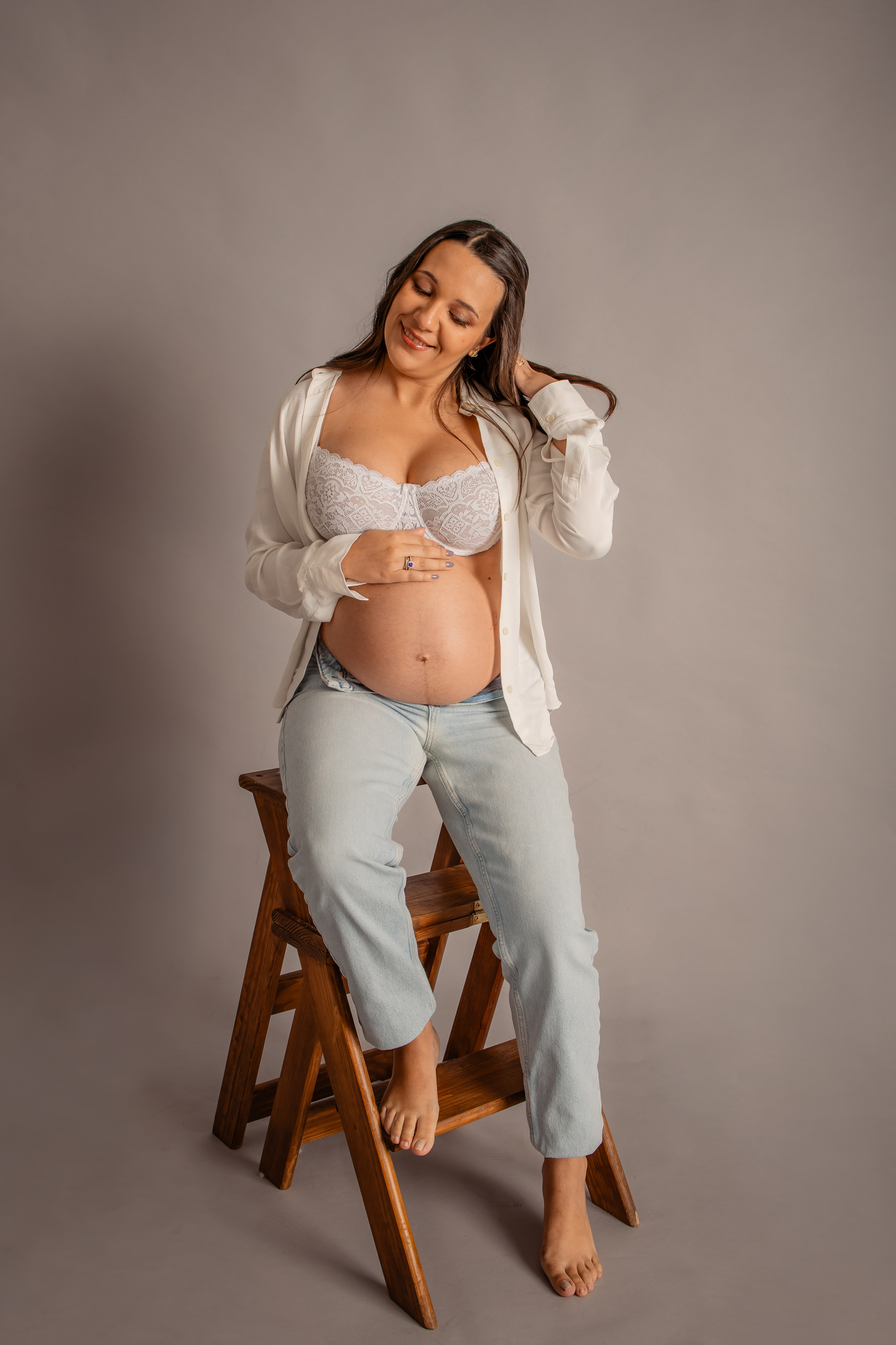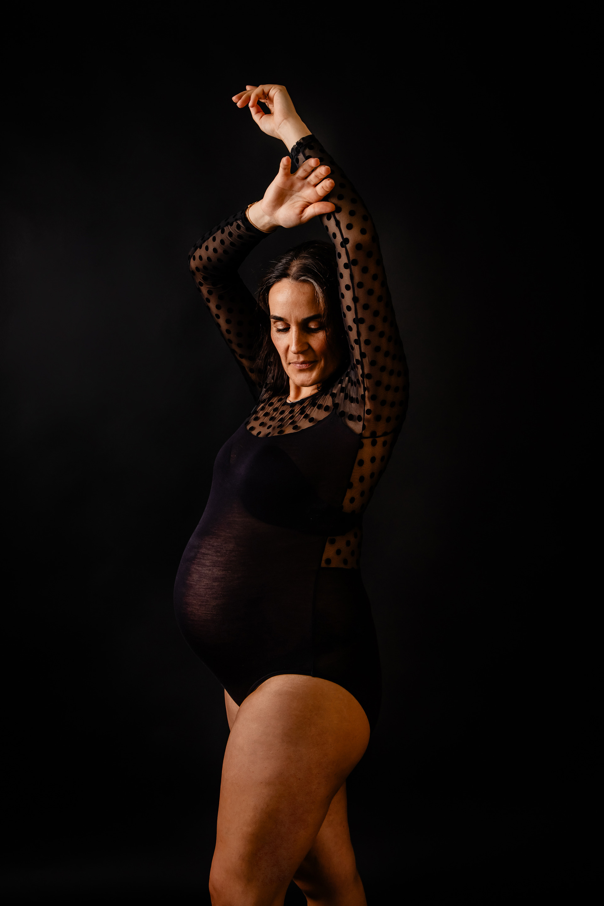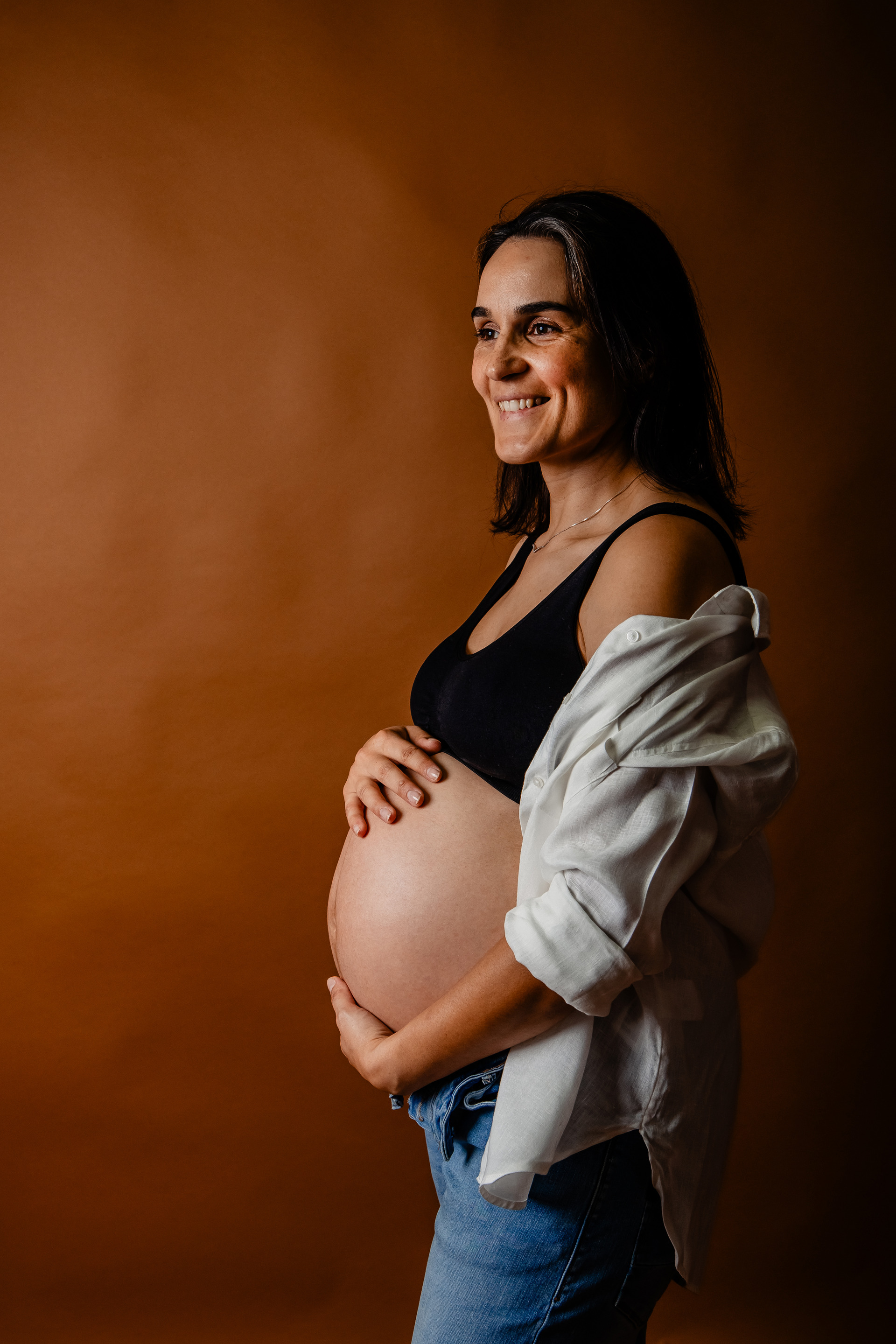 ⟡ Em estúdio: Com fundo preto ou branco, destacando a simplicidade e a beleza da gestação, numa abordagem elegante e intemporal.