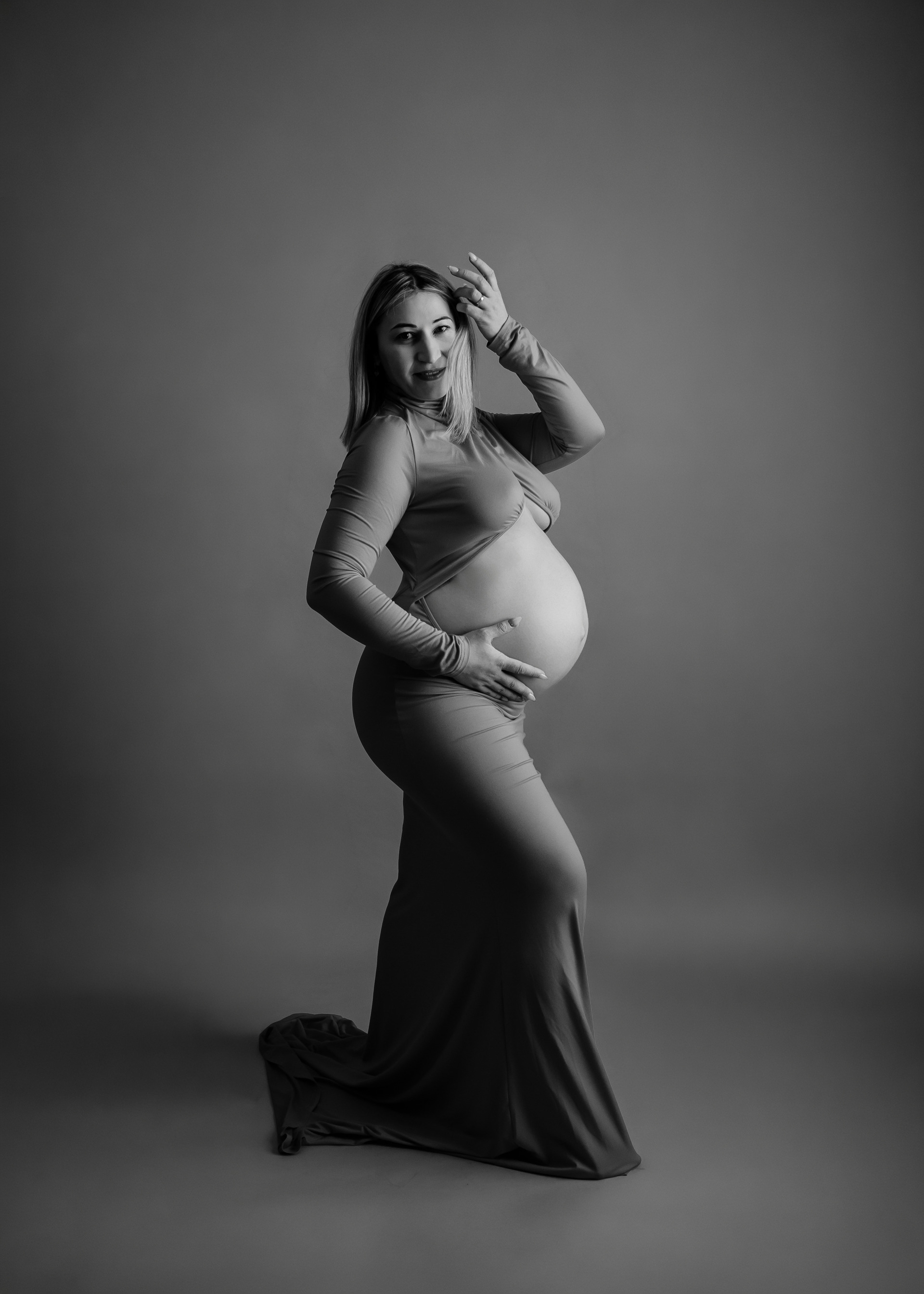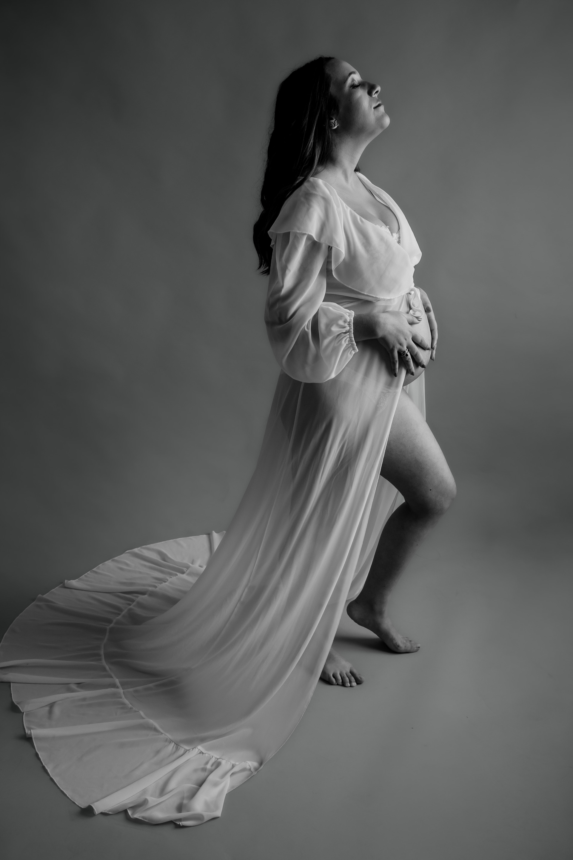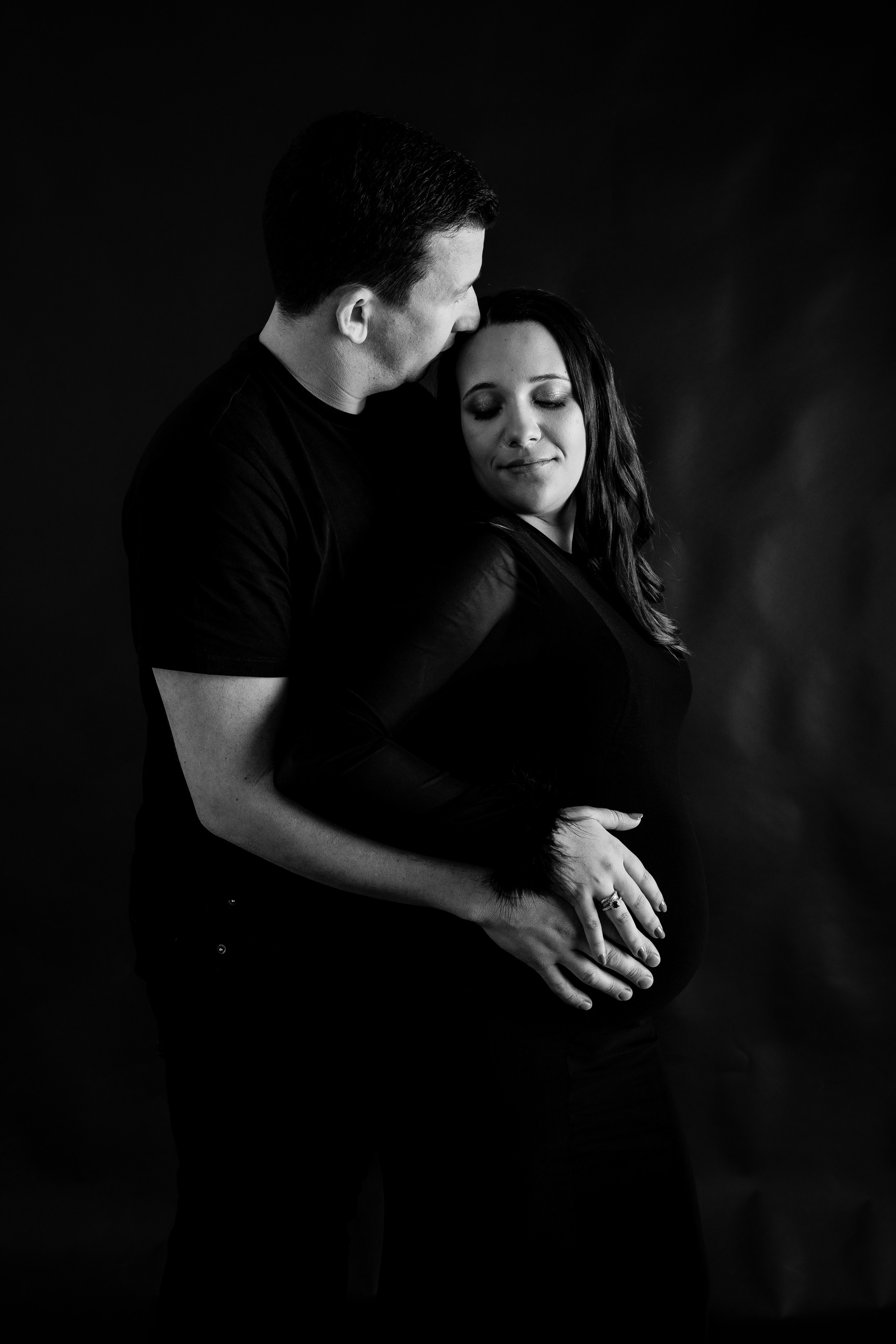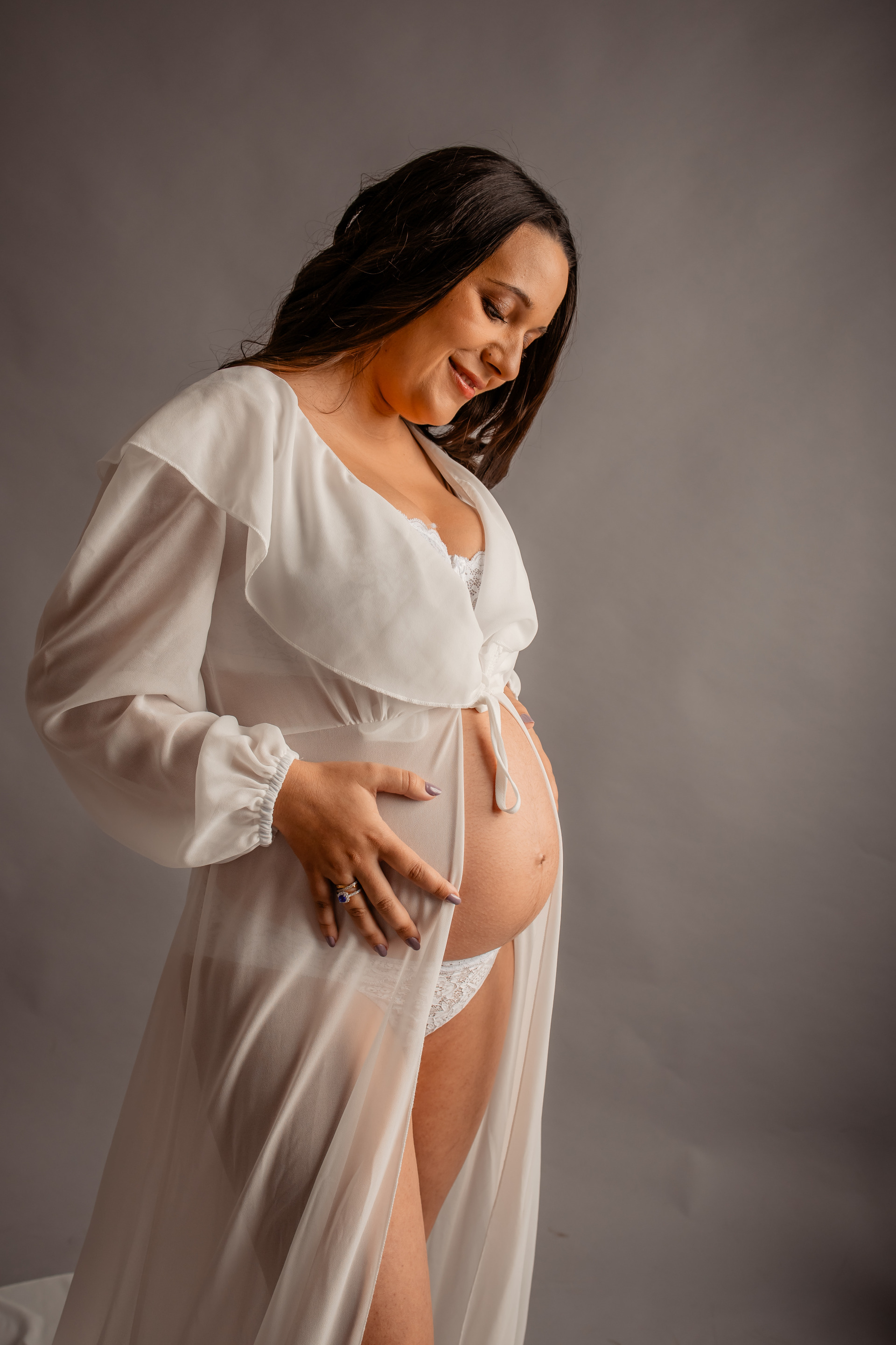 ⟡ Em estúdio: Com fundo preto ou branco, destacando a simplicidade e a beleza da gestação, numa abordagem elegante e intemporal.
